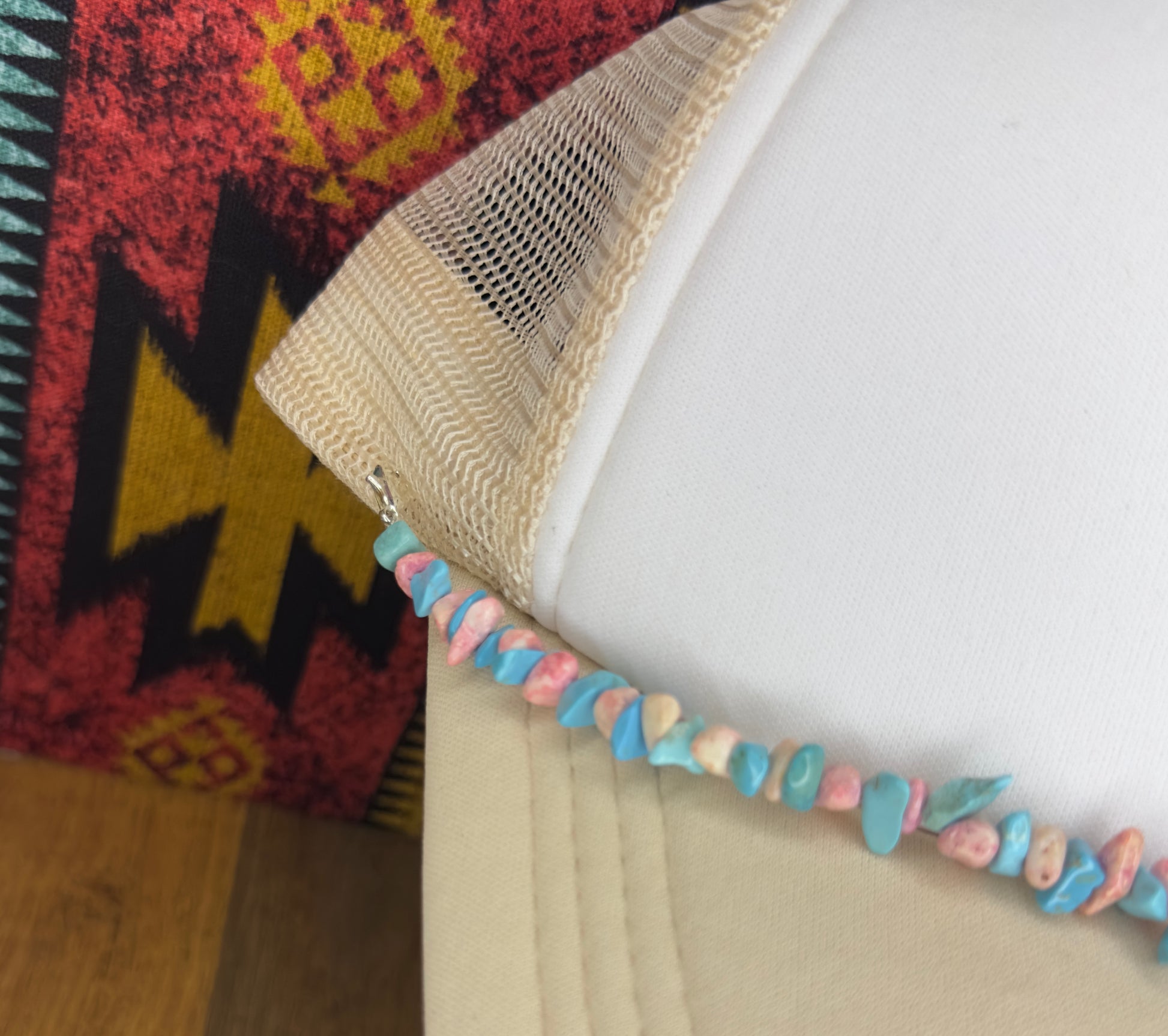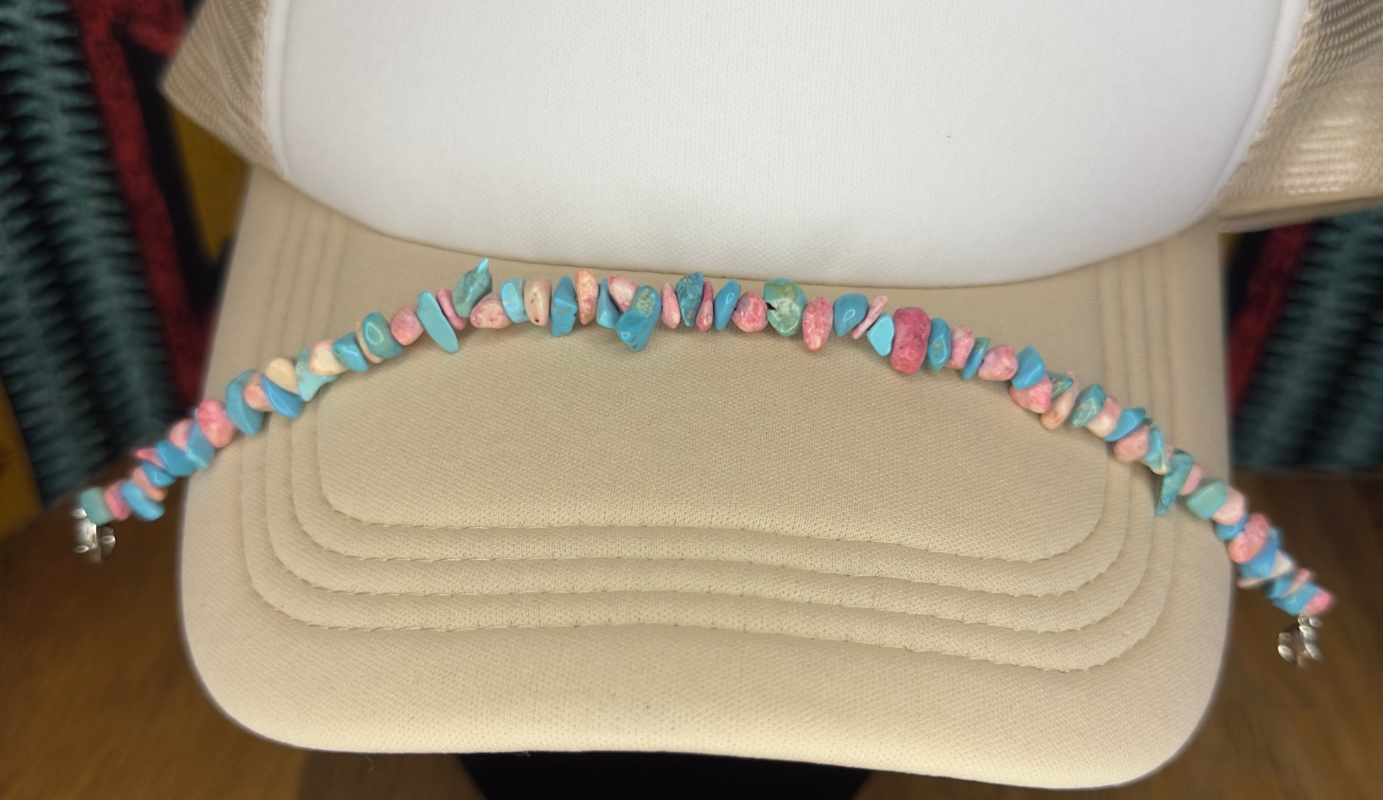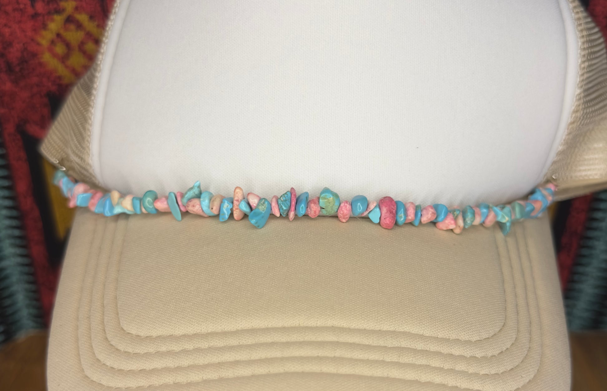Add a touch of desert romance to your favorite trucker hat with the Blush Canyon Hat Band. Hand-strung with soft pink stone chips and vibrant turquoise accents, this piece brings a fresh, feminine edge to classic western wear. Whether you’re chasing sunsets or just running to town, this band is your go-to for effortless cowgirl style.