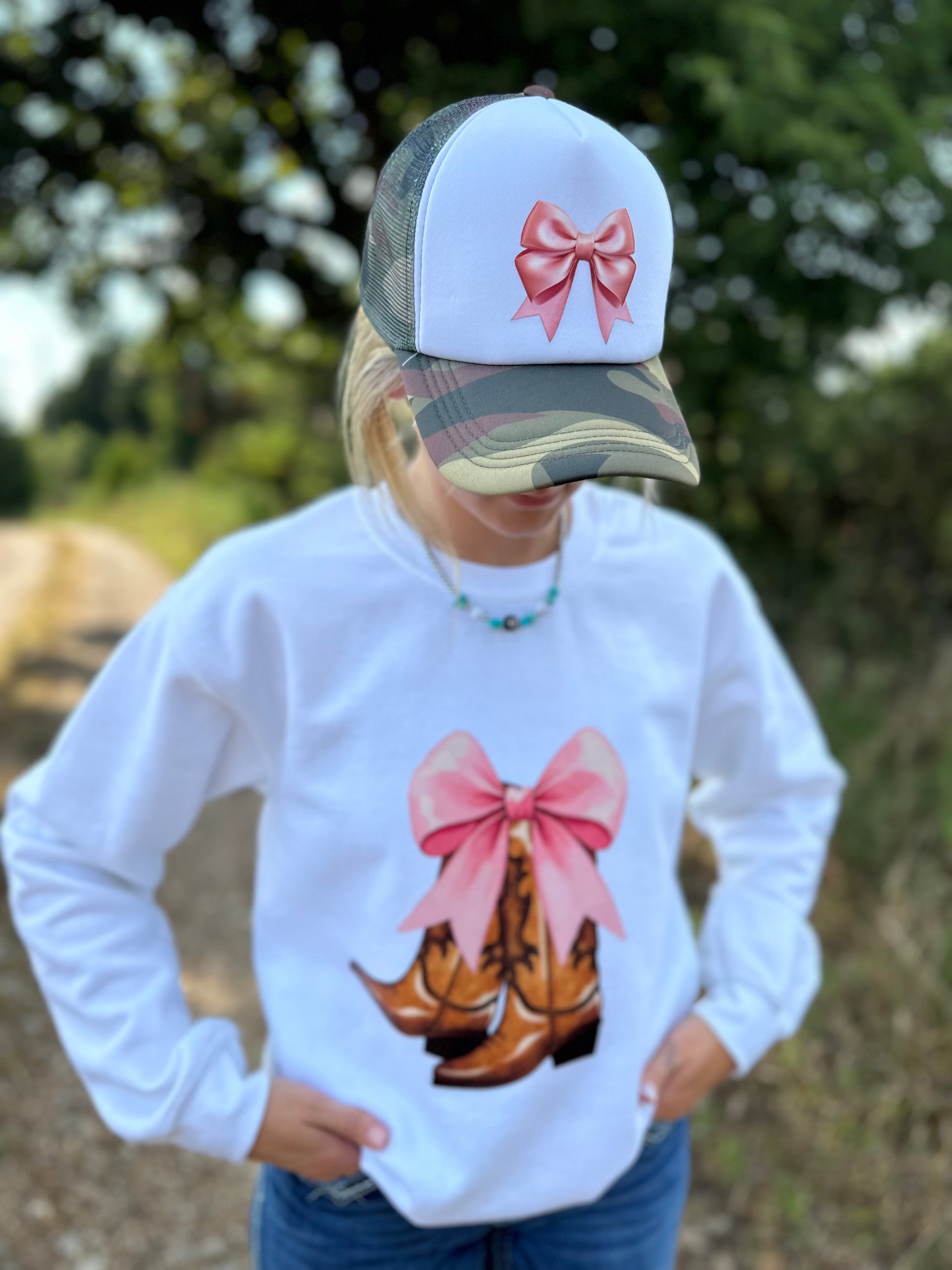 Turn heads with a little country sass in our Bow’d Up camo trucker hat. This western-inspired cap blends rugged style with a girly twist, featuring a bold camo print topped with a sweet pink bow right in the center. The DTF transfer design pops against the earthy tones, making it the perfect statement for hunting season, rodeo nights, or casual days out.