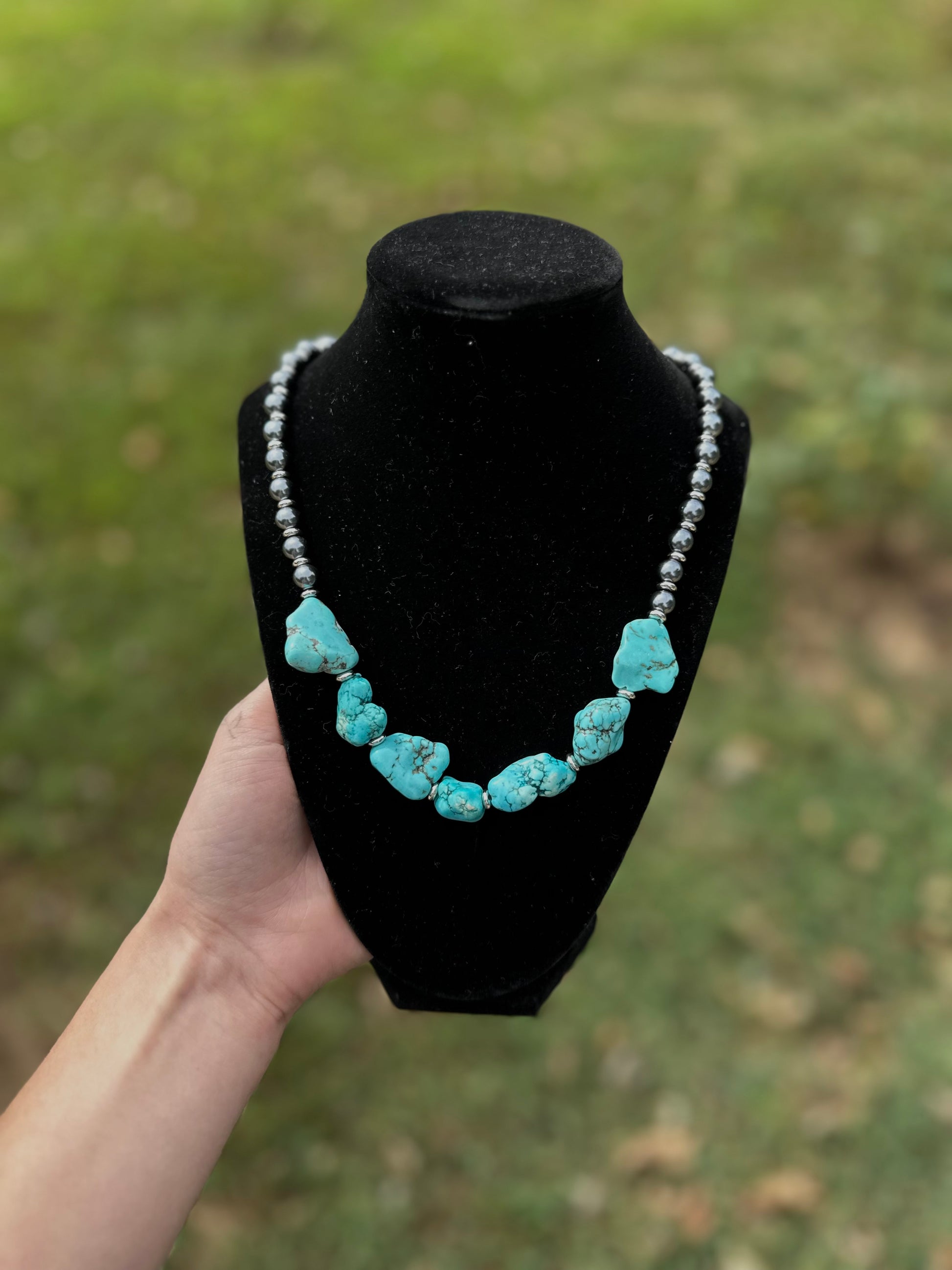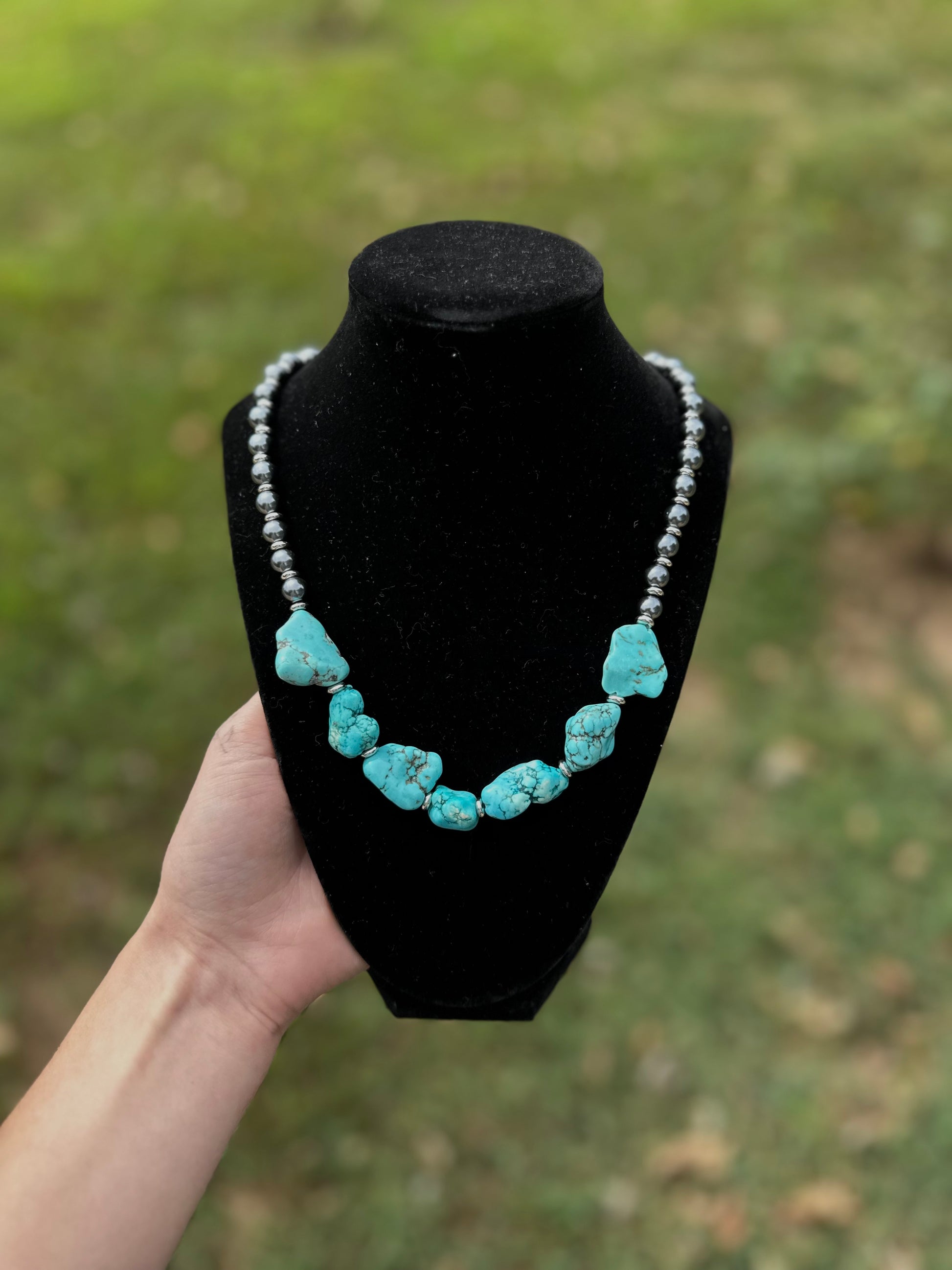 Capture the essence of the desert with the Cactus Bloom Necklace. Featuring dark silver beads that cascade into bold, vibrant turquoise stones, this necklace makes a statement while staying effortlessly stylish. Perfect for layering or wearing alone to add a touch of southwestern charm to any outfit.