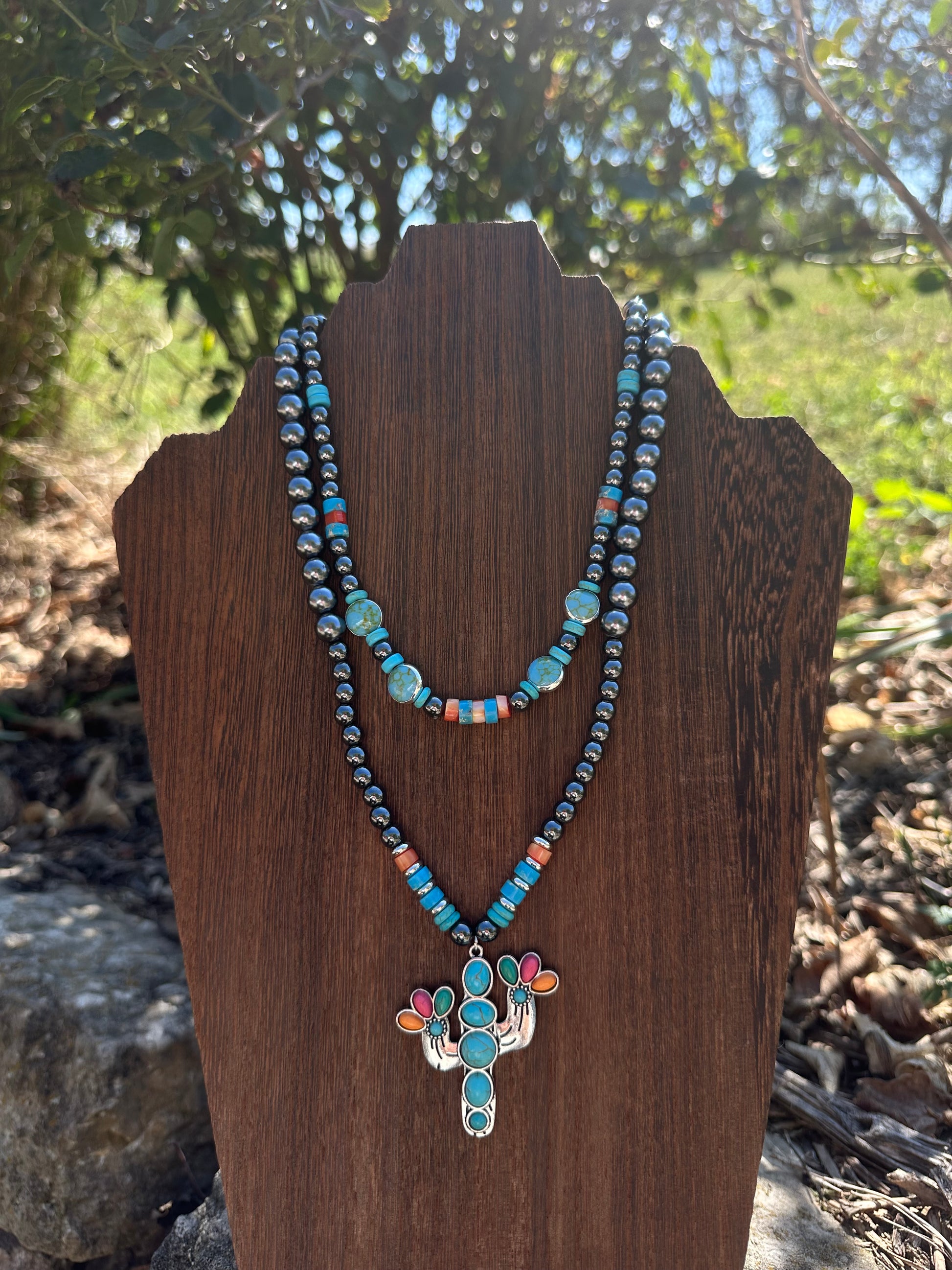 Handcrafted with hematite beads, spiny oyster shell, and turquoise stones, each bead adds a touch of natural color and shine — from the fiery desert reds to the calming blues of open skies. At the center hangs a silver cactus pendant inlaid with turquoise and spiny oyster, making it the perfect symbol of strength, resilience, and western grace.