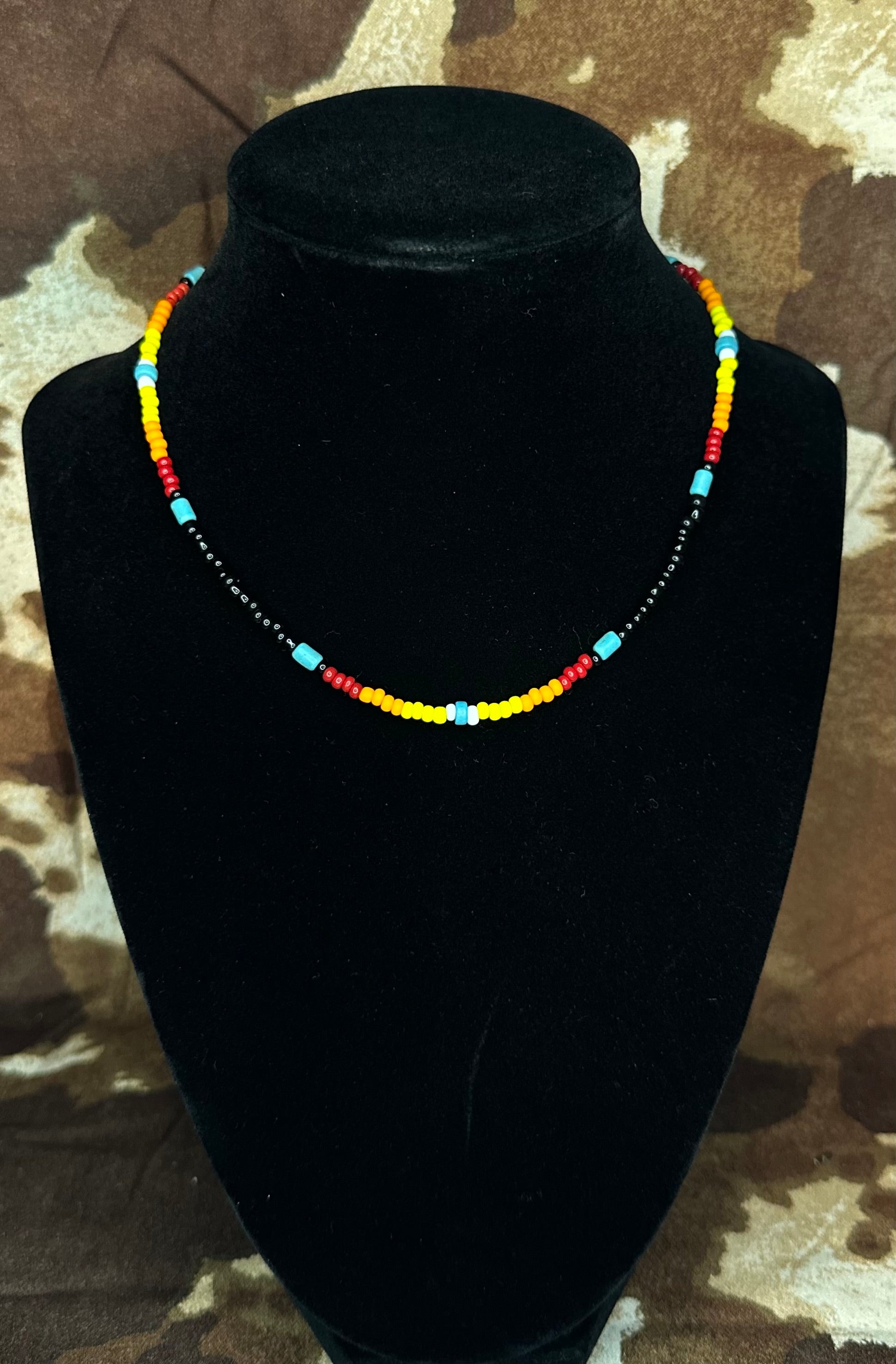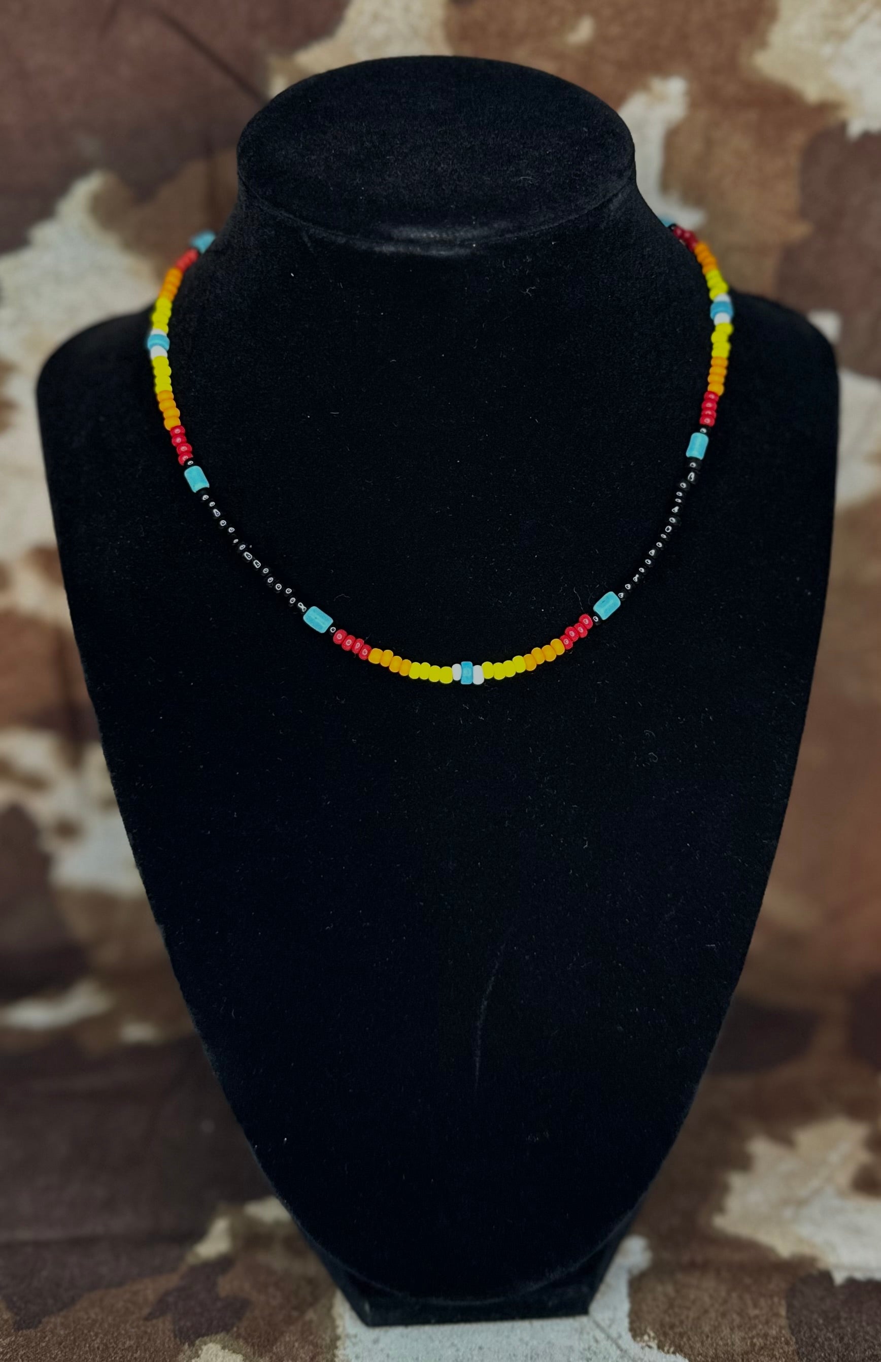 Brighten your style with the Cascade choker, a handcrafted piece that blends earthy elegance with a pop of color. Featuring sleek black seed beads accented with vibrant turquoise beads, this necklace creates a stunning cascade of sunset-inspired hues around your neckline. Designed with an extender chain and lobster clasp, it offers a customizable, comfortable fit—perfect for layering or wearing solo as a statement accessory that captures the warmth of sunlit trails.