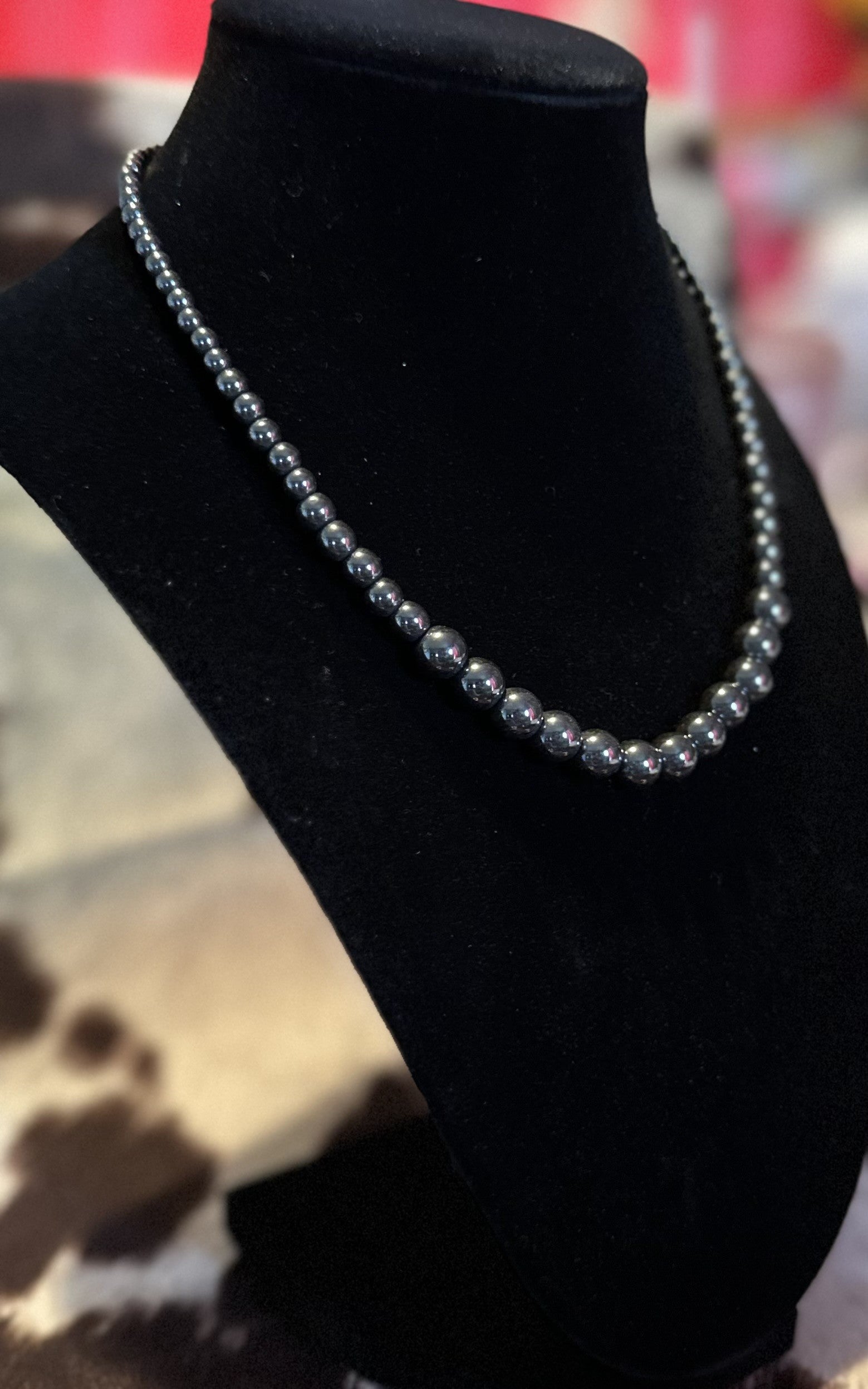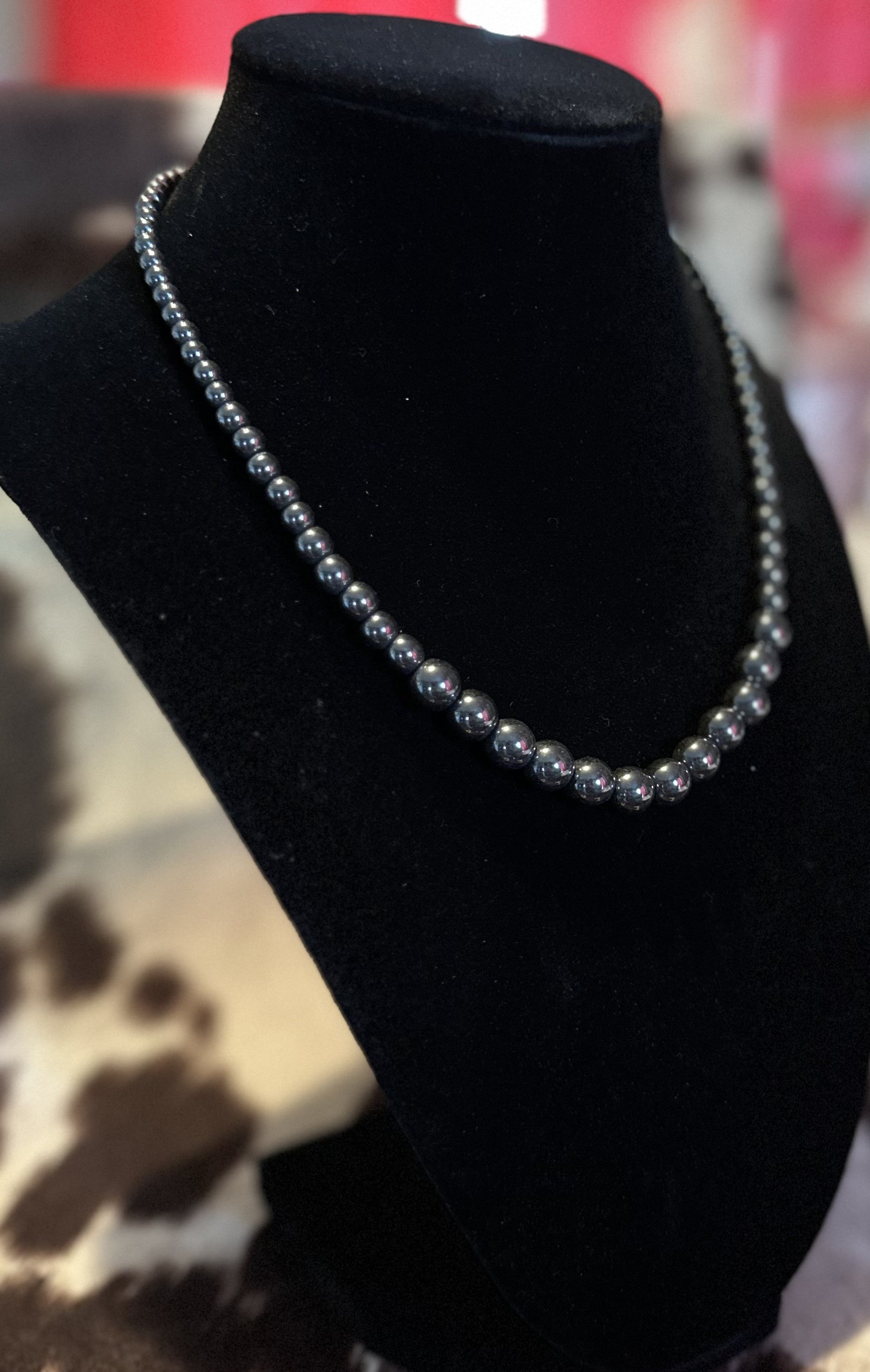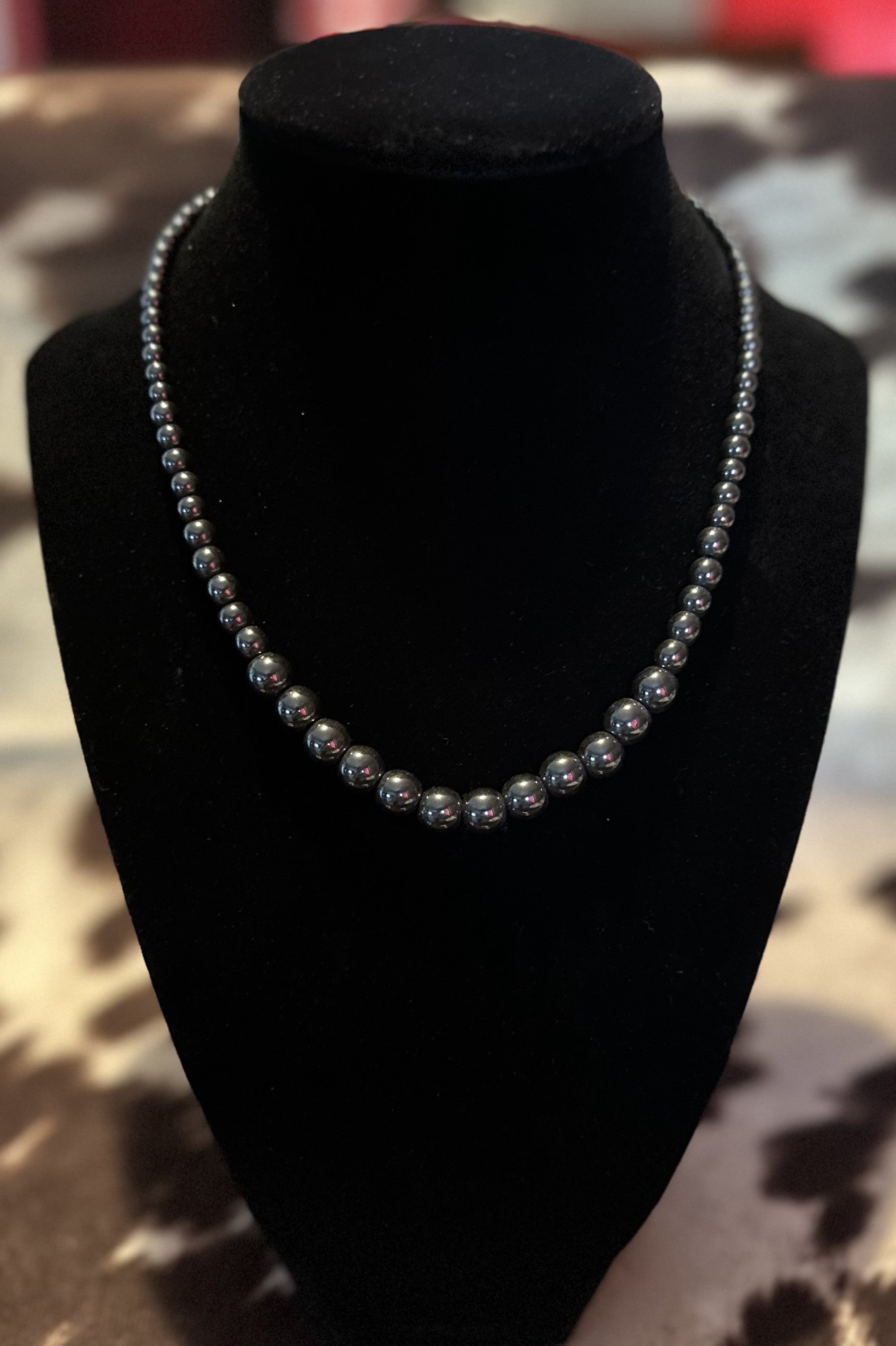 Meet the Coal Creek Necklace – a striking statement of silver with just the right touch of edge and elegance. This handmade piece features a beautiful gradient of darker silver beads, gradually increasing in size as they reach the front for a bold yet refined look.