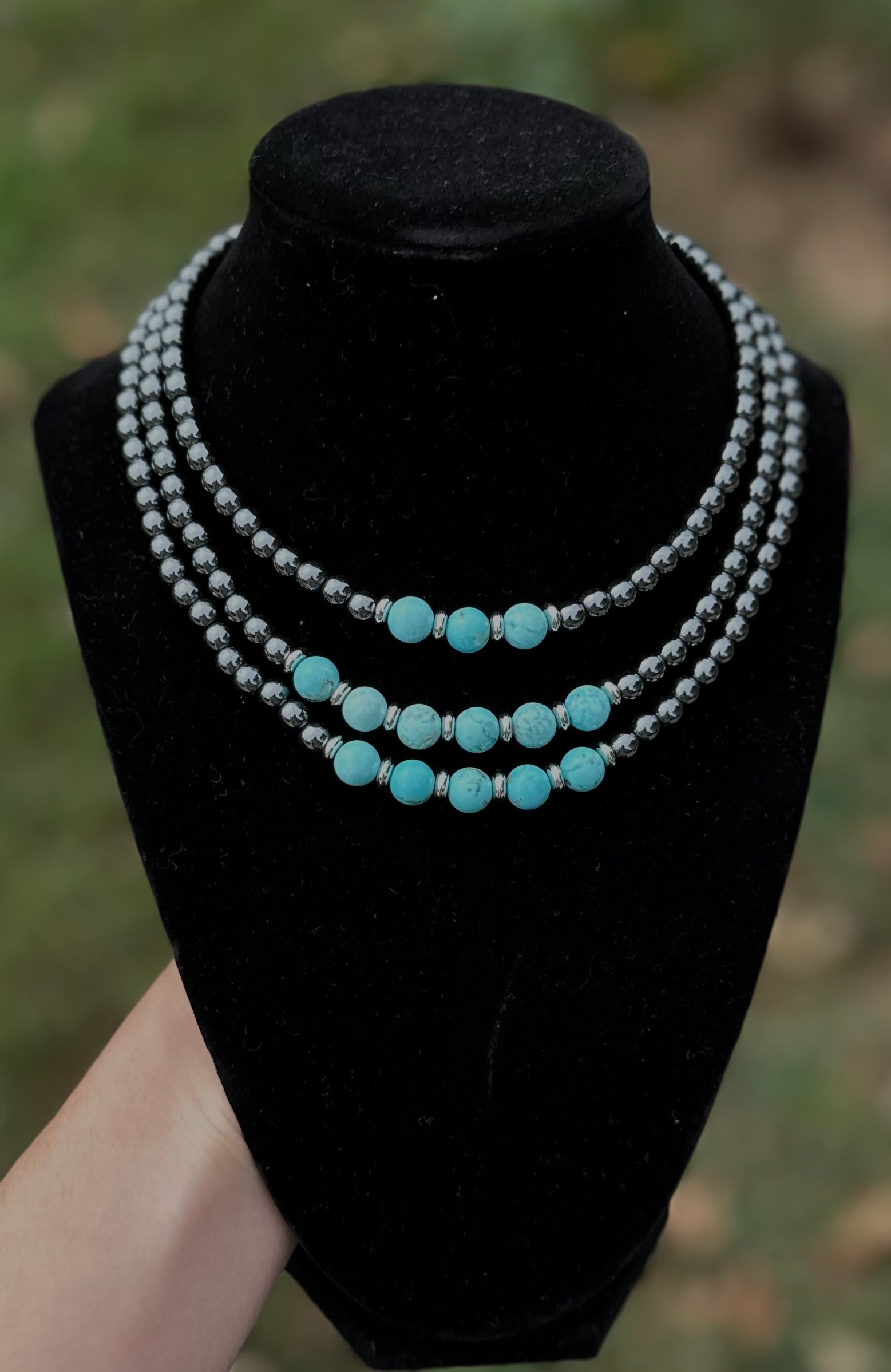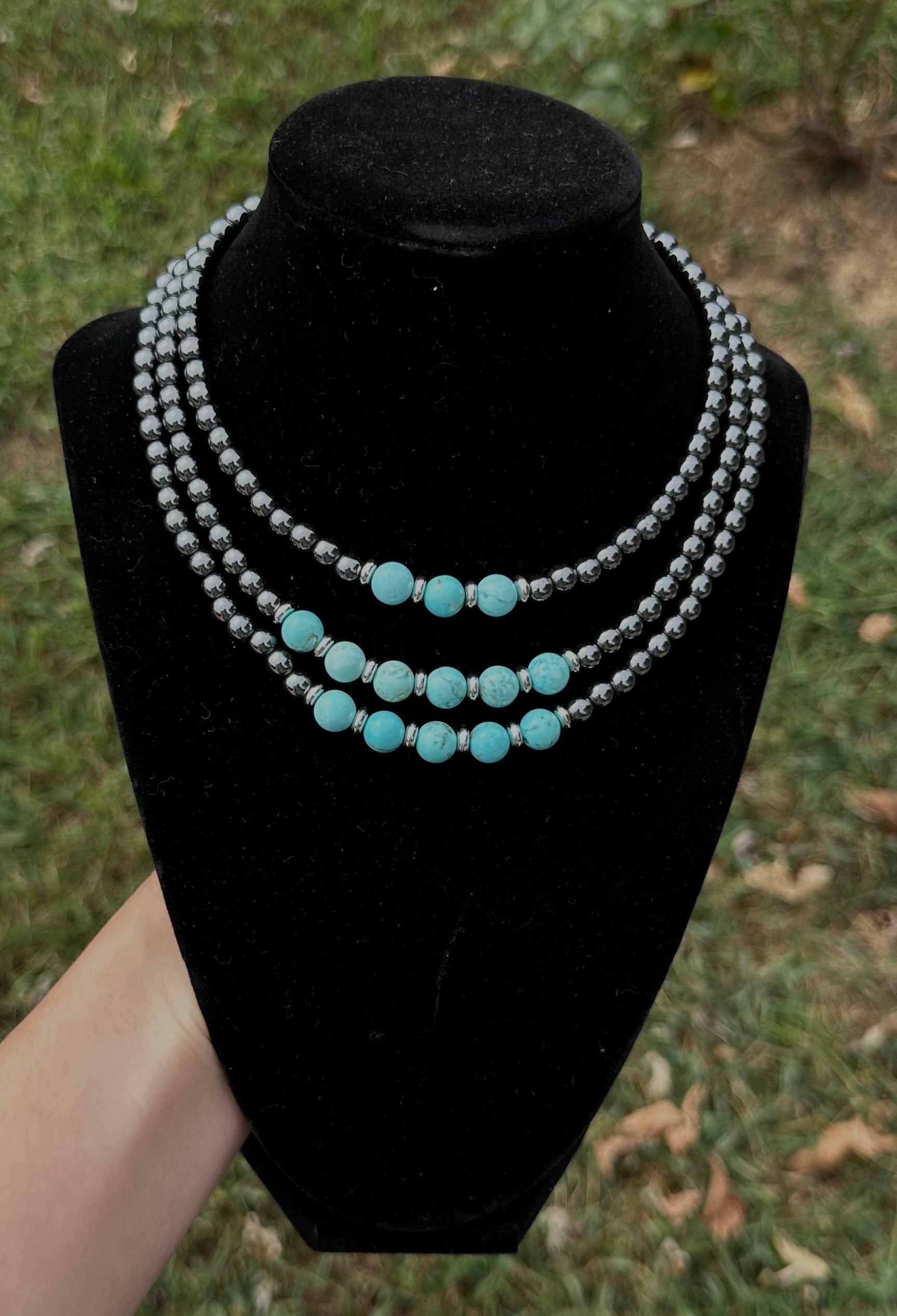 Bold, layered, and made for the trailblazer at heart — the Cowgirl’s Cascade necklace features three strands of dark silver beads, anchored with round turquoise stones along the bottom. The layered design creates a flowing, cascading effect that captures the spirit of wide-open skies and endless western horizons.