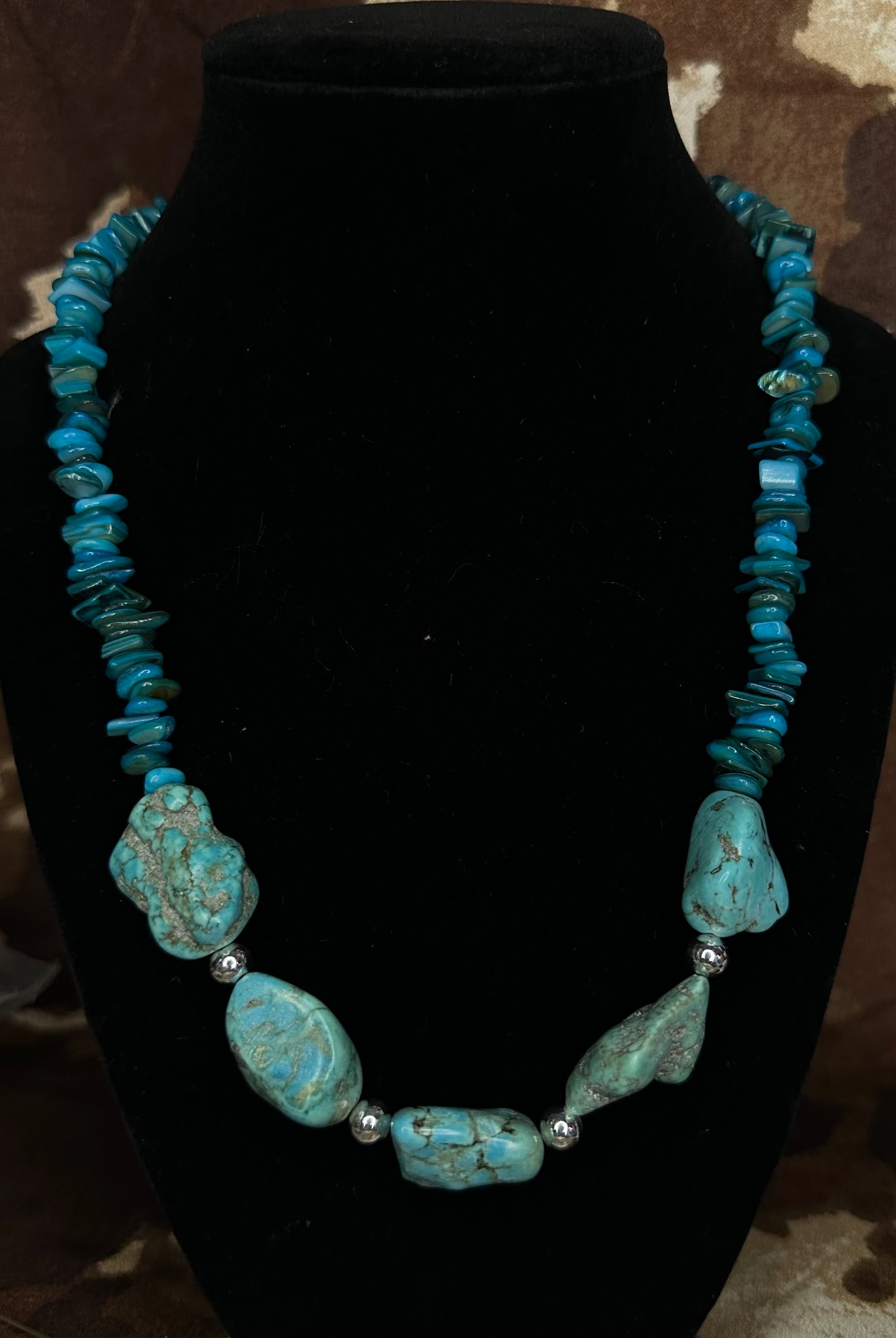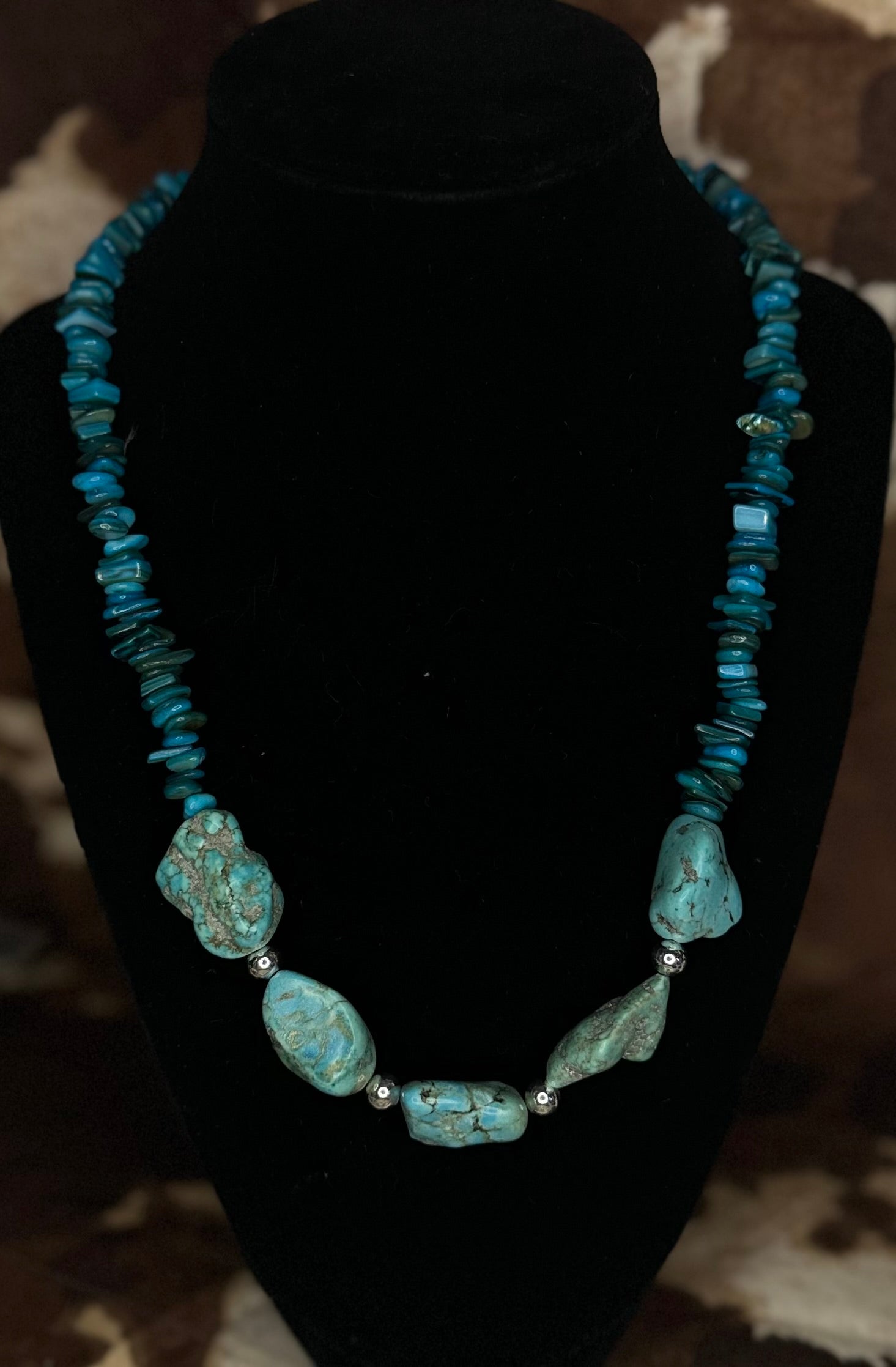 Rooted in rustic charm and western soul, Desert Soul is a hand-strung necklace made with chunky turquoise-colored beads and stacked stone-look chips. Each bead is uniquely shaped to give that natural, rugged feel—without using real turquoise—making it a bold and affordable way to bring that desert cowgirl energy into your wardrobe.
