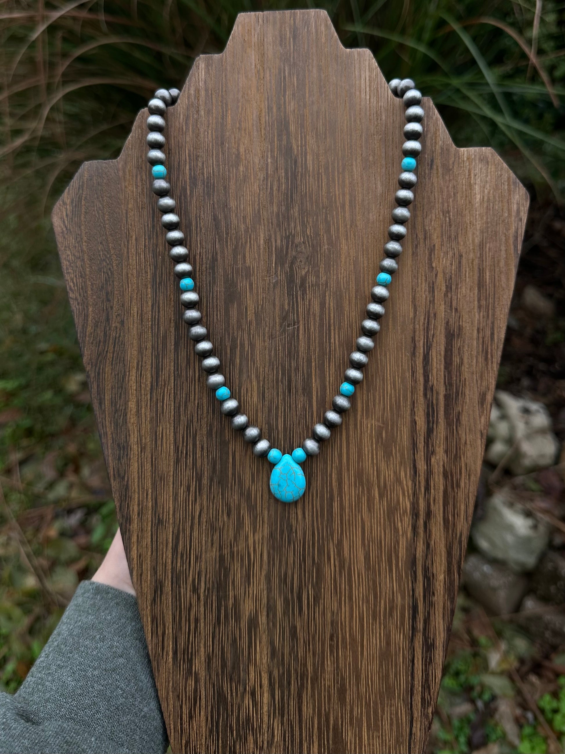 Channel the beauty and soul of the Southwest with our Desert Spirit Necklace — a stunning blend of Navajo-inspired pearls, turquoise beads, and a bold teardrop turquoise stone at the center. This piece captures the essence of rustic elegance, bringing that true western cowgirl charm to any look.