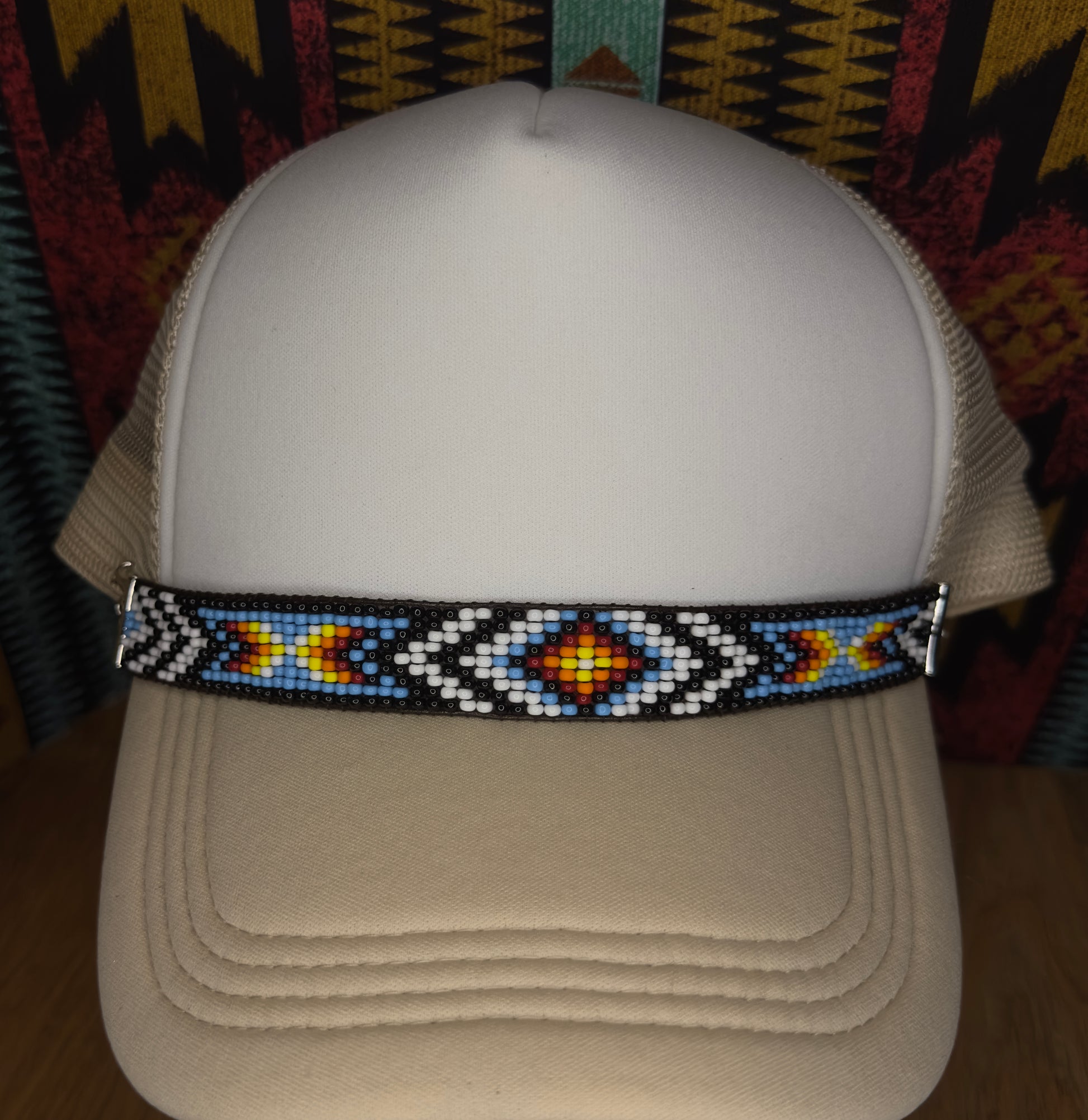 The Desert Trails Hat Band brings timeless Native-inspired style to your favorite trucker hat. Hand-beaded in a bold Navajo-style pattern, this piece blends tradition with everyday western wear. Rich desert tones and geometric details make this band stand out — perfect for rodeo nights, dusty road trips, or just adding flair to your daily fit.