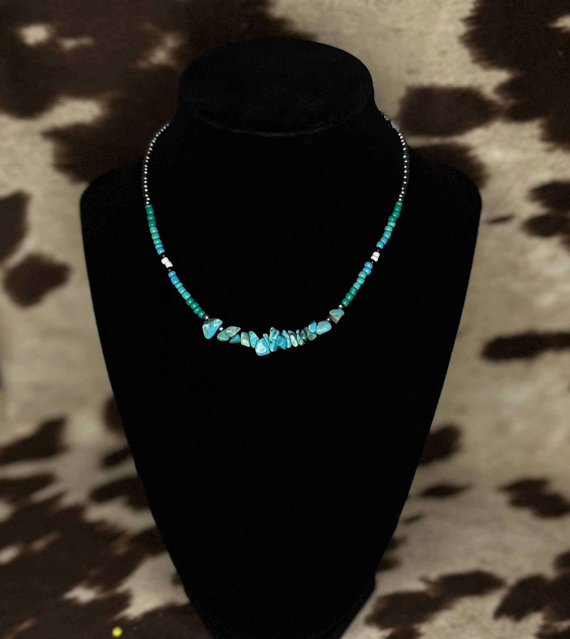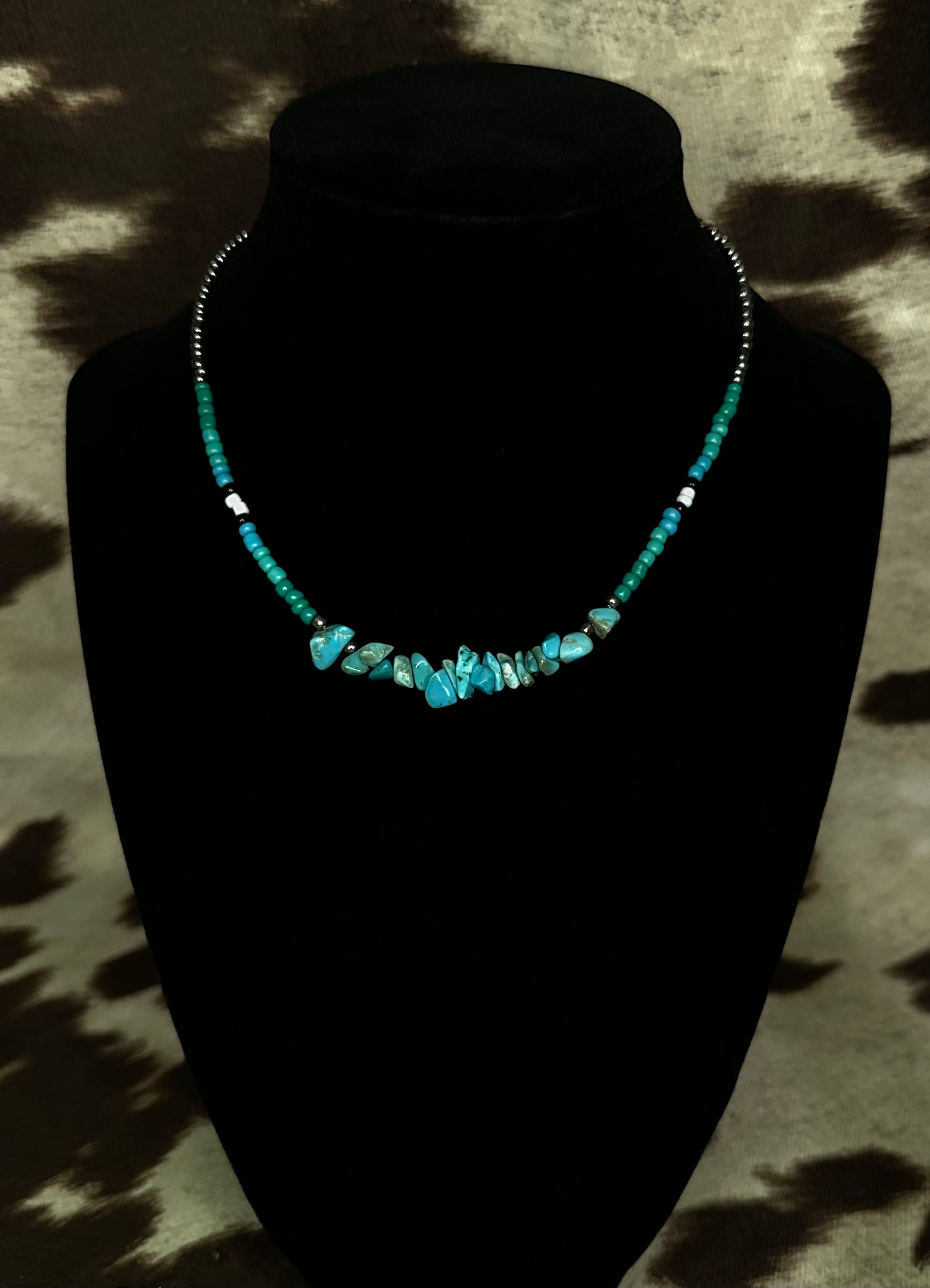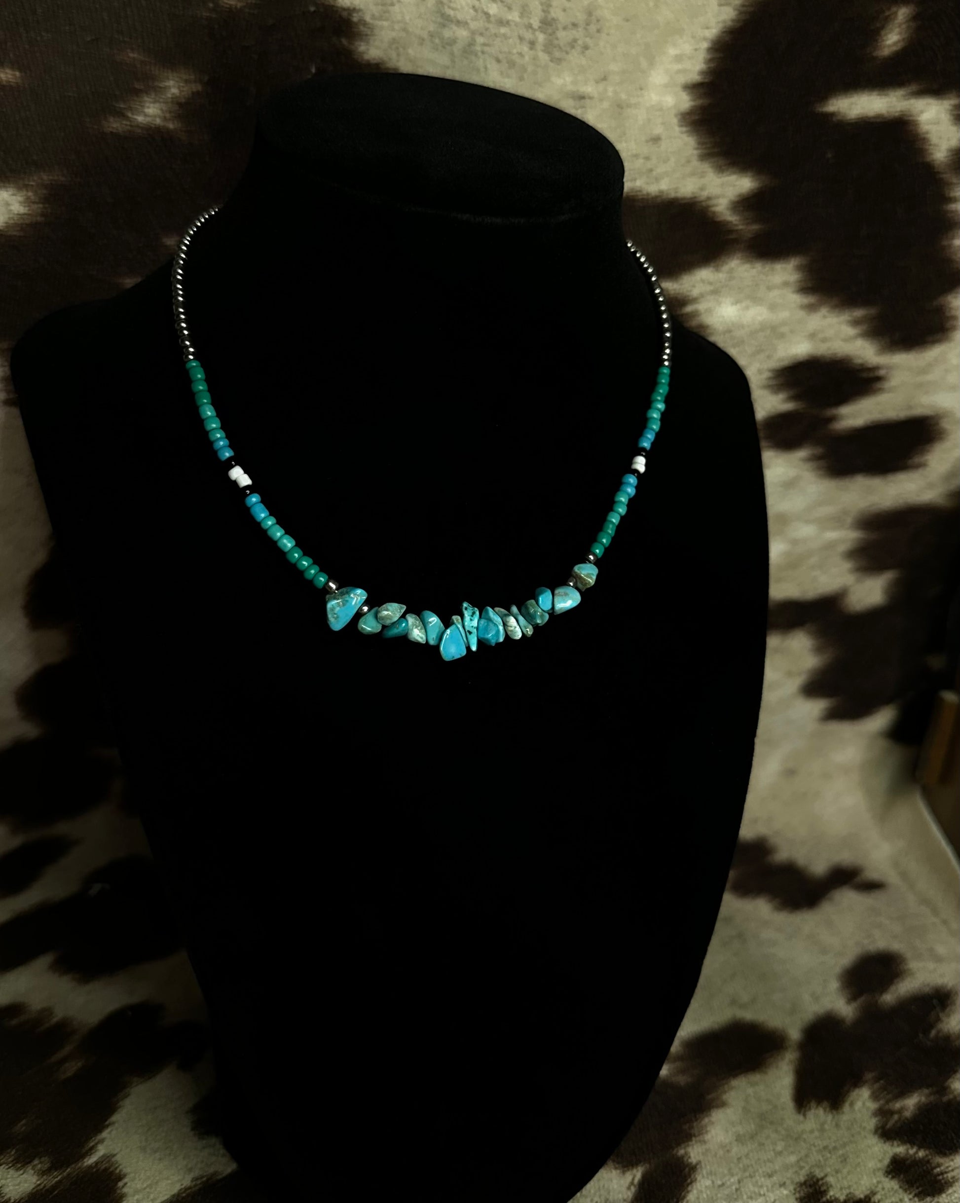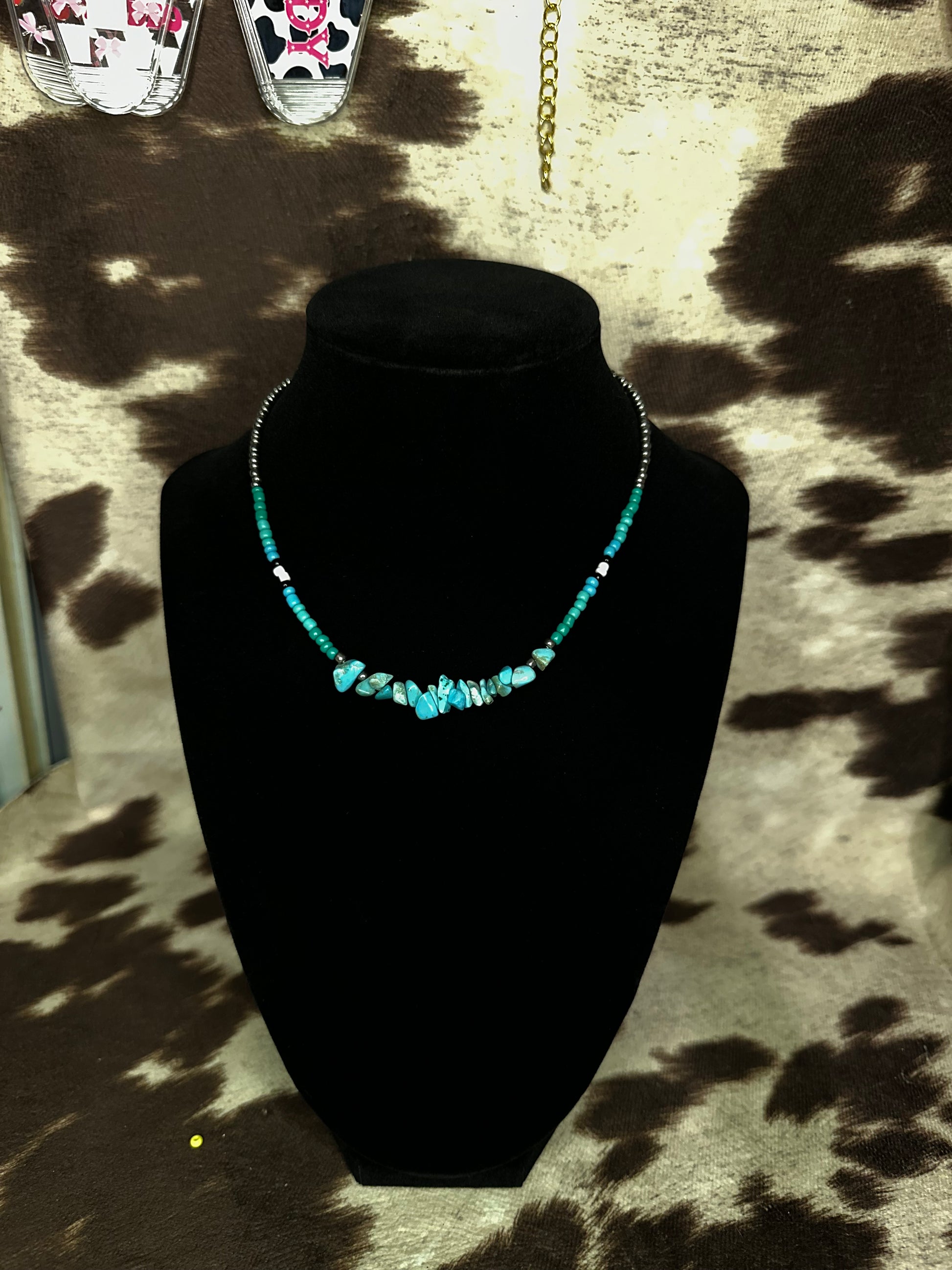 - Materials: Turquoise chips, colored beads, and silver accents