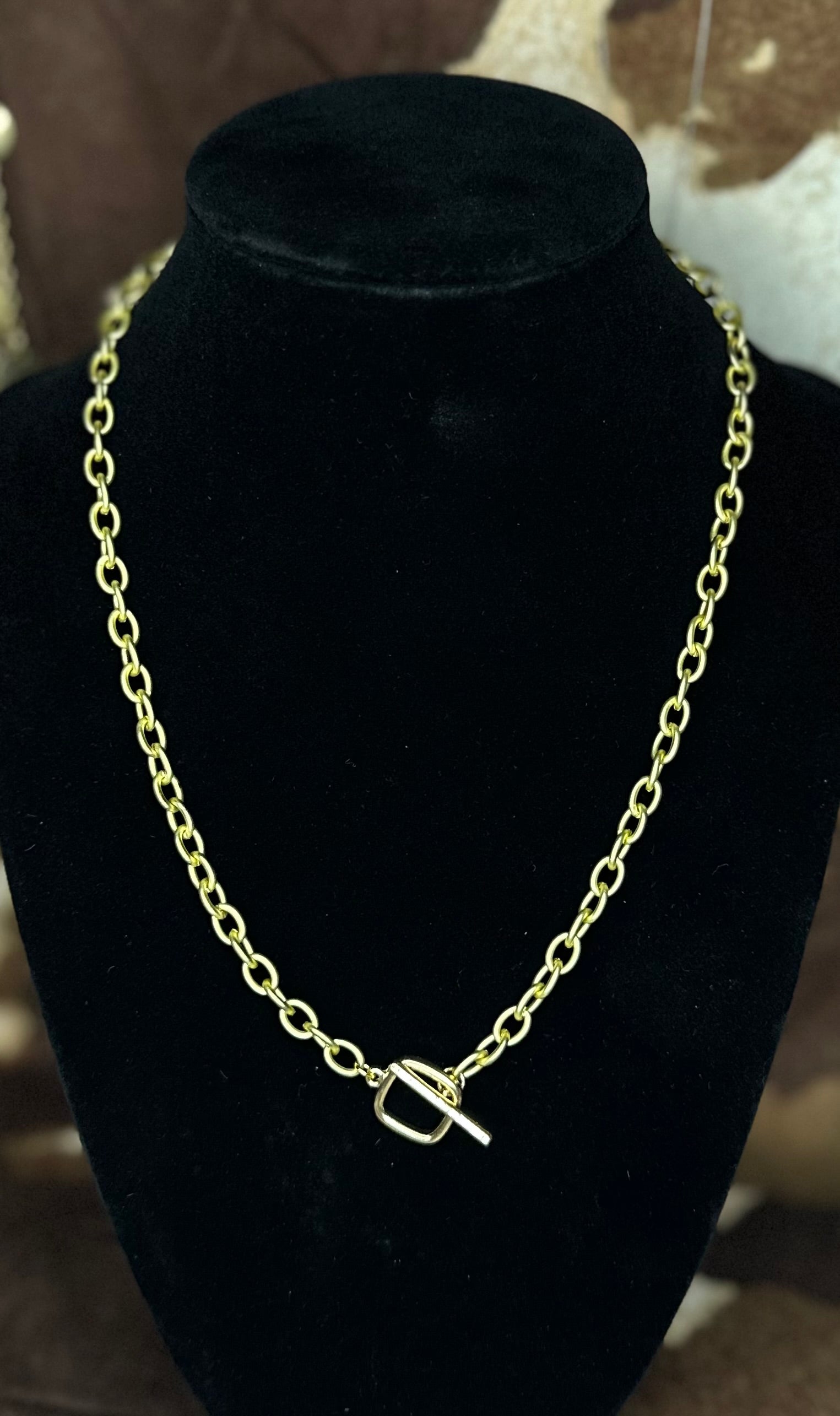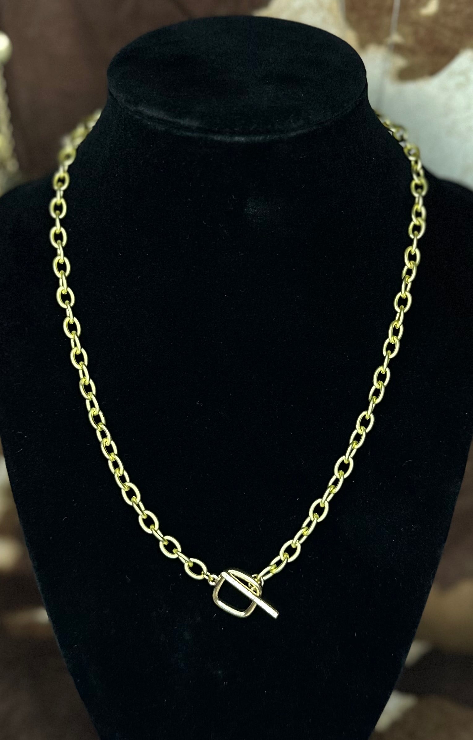 - Gold-tone chain with front toggle (circle and rod) clasp