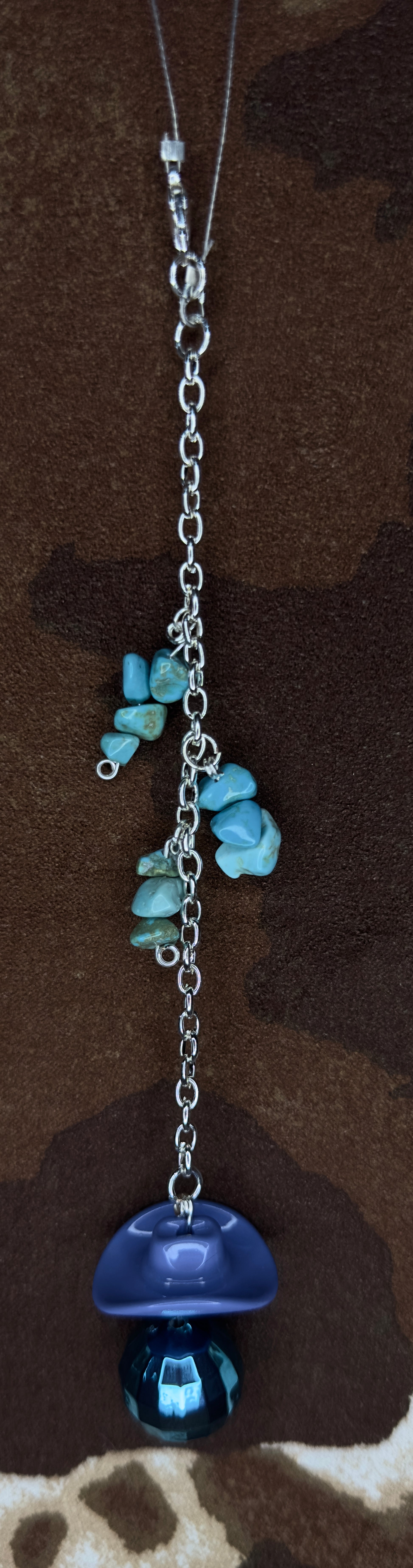 Hit the road in full western glam with the Honky Tonk Blues Mirror Charm. This handmade dangle features a silver chain dripping with turquoise chip accents, a mini blue cowboy hat, and a sparkling blue disco ball — all perfectly stacked for that bold cowgirl energy. It swings with every turn and catches the light just right, adding a pop of personality to any ride.