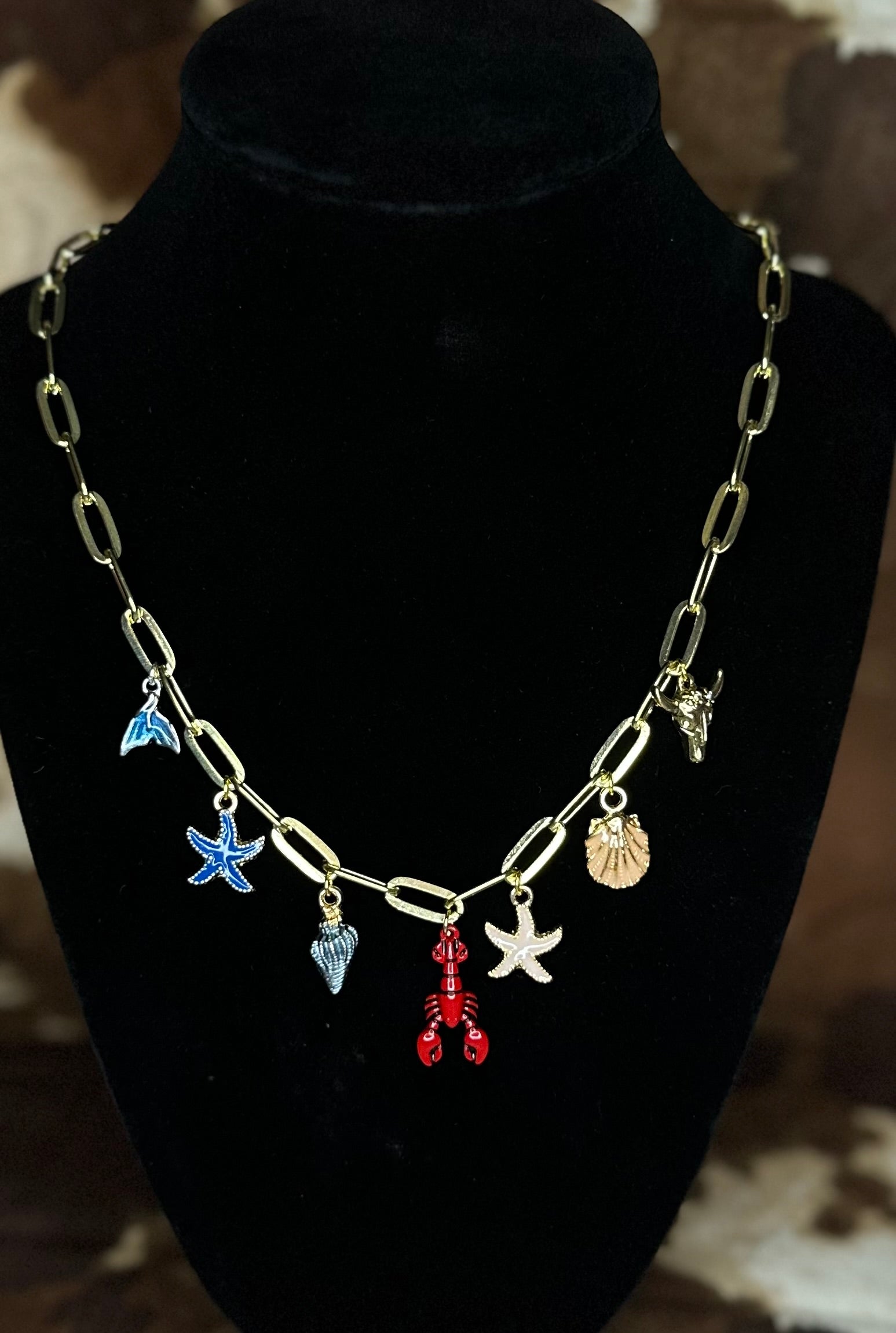 Where ocean tides meet desert horizons. The Mariner’s Mesa necklace is a striking blend of coastal charm and Western spirit, featuring a vivid red lobster centerpiece surrounded by sea-inspired charms — a blue whale tail, blue starfish, blue shell, and pops of pink with a pink shell and pink starfish — all anchored by a bold gold cow skull.