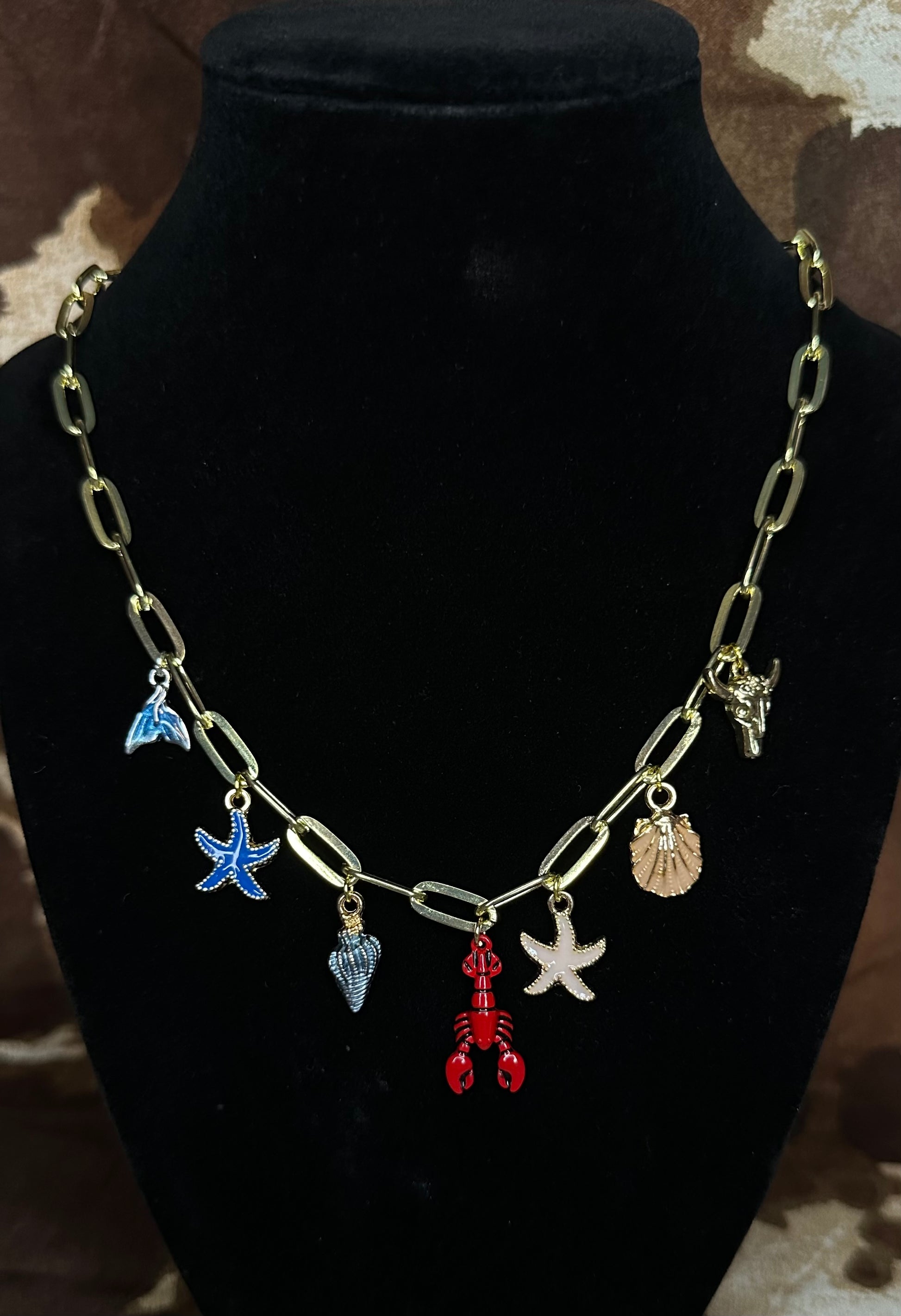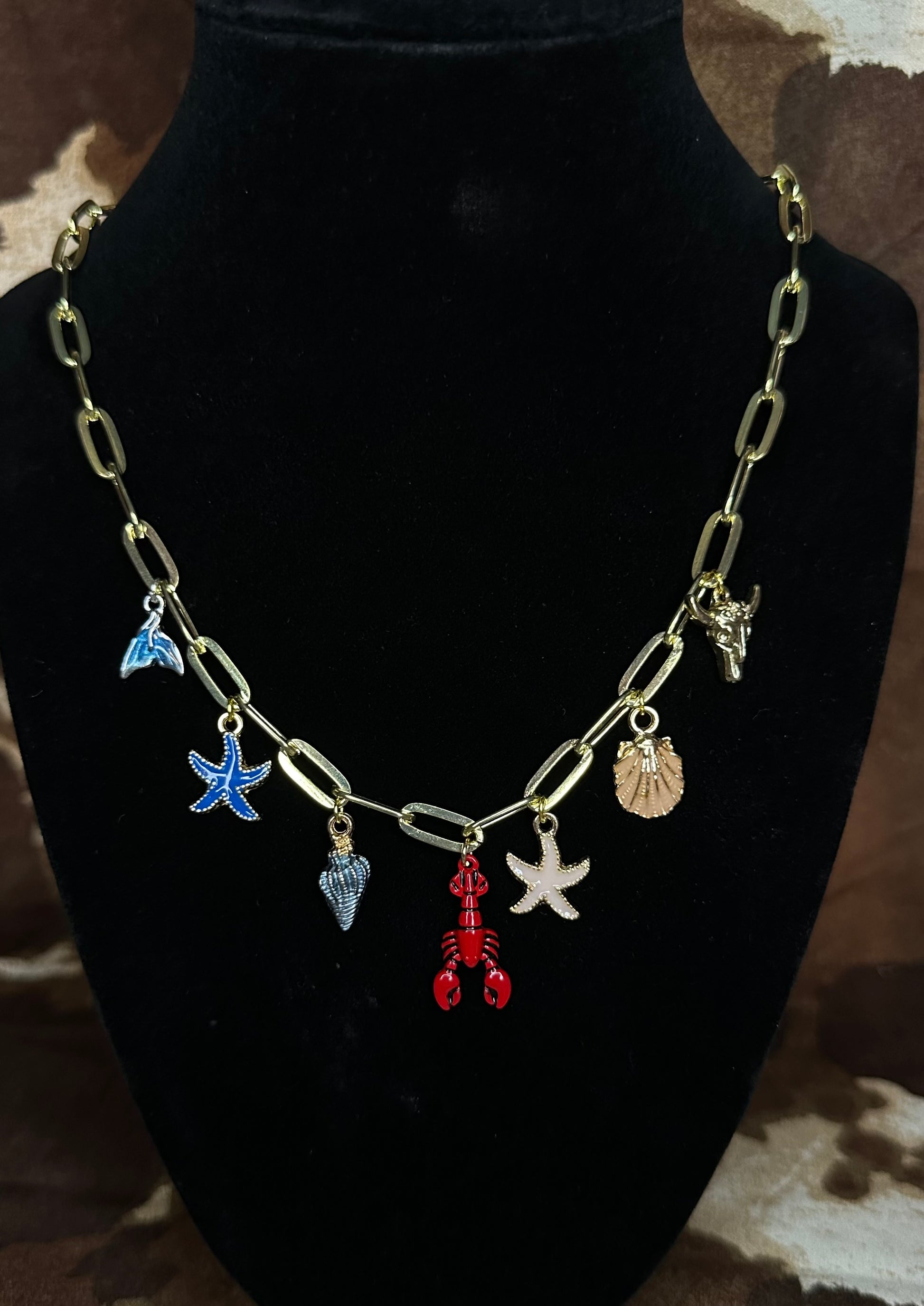 - Charms: red lobster, blue whale tail, blue starfish, blue shell, gold cow skull, pink shell, pink starfish