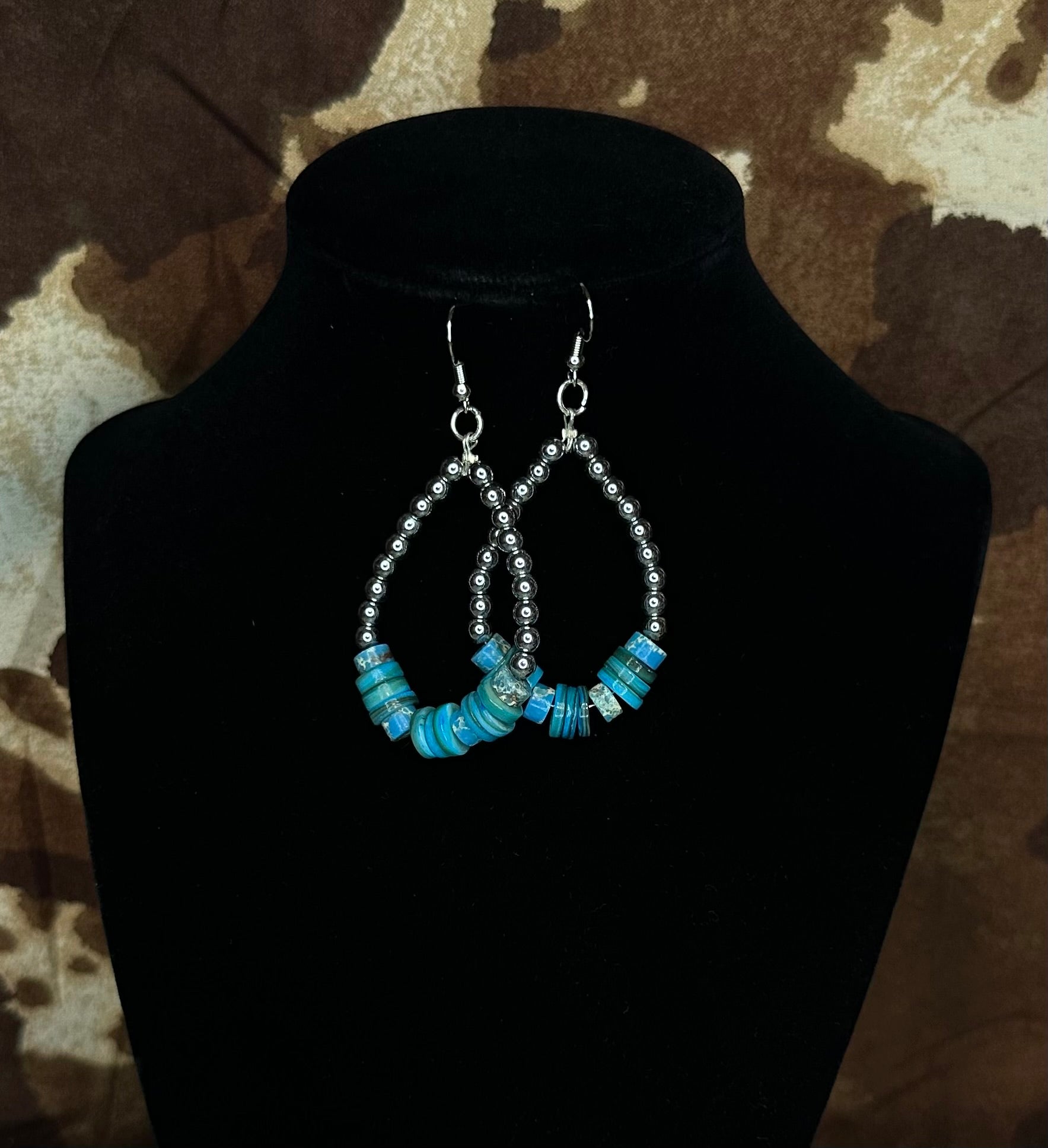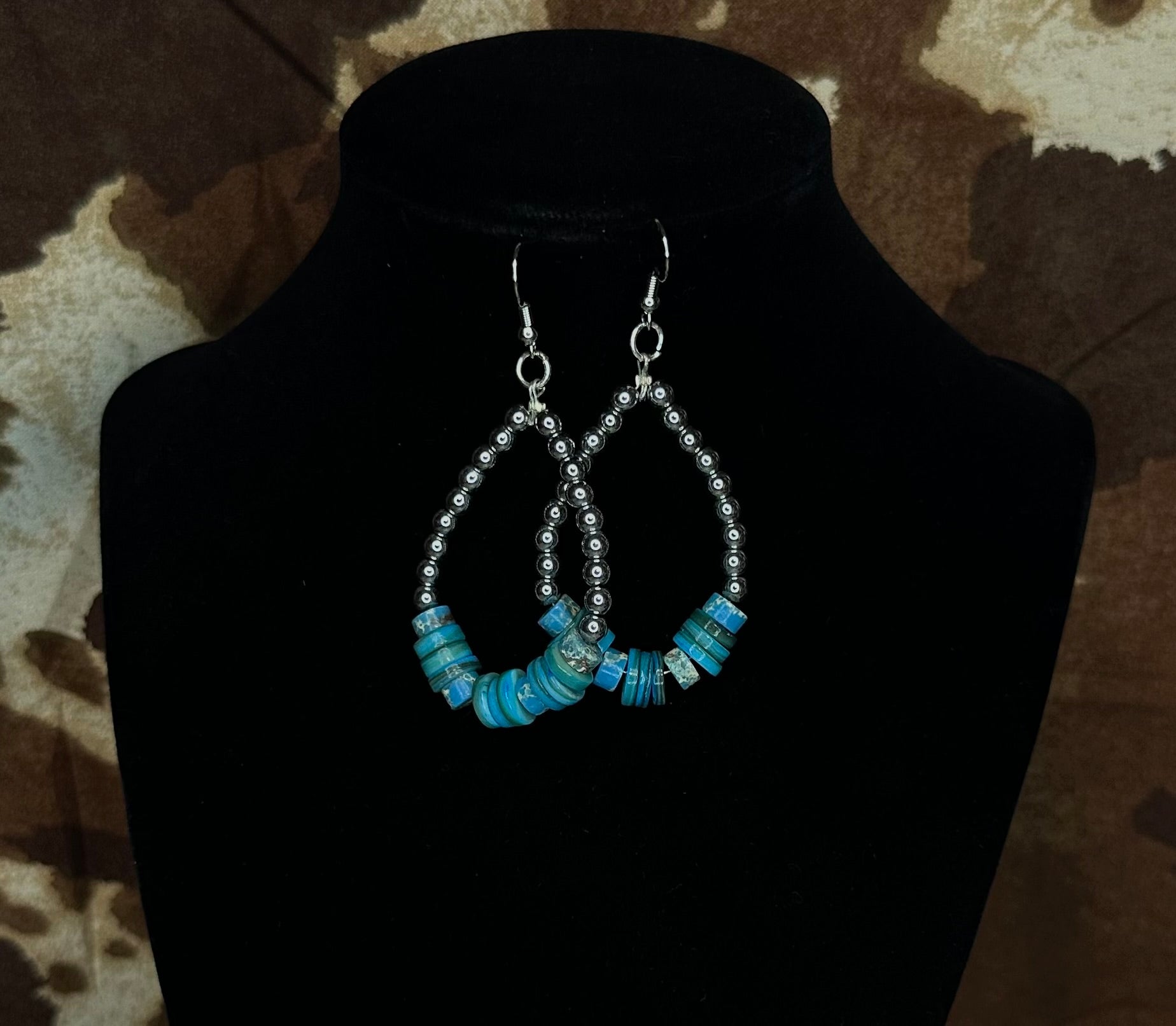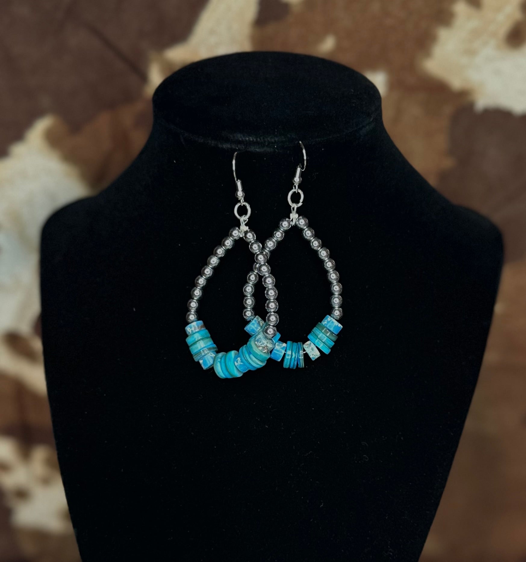 Inspired by the desert sky at dusk, the Midnight Mesa Earrings feature a classic teardrop design with rich dark silver beads and bold turquoise saucers at the base. Handmade and lightweight, these earrings add a striking western edge while still being versatile enough for everyday wear.