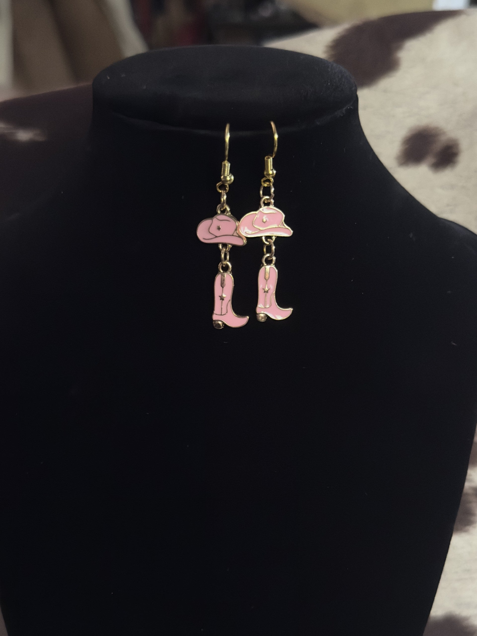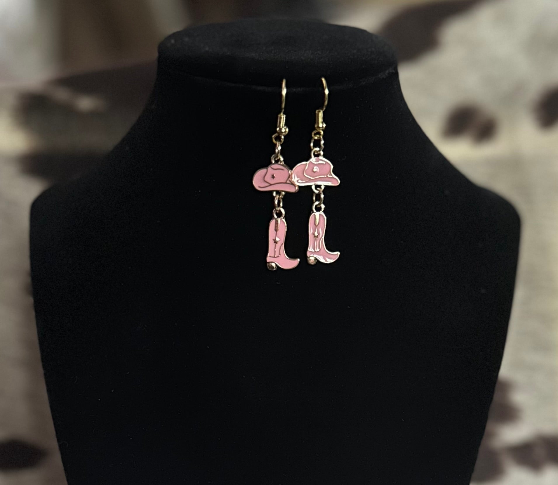 Pink cowgirl hat and boots charms on each earring