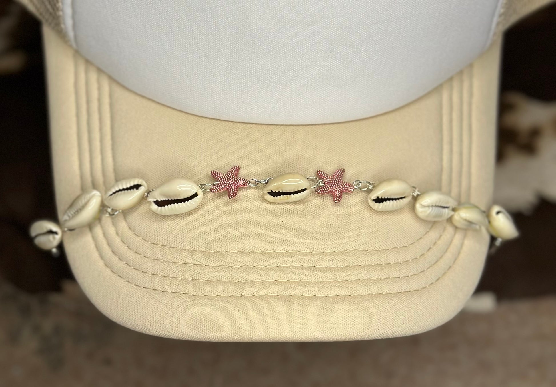 Bring the gentle charm of the coast to your hat with the Pink Tide Treasures seashell hat band. This handcrafted accessory features two delicate pink starfish perfectly spaced by a natural seashell centerpiece, capturing the serene beauty of seaside days.