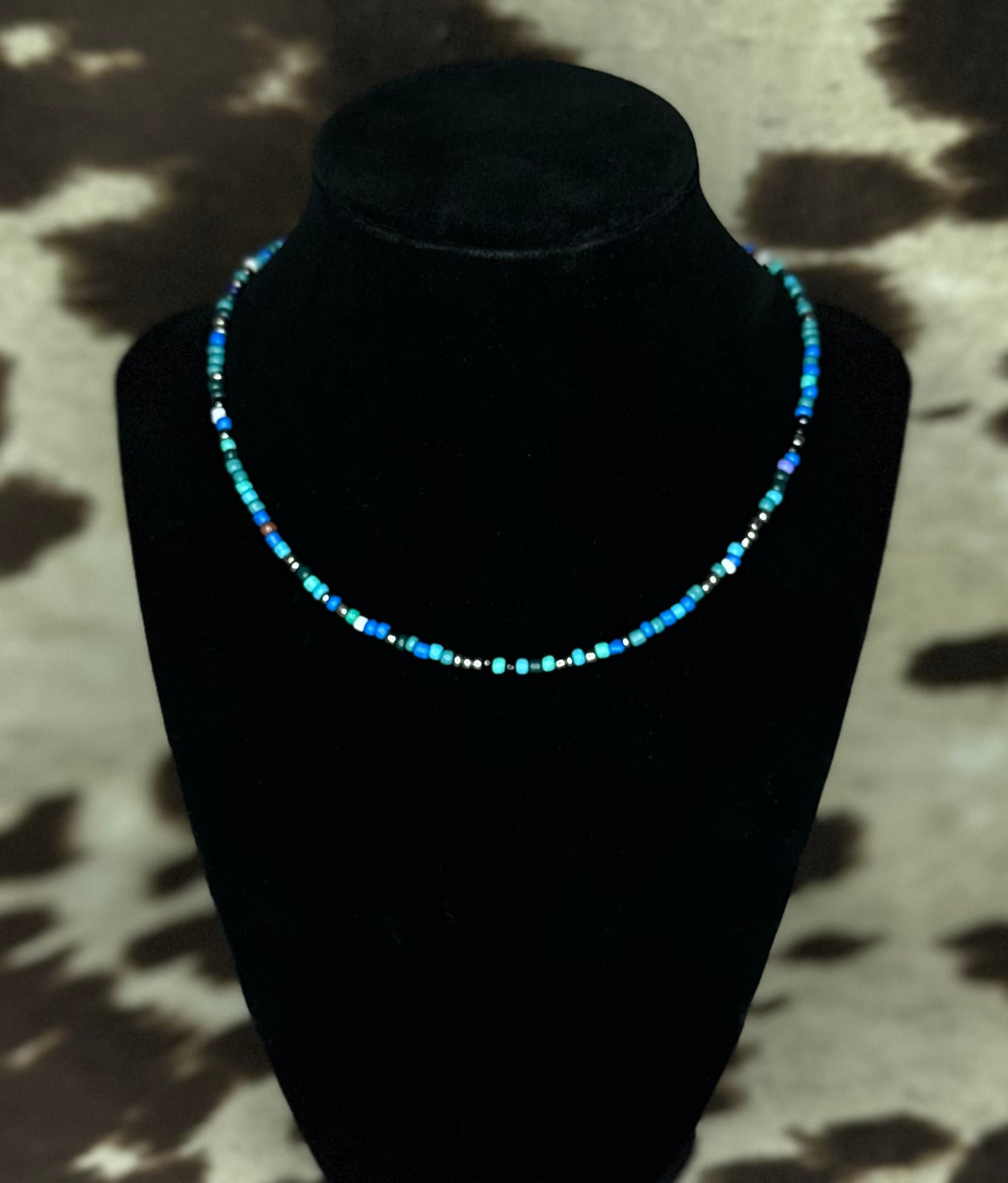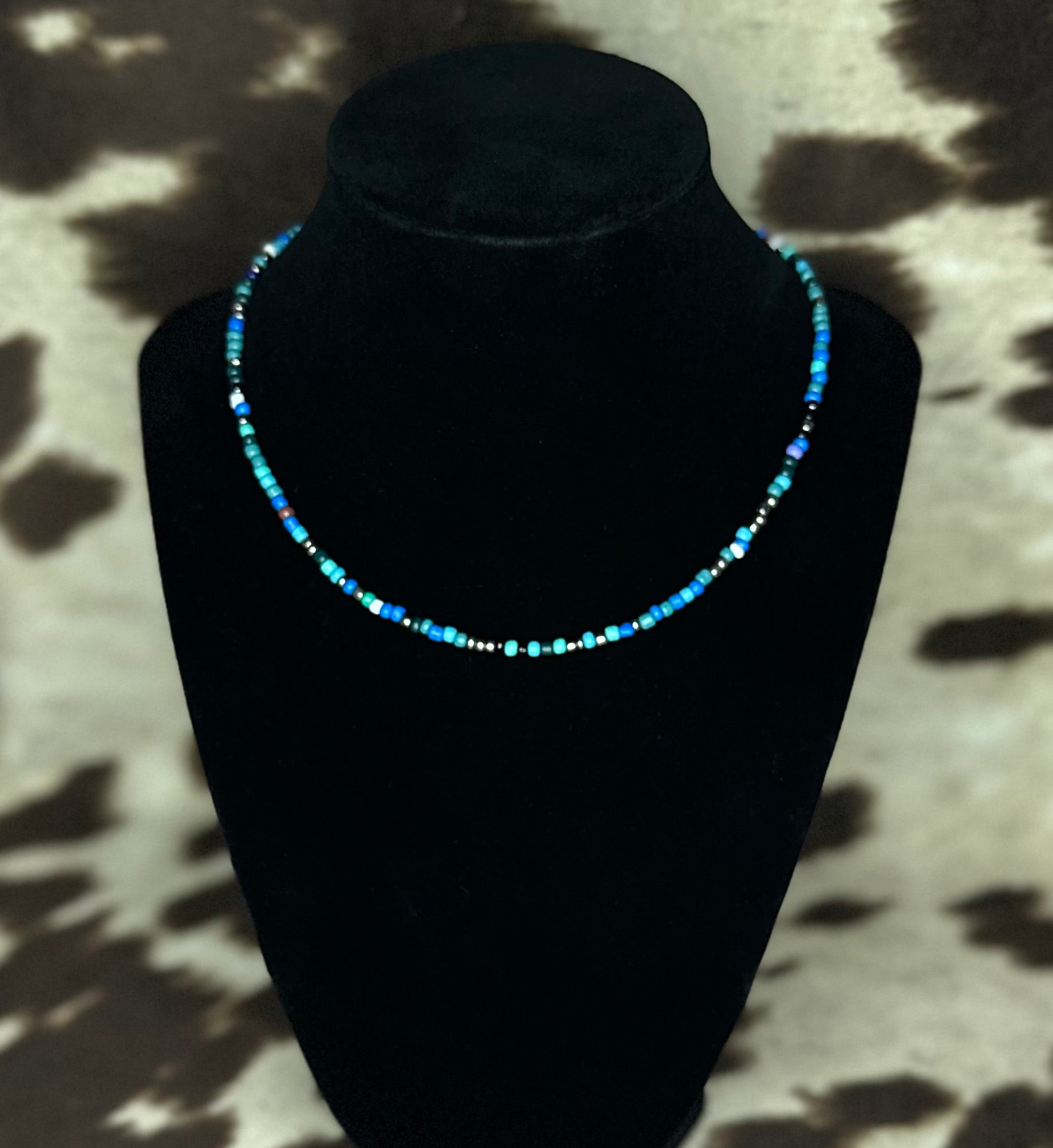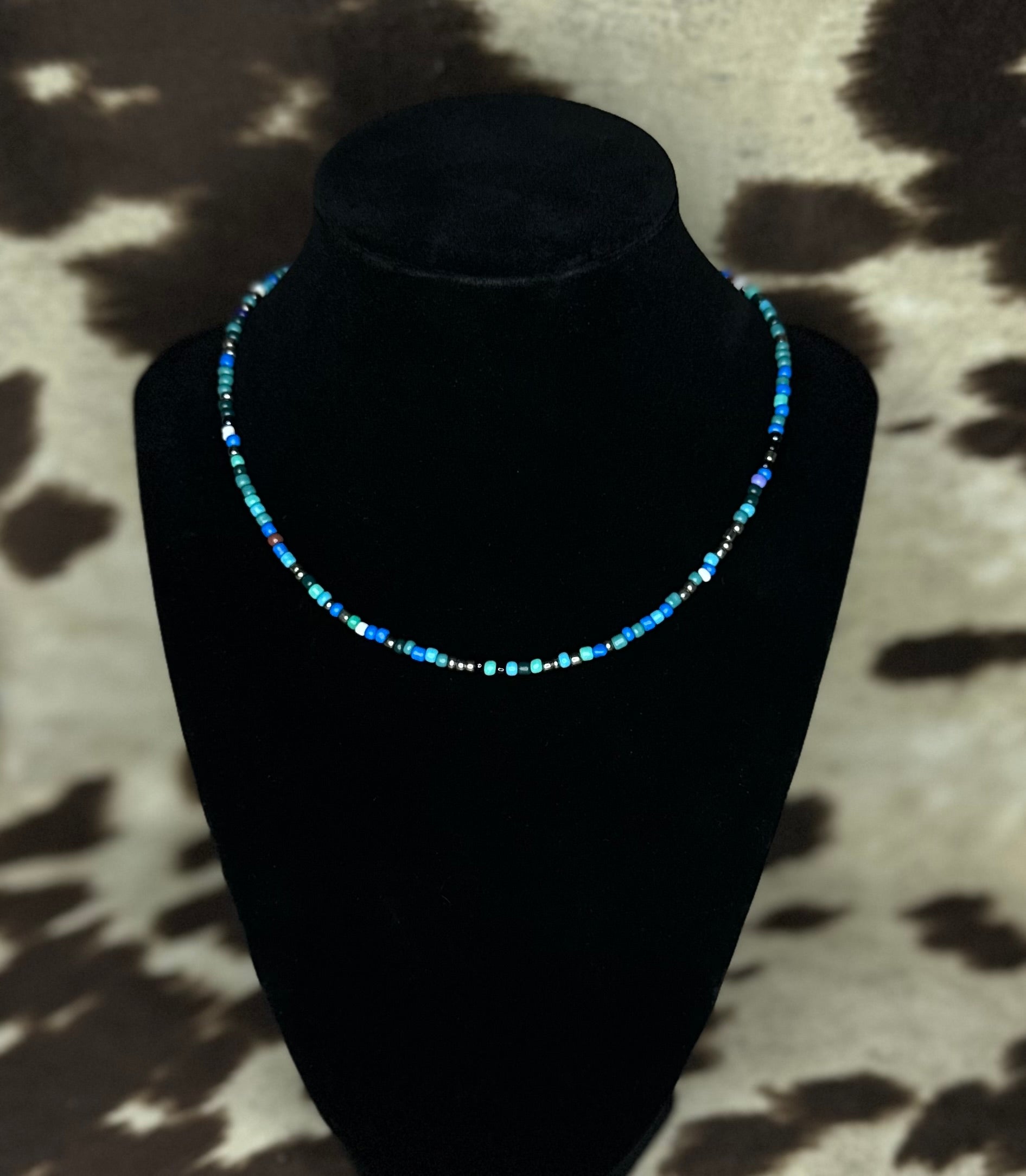 Meet Prairie Mirage, a desert-dream choker that captures the quiet strength of the open range and the subtle shimmer of sunlit stone. This handcrafted piece features a medley of earthy and cool-toned beads, carefully strung to create a balanced and grounded look with just the right touch of shine.