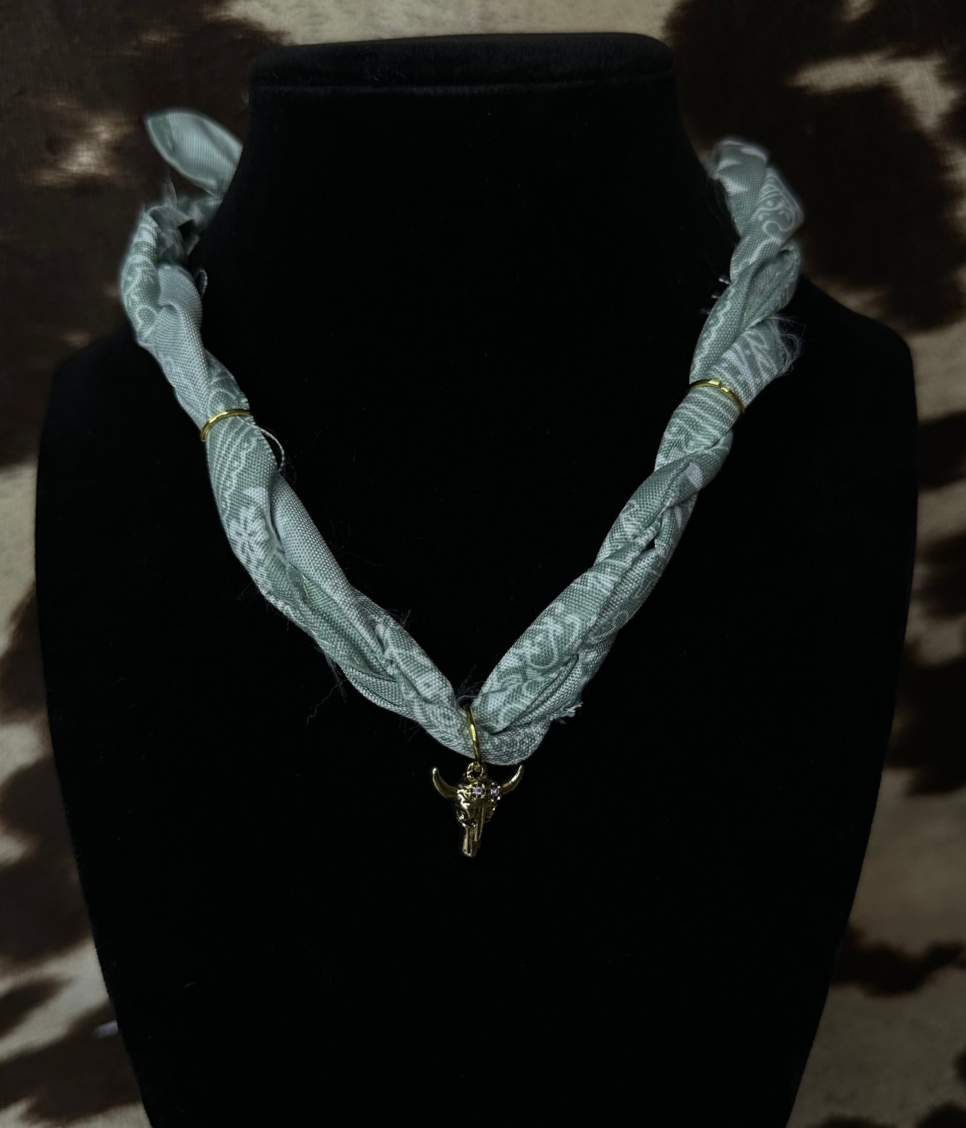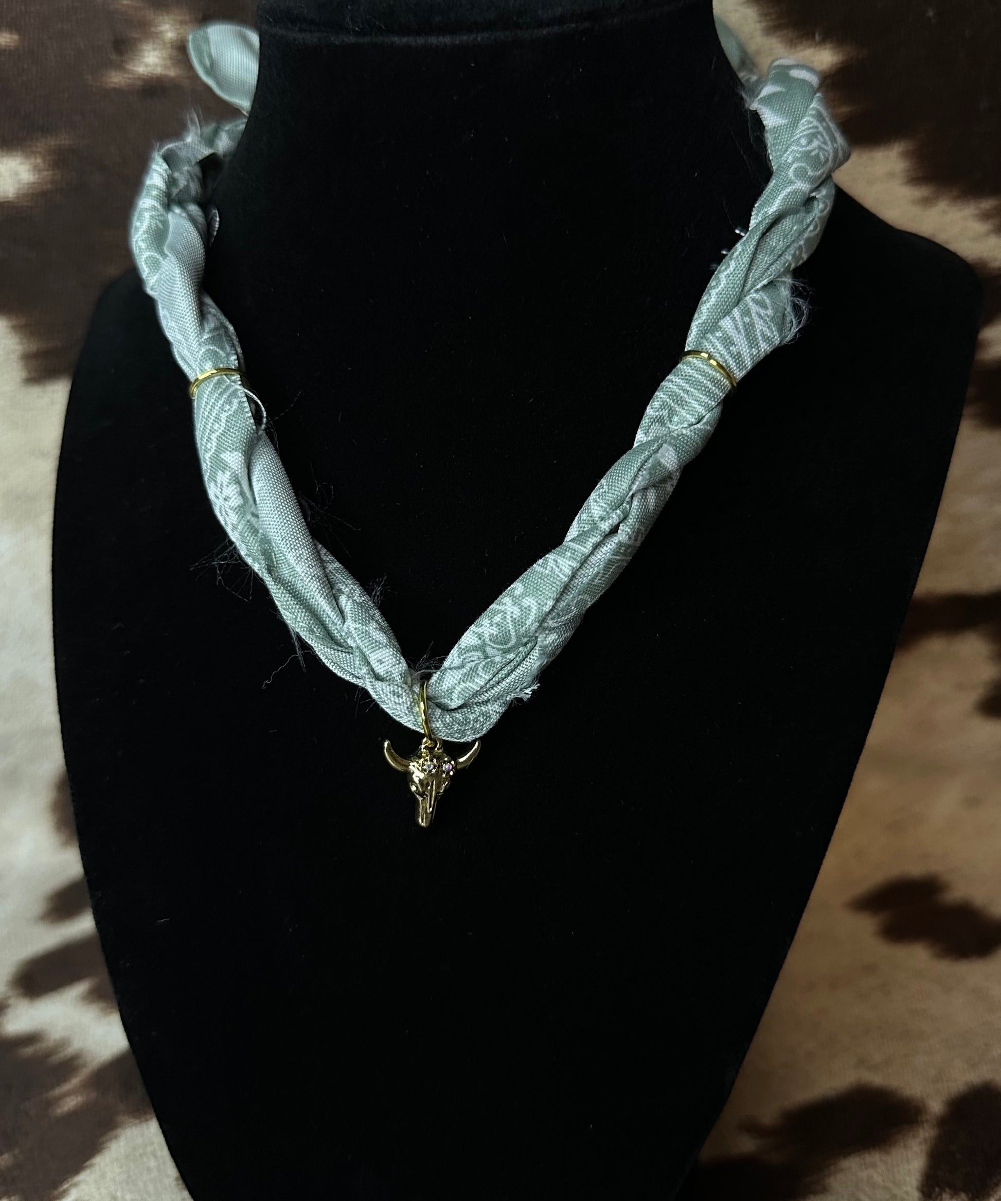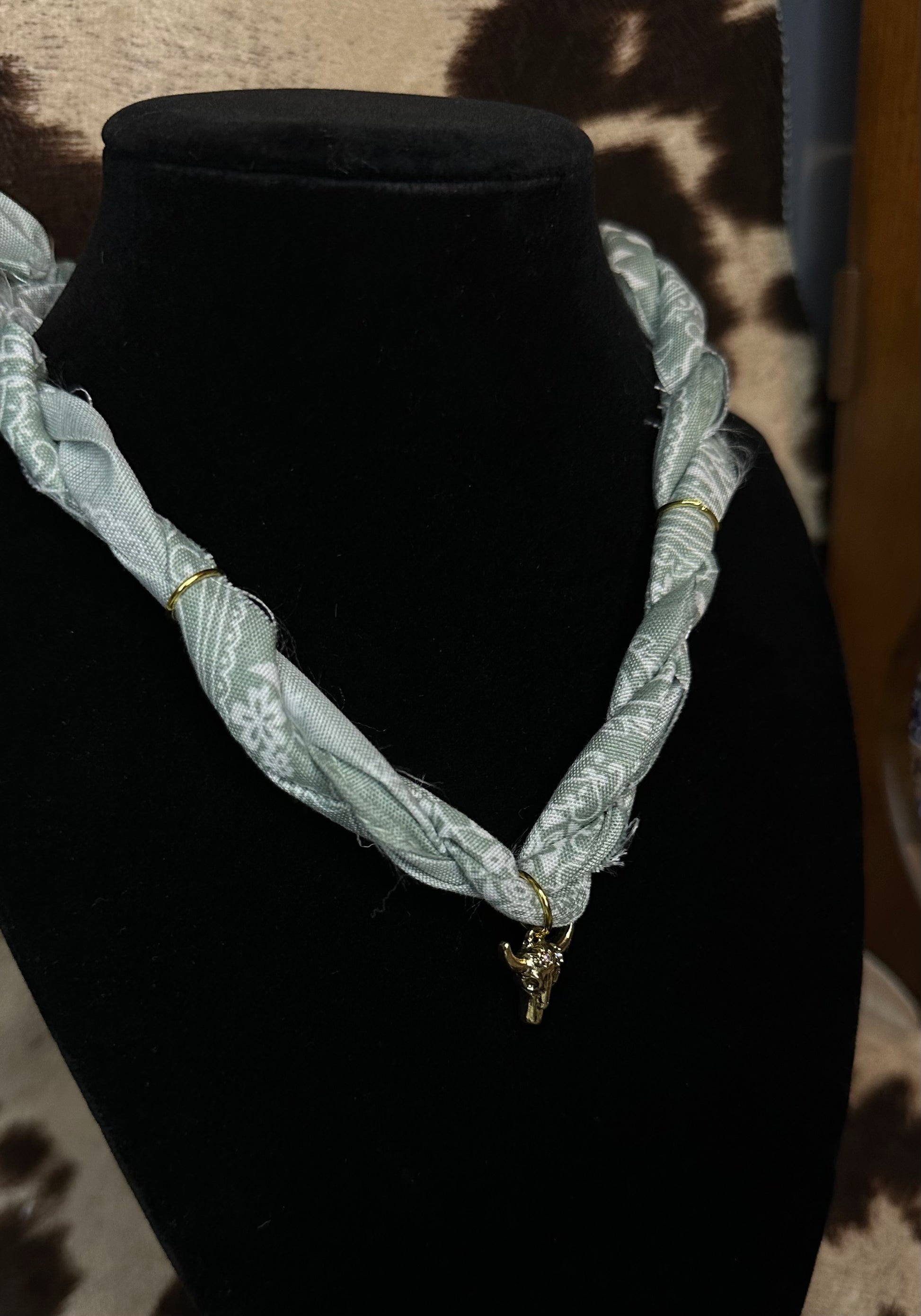 Meet your new favorite statement piece: Prairie Smoke. This western-inspired necklace features a soft, sage green paisley bandana hand-twisted into a chunky, textured strand and finished with a gold longhorn charm for a true cowgirl edge.