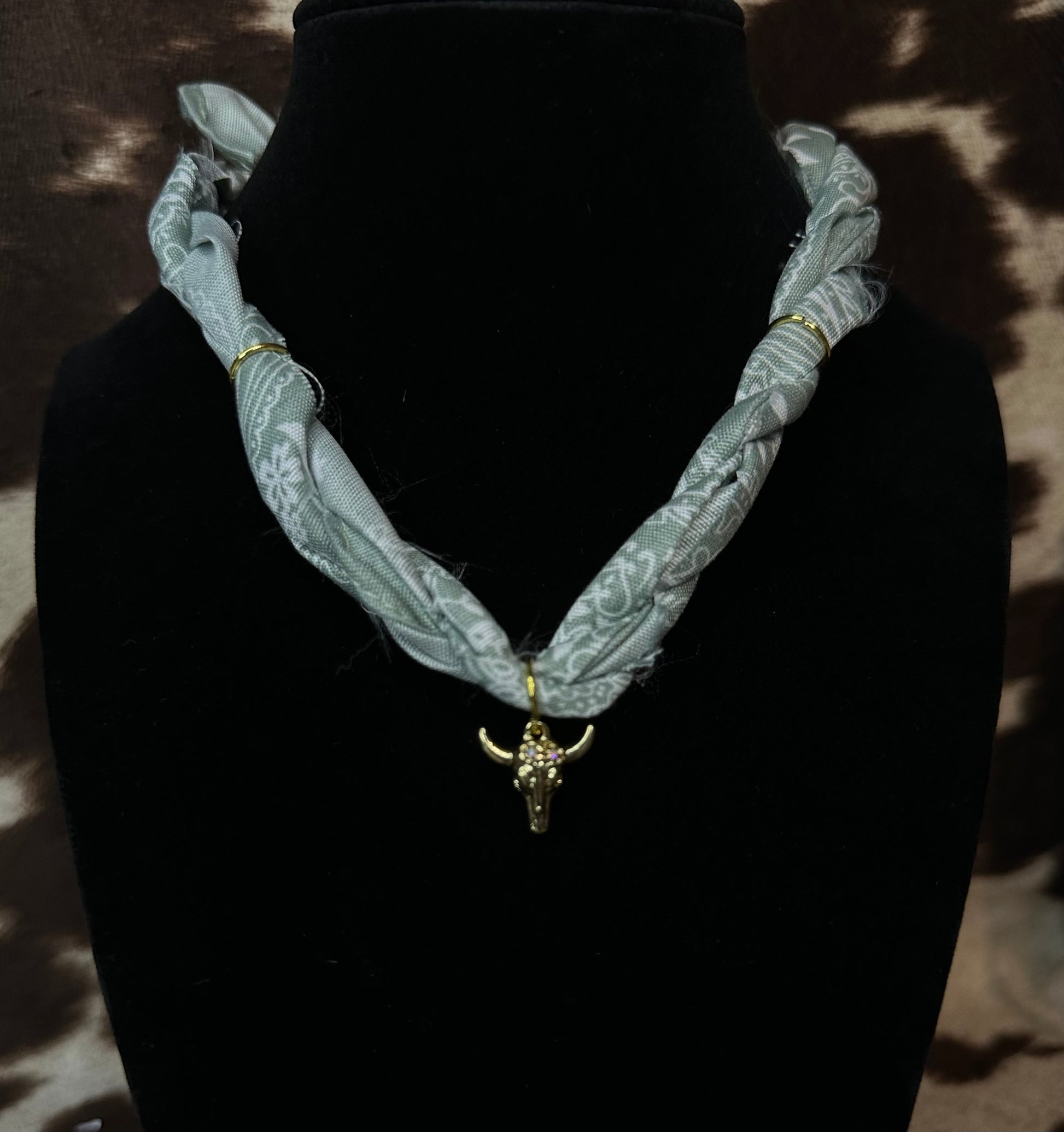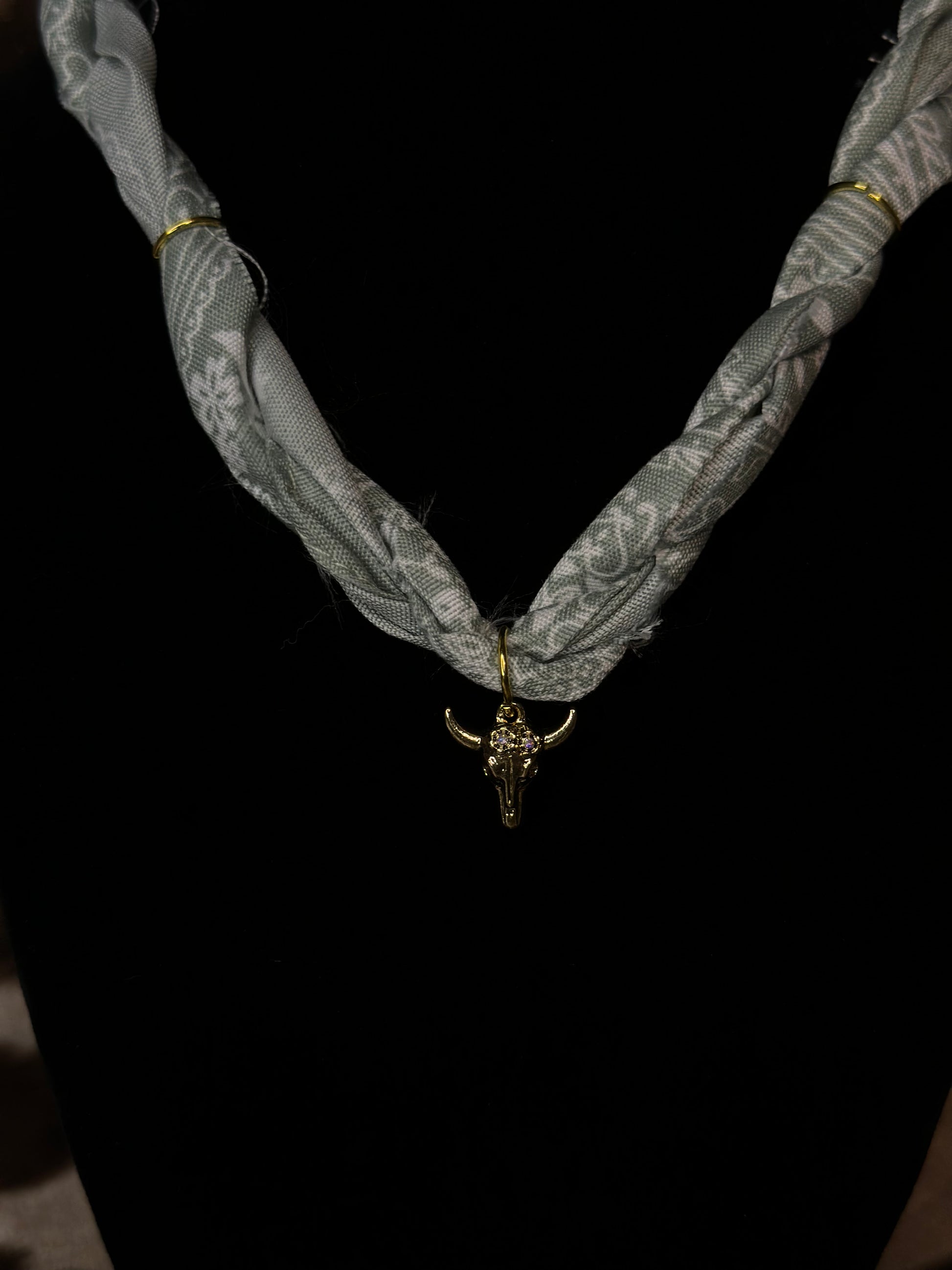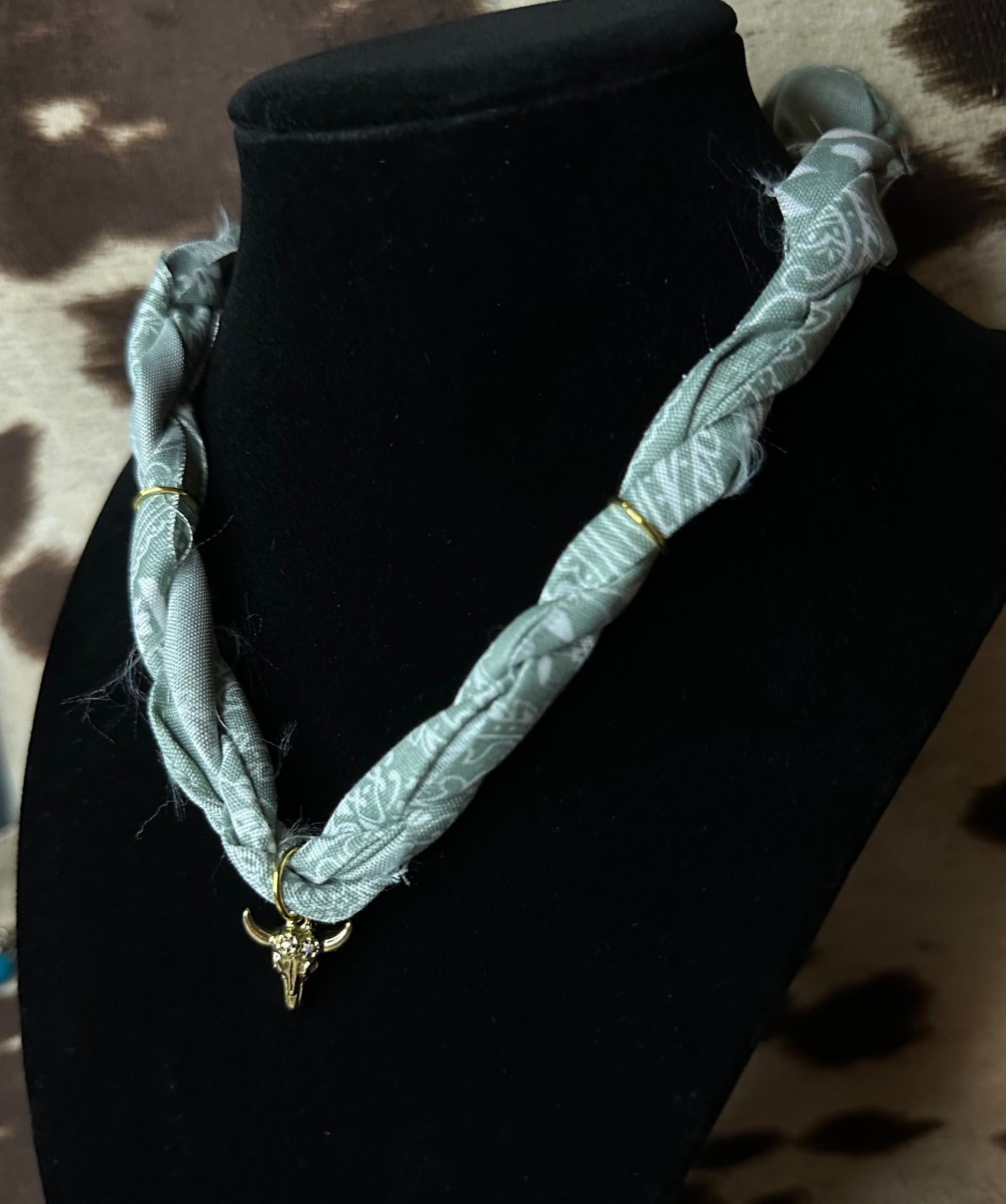 Meet your new favorite statement piece: Prairie Smoke. This western-inspired necklace features a soft, sage green paisley bandana hand-twisted into a chunky, textured strand and finished with a gold longhorn charm for a true cowgirl edge.