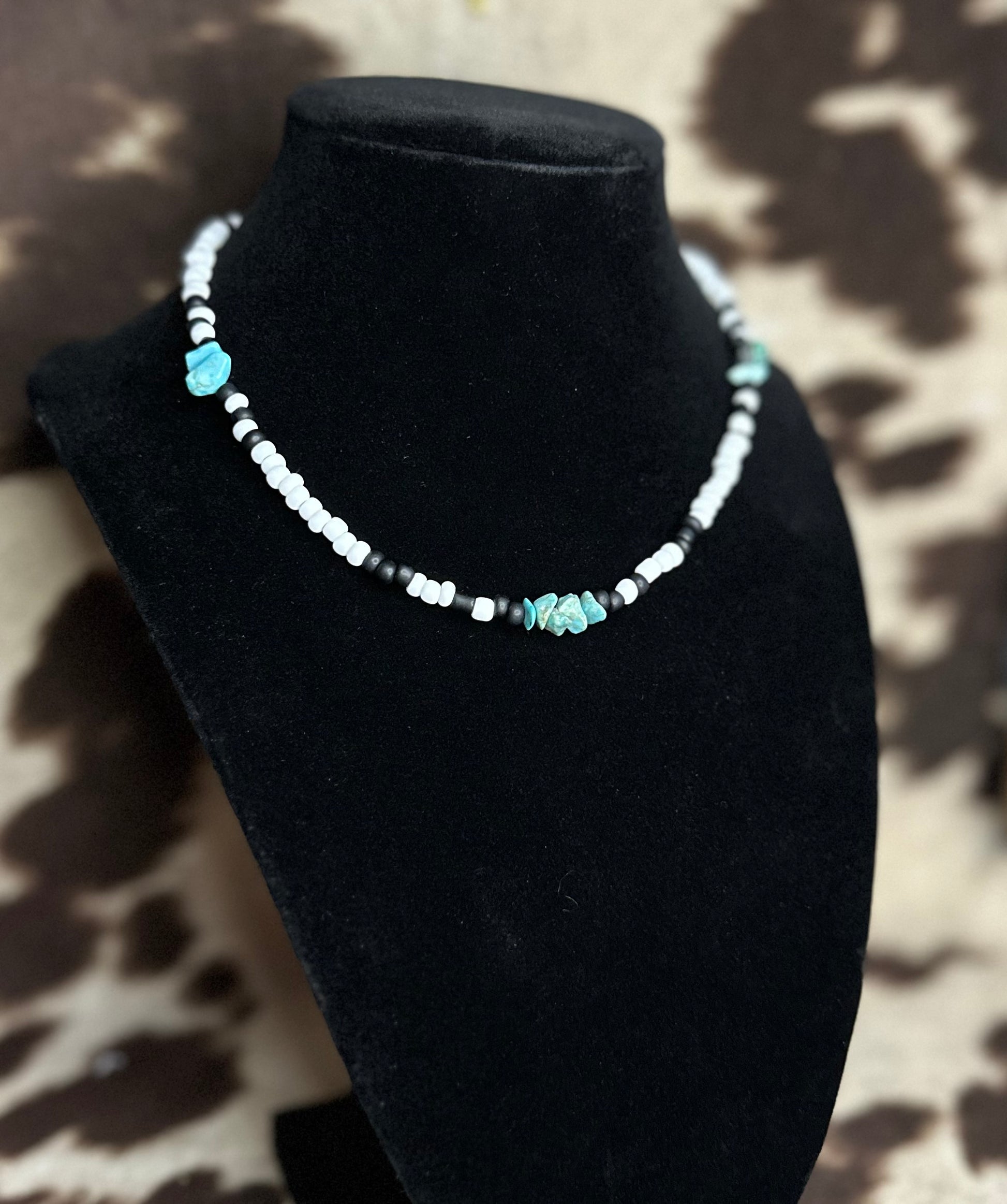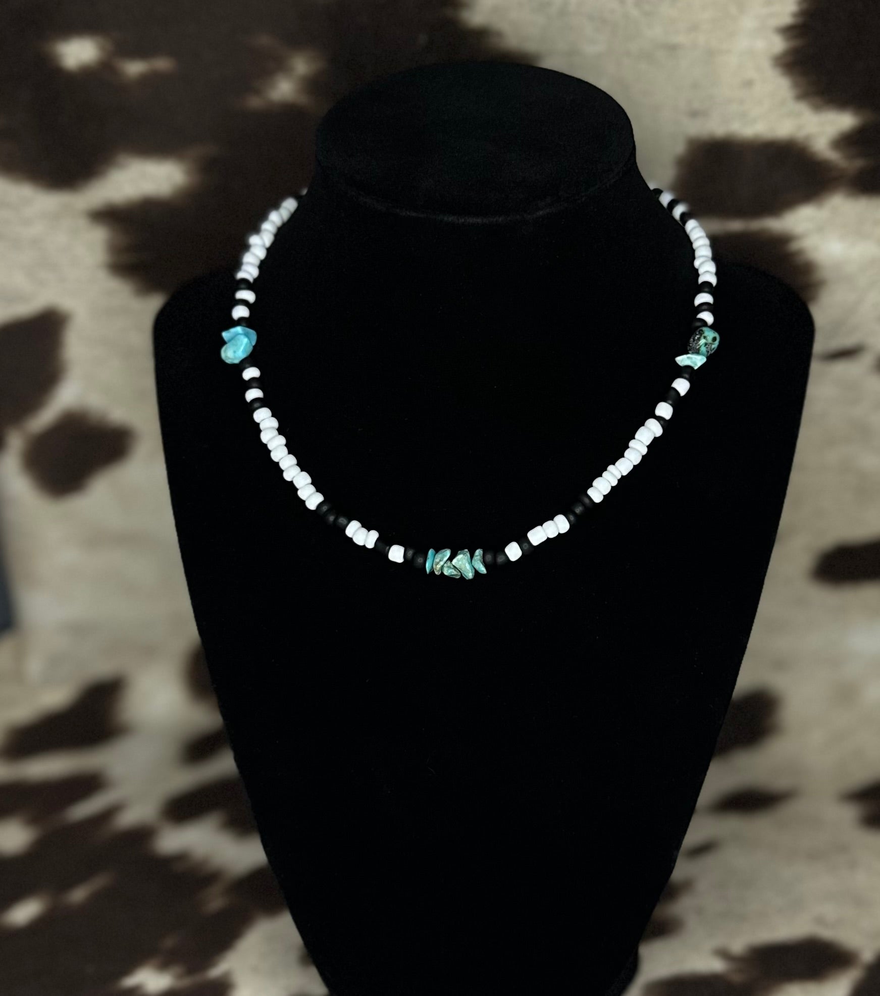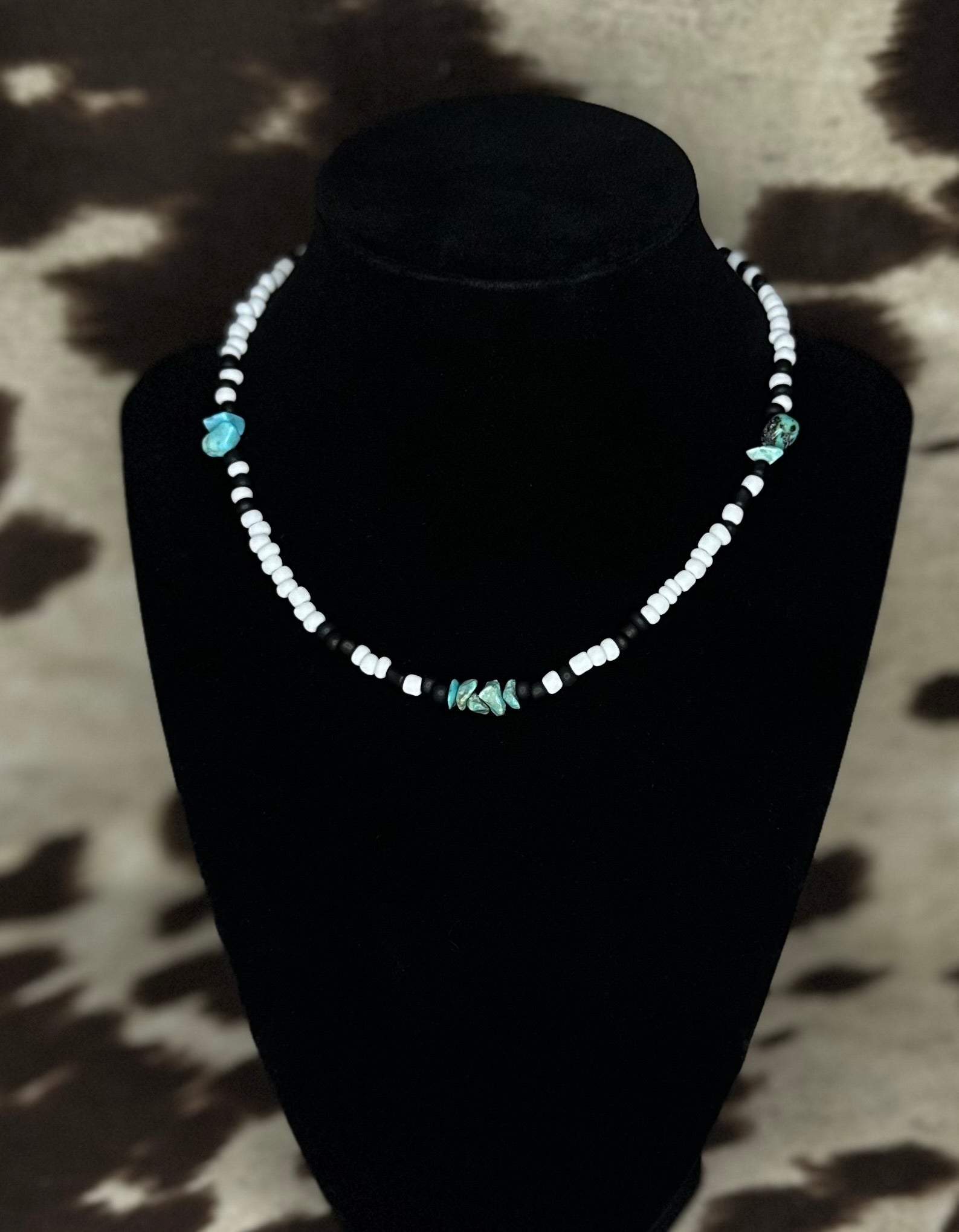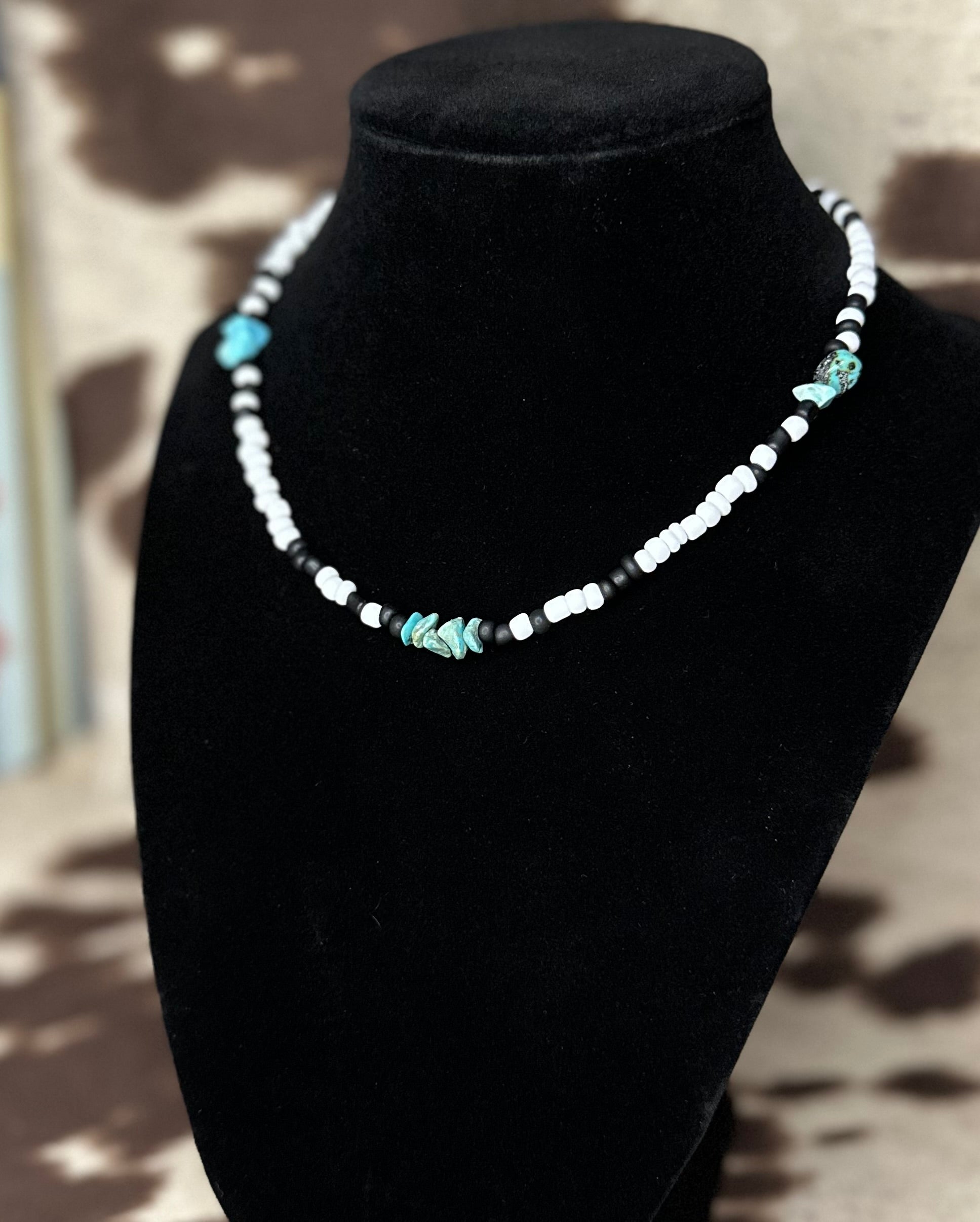 Ridge Runner is a bold and effortless nod to the rugged charm of the trail and the untamed beauty of the West. This handcrafted choker features a sleek contrast of black and white beads, brought to life by striking turquoise accents that add just the right pop of color.
