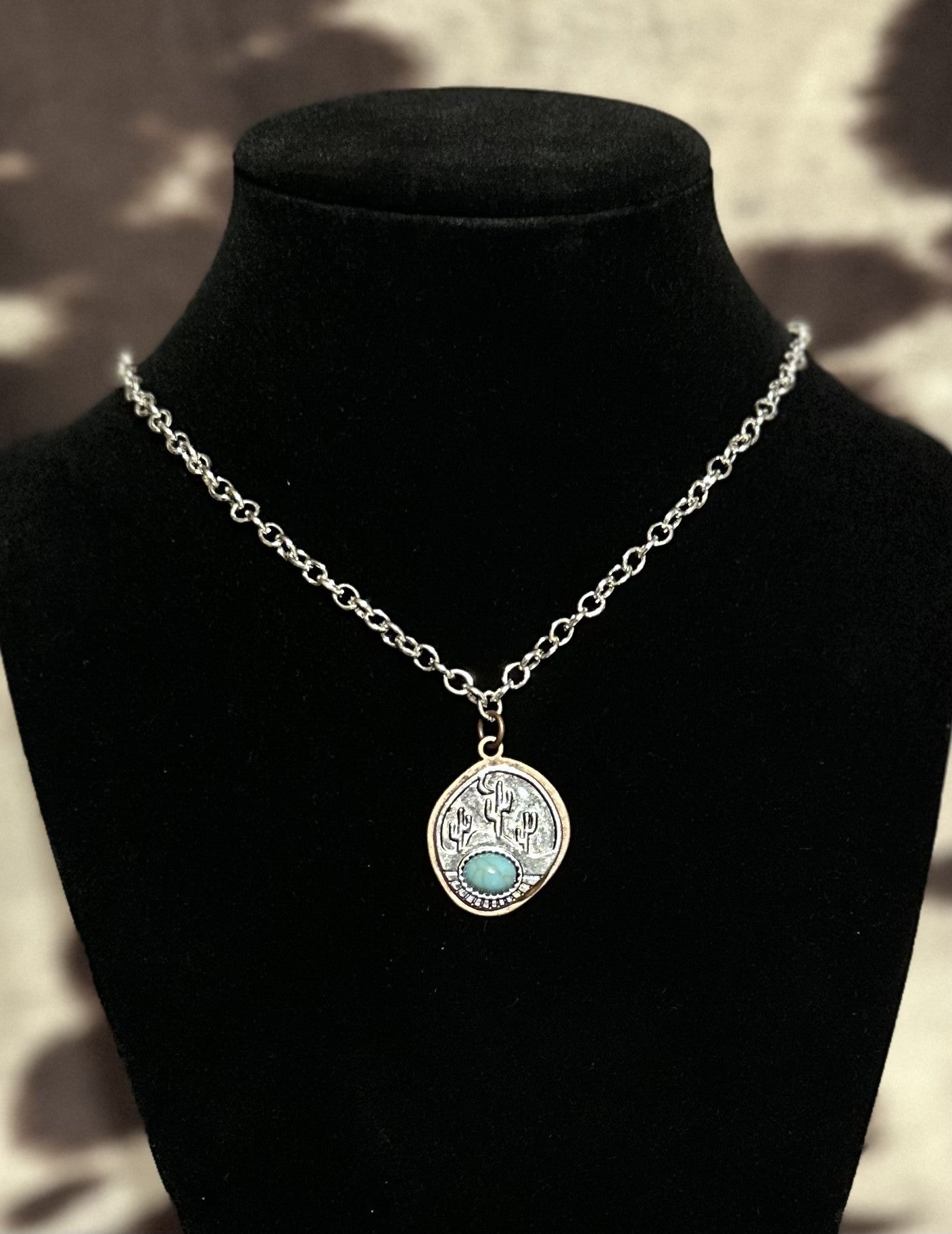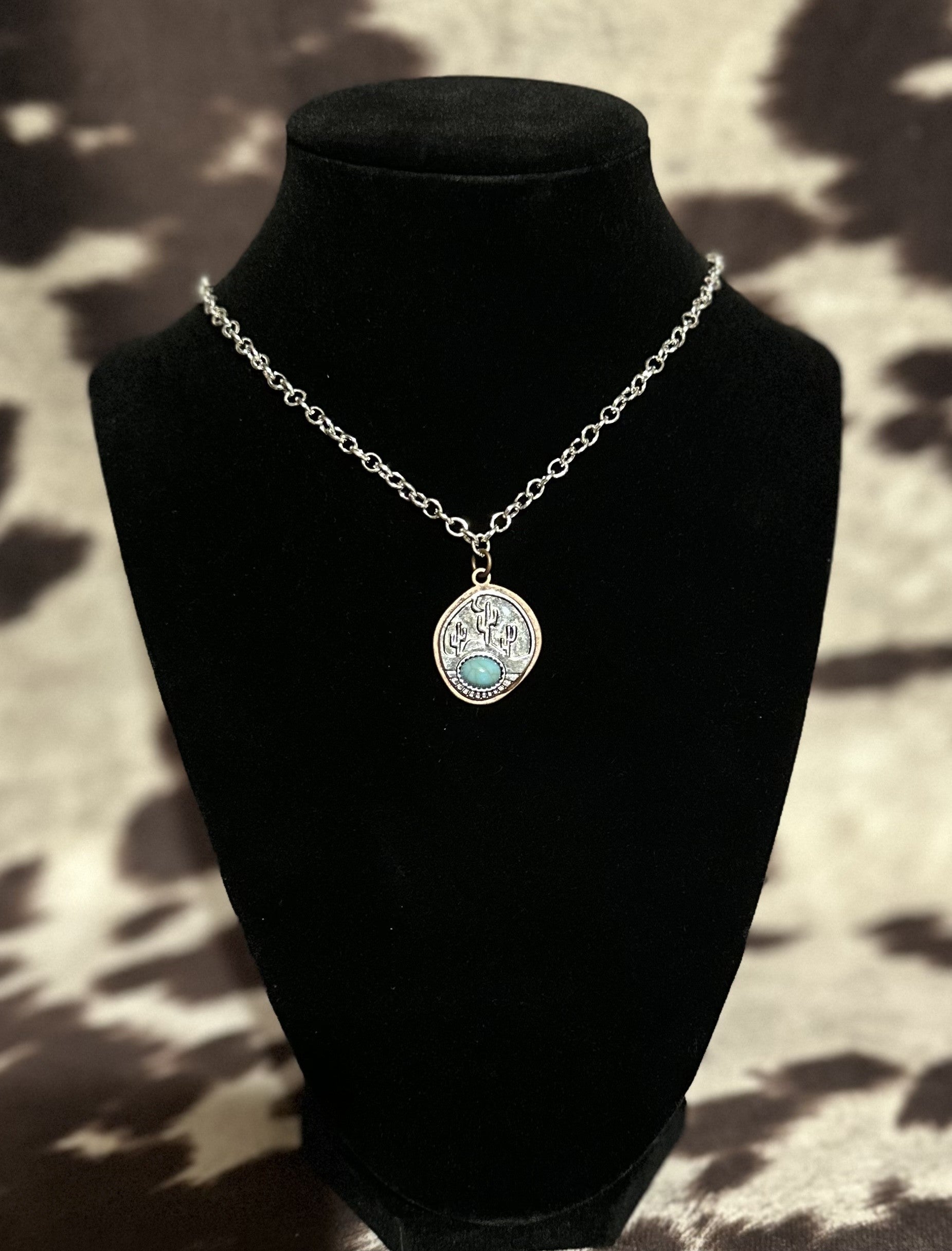 Necklace: Round cactus pendant with turquoise bead on a durable silver-tone chain