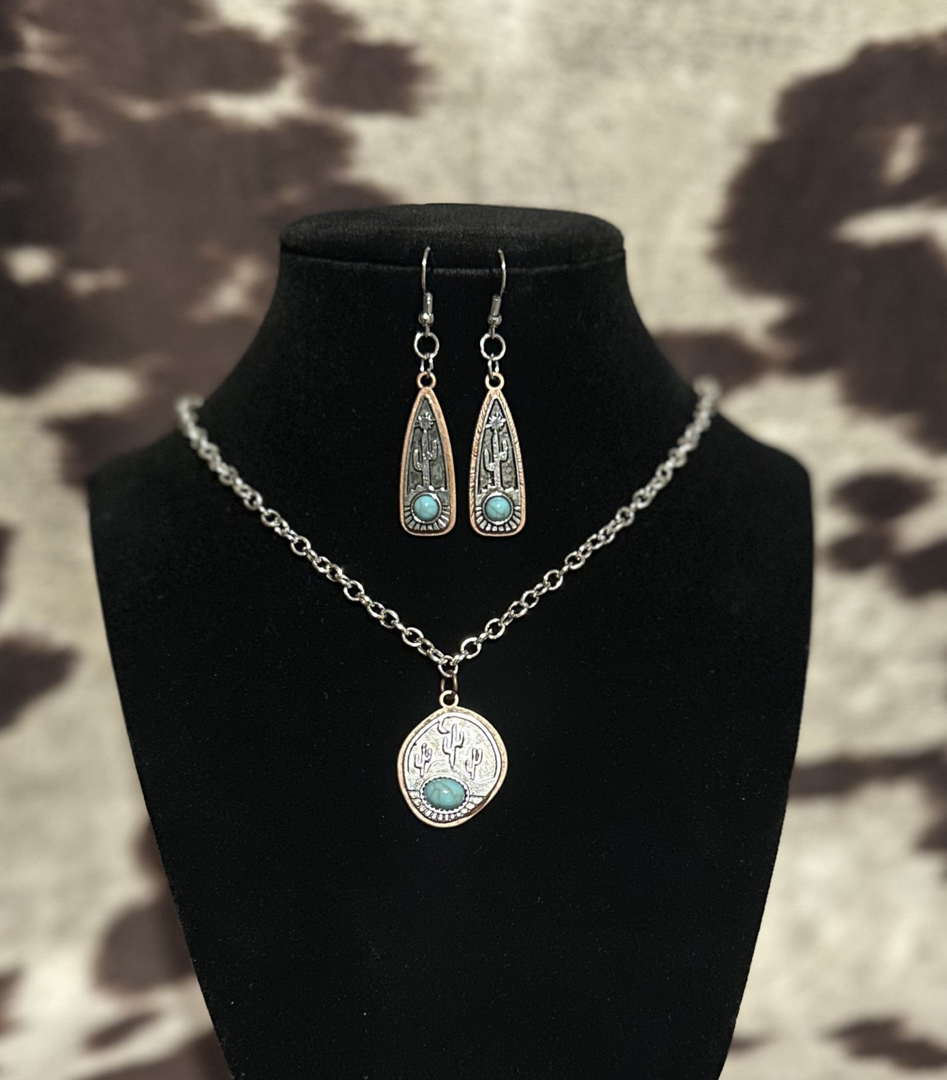 Add a touch of desert charm to your look with the Rustic Rose jewelry set. This handcrafted set includes a matching necklace and dangle earrings featuring intricate cactus engravings and turquoise-colored stones. The antique silver and bronze tones blend beautifully to create a rustic, vintage-inspired finish that pairs perfectly with your Western wardrobe.