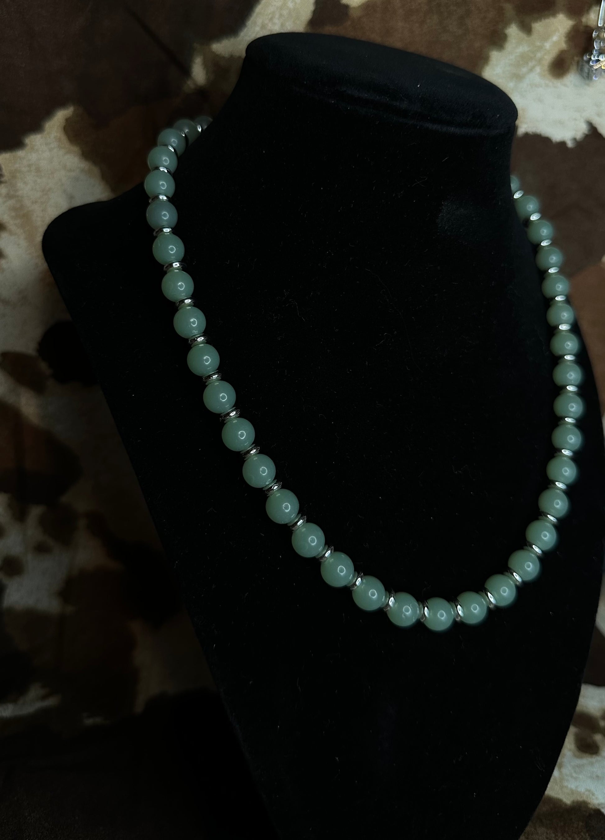 Grounded in calm, cool tones and handmade with care, the Saddle Sage necklace brings rustic elegance to your everyday look. Featuring smooth sage green beads separated by silver-toned spacers and finished with a secure silver lobster clasp, this piece rides the line between classic western and refined charm.