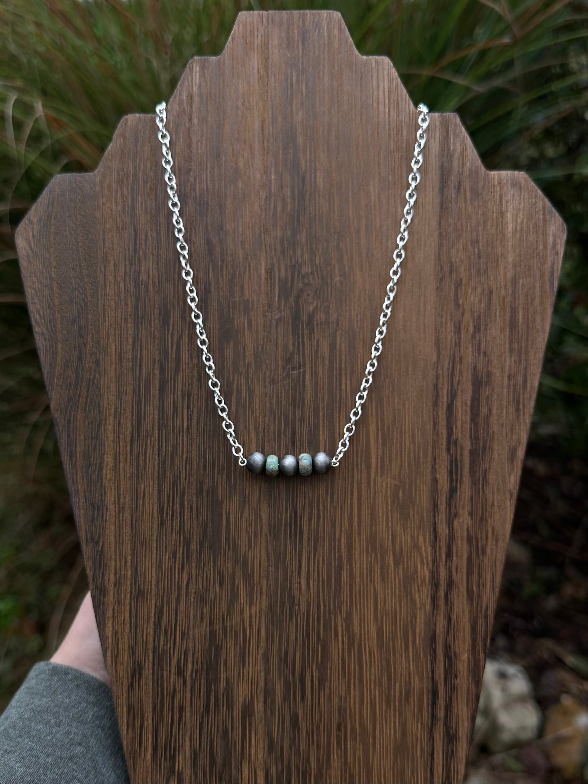 The Sage Creek Necklace captures the spirit of the West with its mix of serpentine jasper stones and faux Navajo pearls. Designed in a sleek bar chain style, this piece blends earthy greens with soft silver tones for a look that’s both natural and timeless.