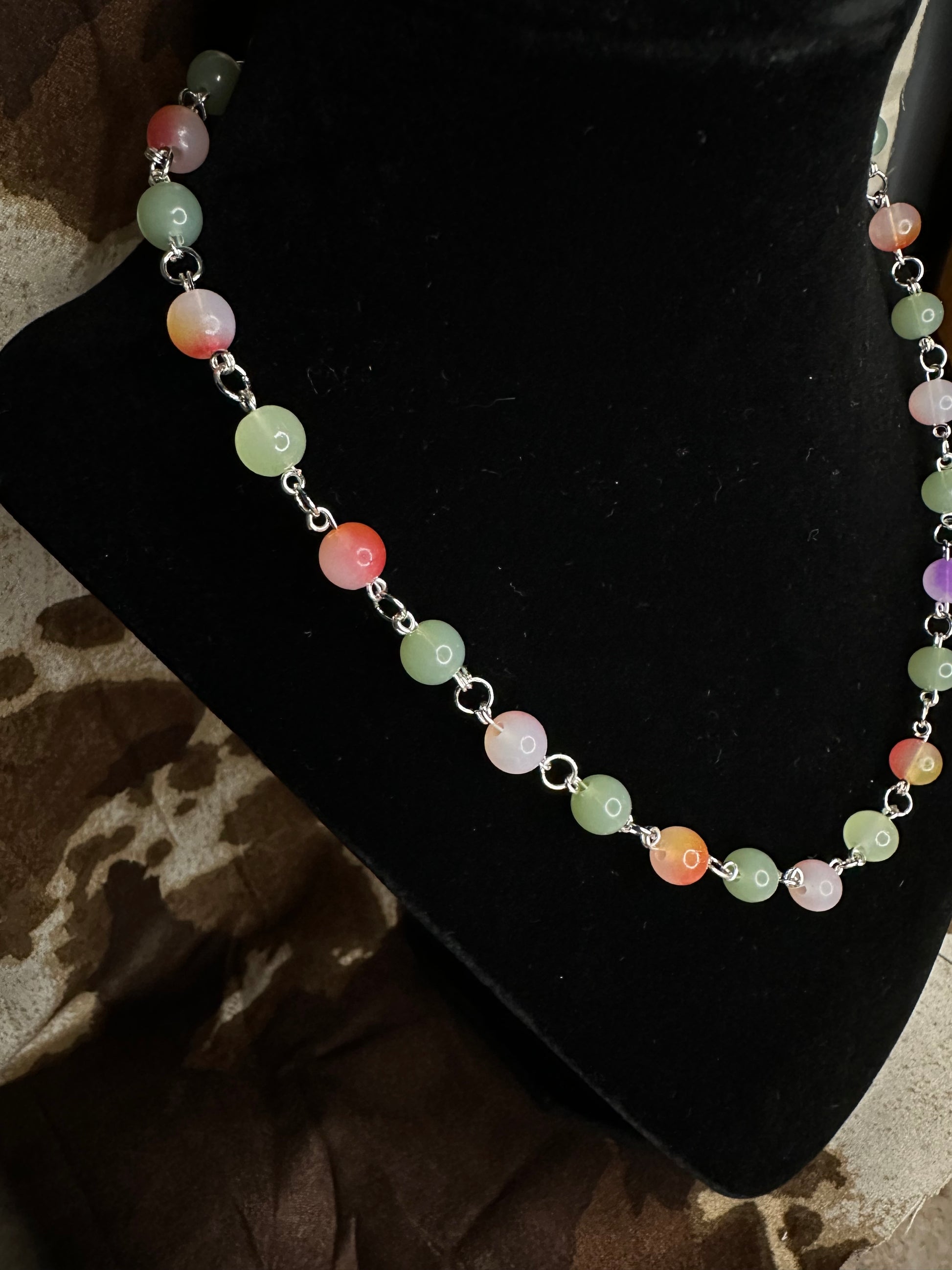 Capture the warm, glowing hues of a summer evening with Sangria Sunsets, a beautifully handcrafted necklace that brings coastal elegance to your everyday style. This delicate piece features light, coastal-colored round beads artfully hand-wrapped on wire, paired with a sleek silver chain for a perfect balance of beachy charm and polished sophistication.