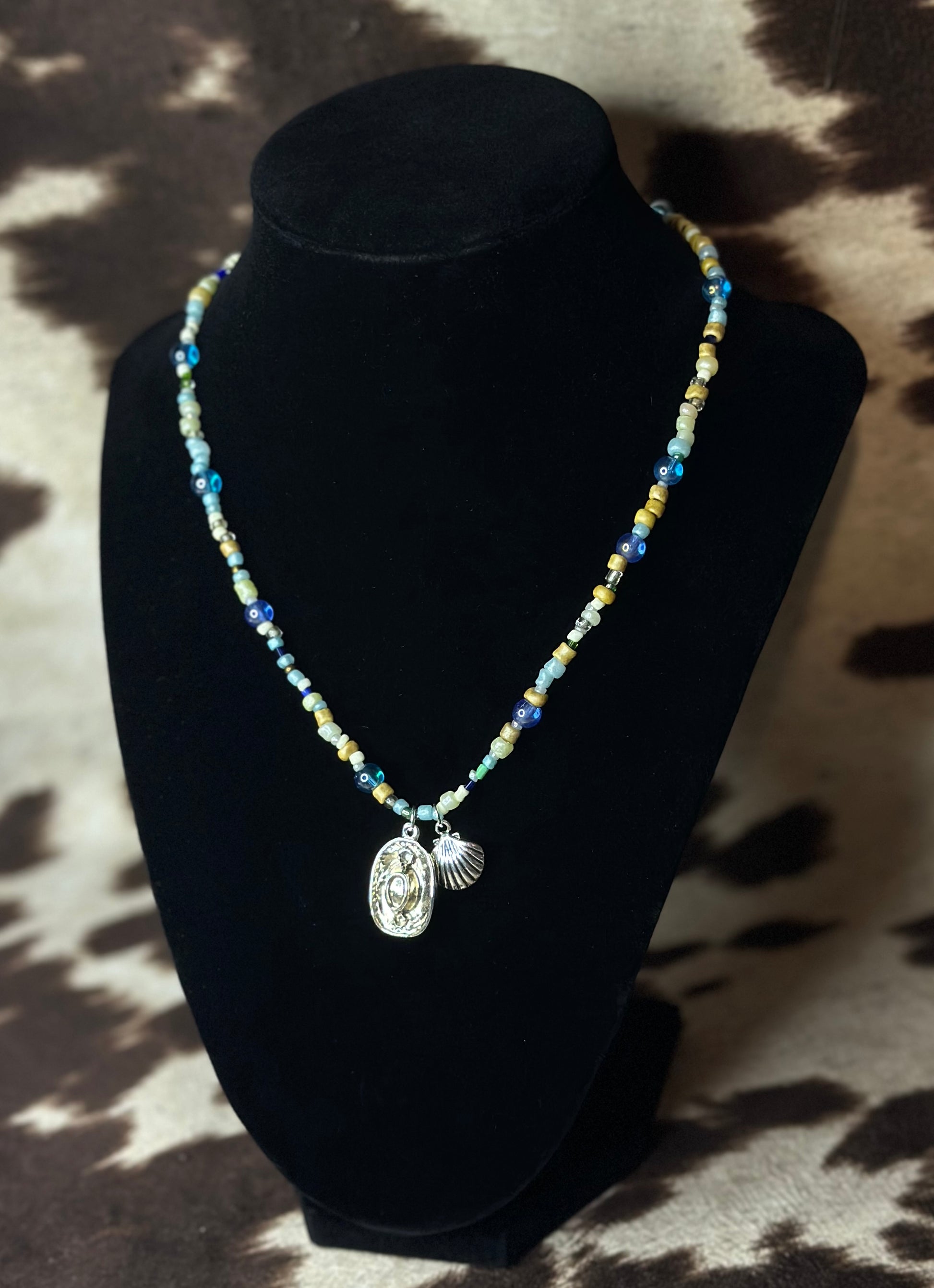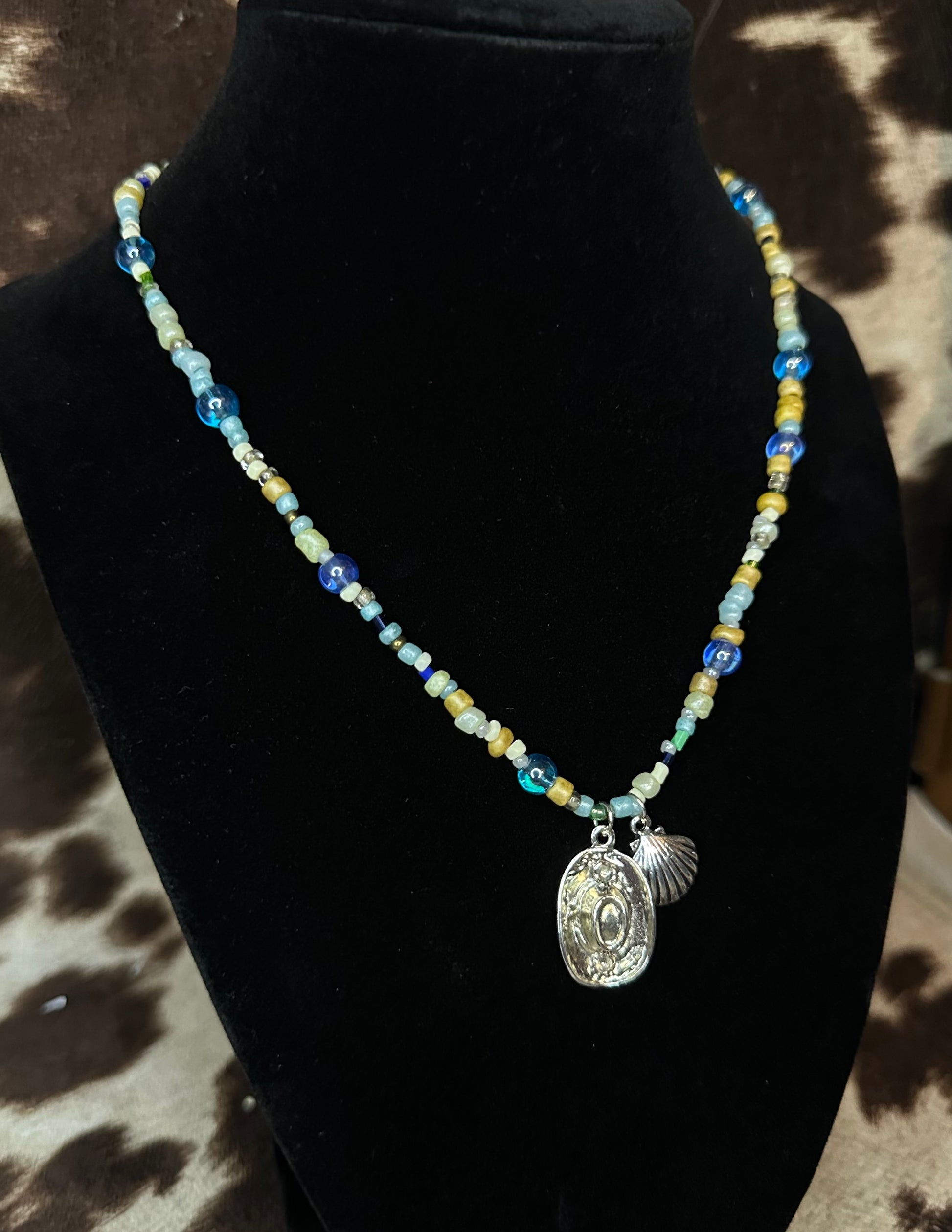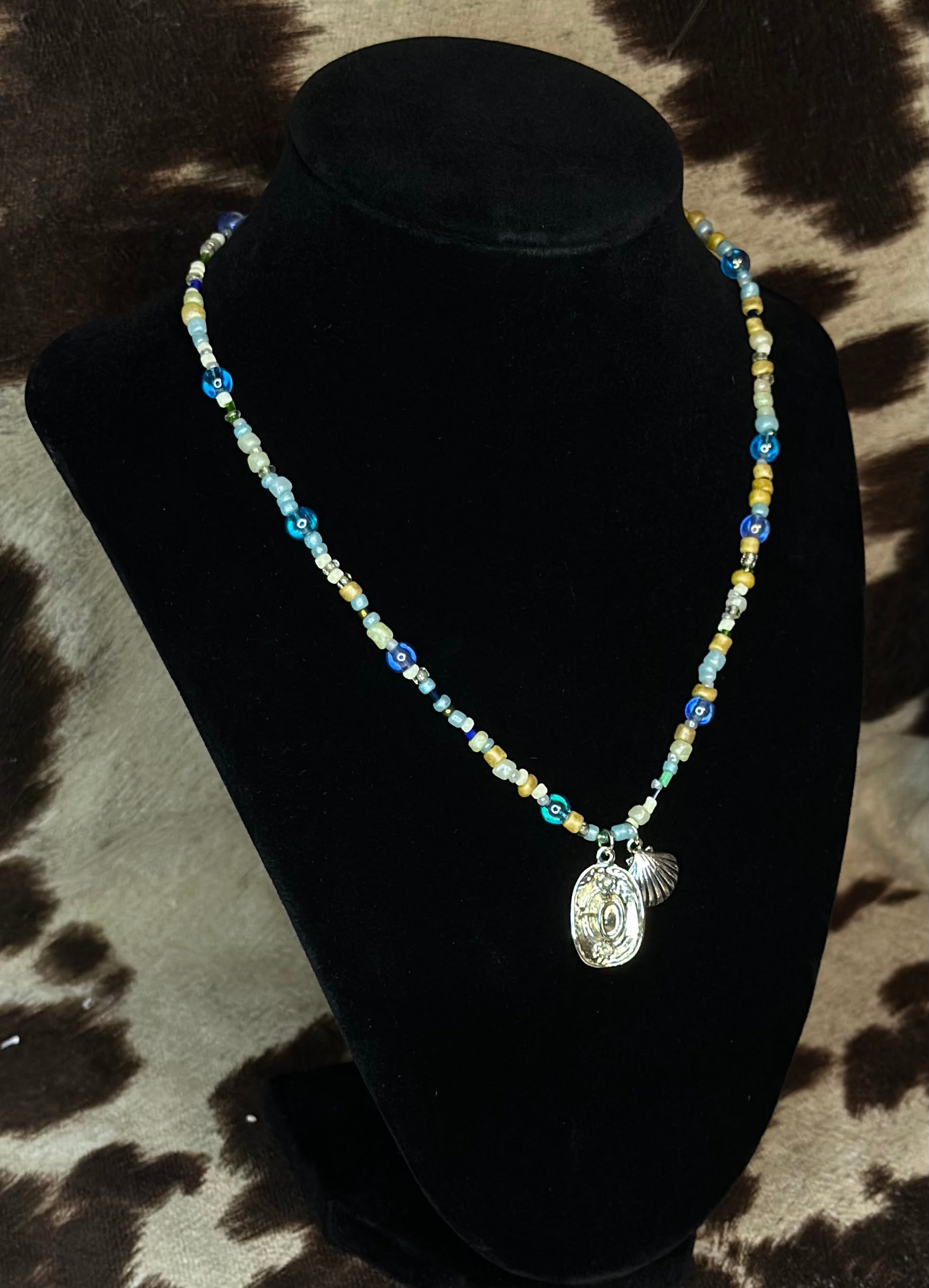 Finished with two silver-toned charms — a western-style medallion and a dainty seashell — this necklace is made to ride through sun, salt, and splash.