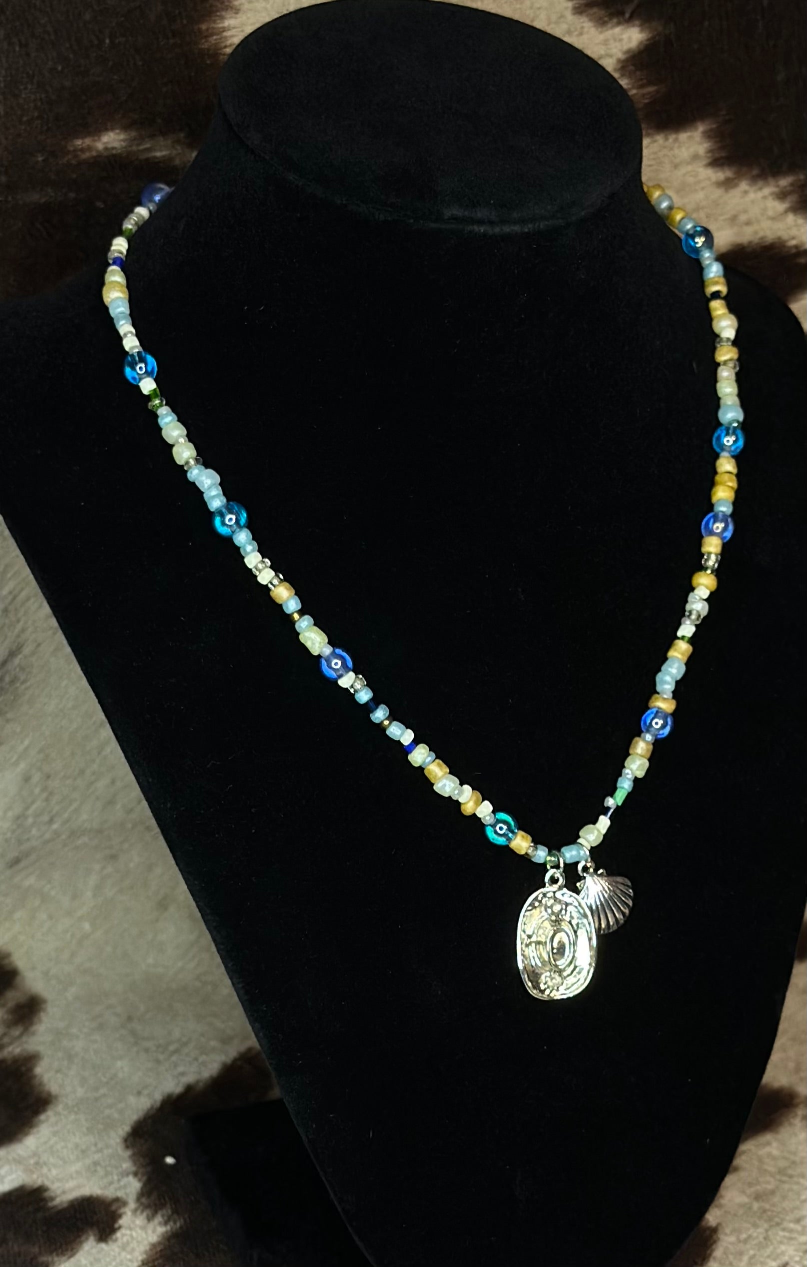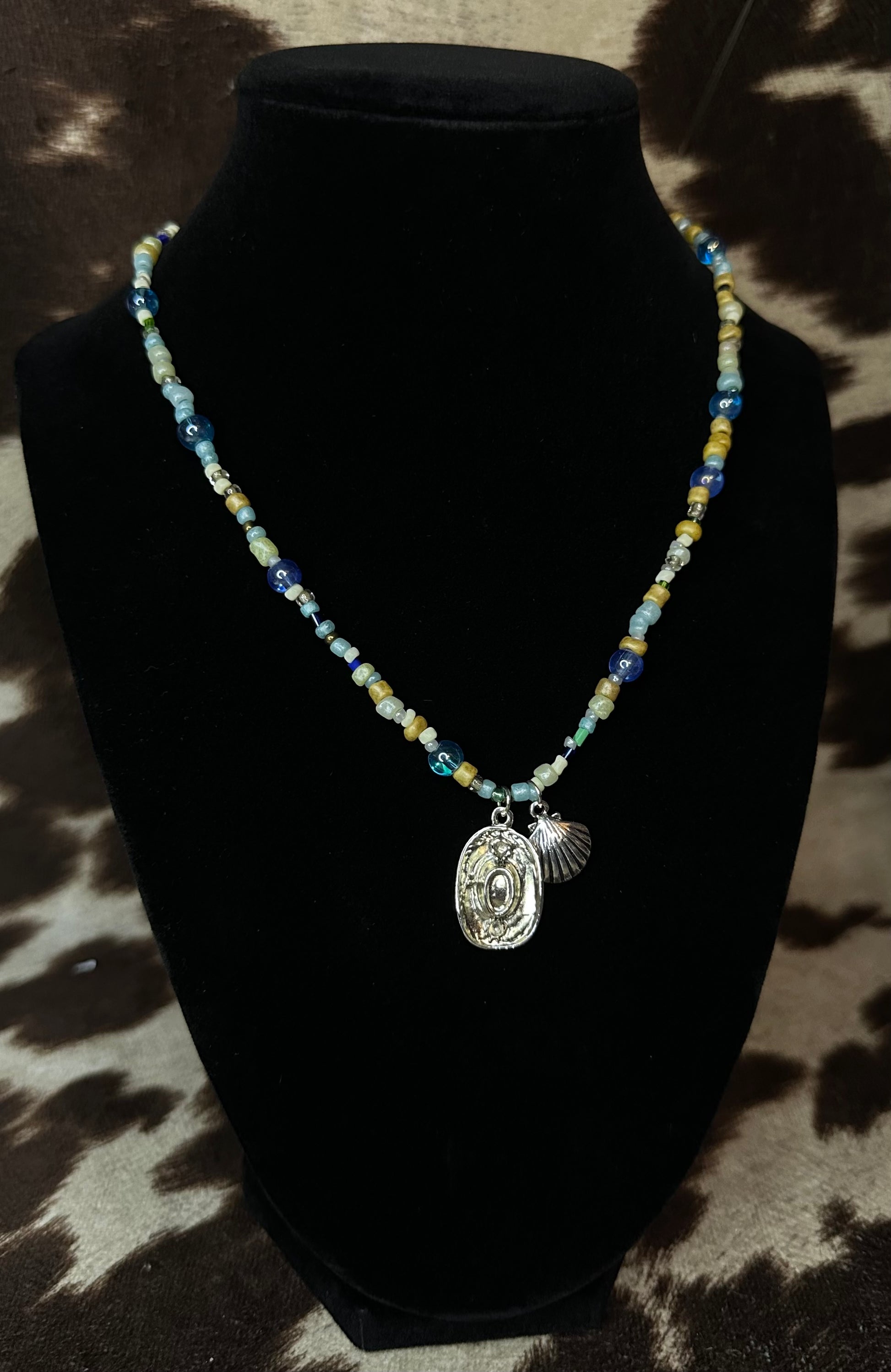 Saddle up for the coast with Seashell Spurs — a waterproof beaded necklace made for the wild and free. Featuring a mix of sea blues, sandy neutrals, and sunshine tones, this handcrafted piece is the perfect blend of western soul and beachy freedom.