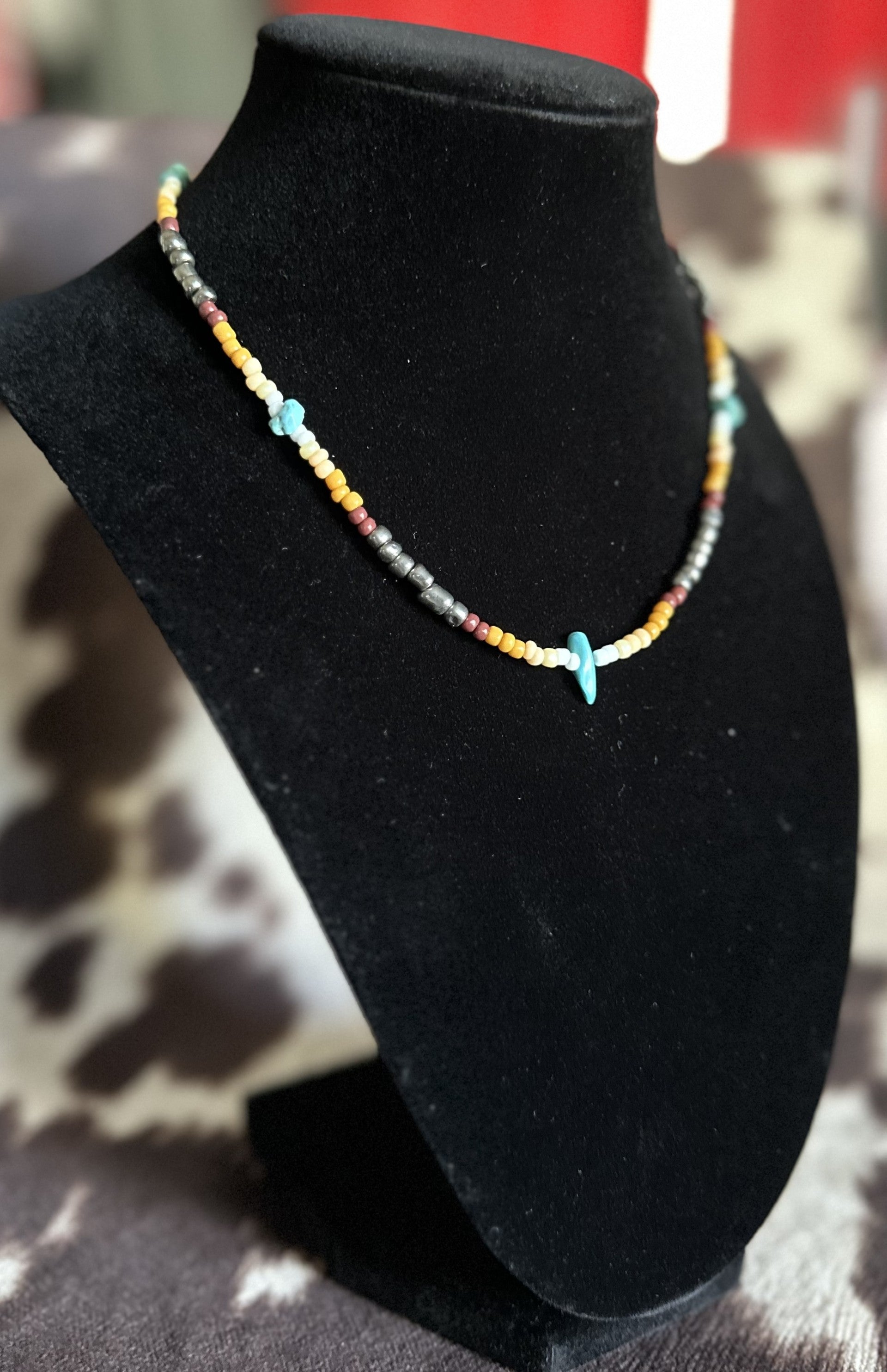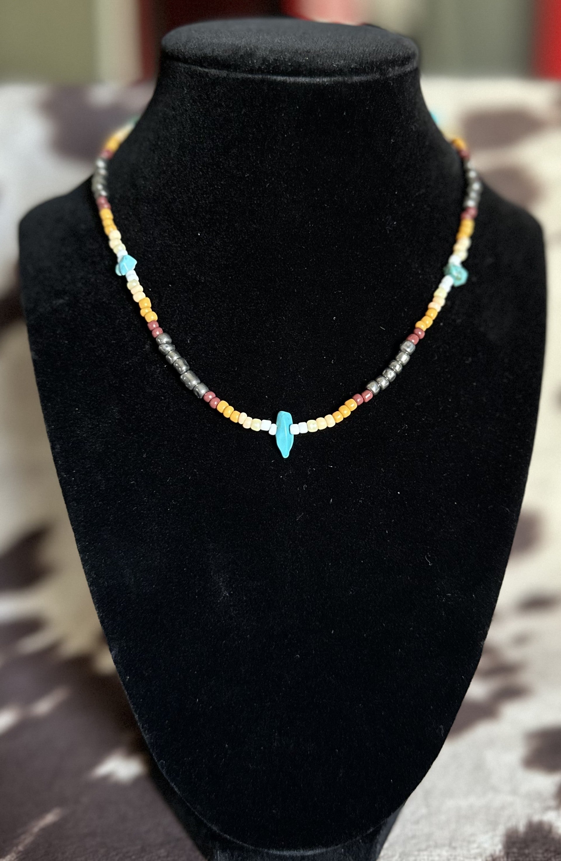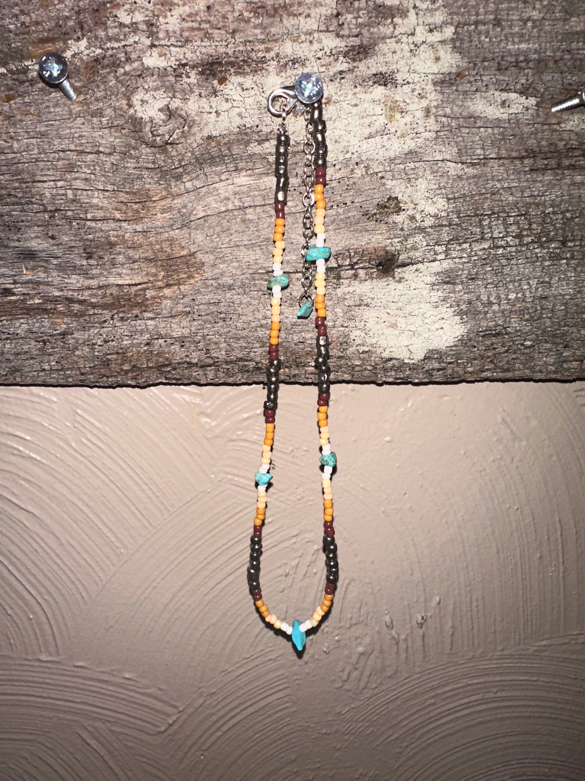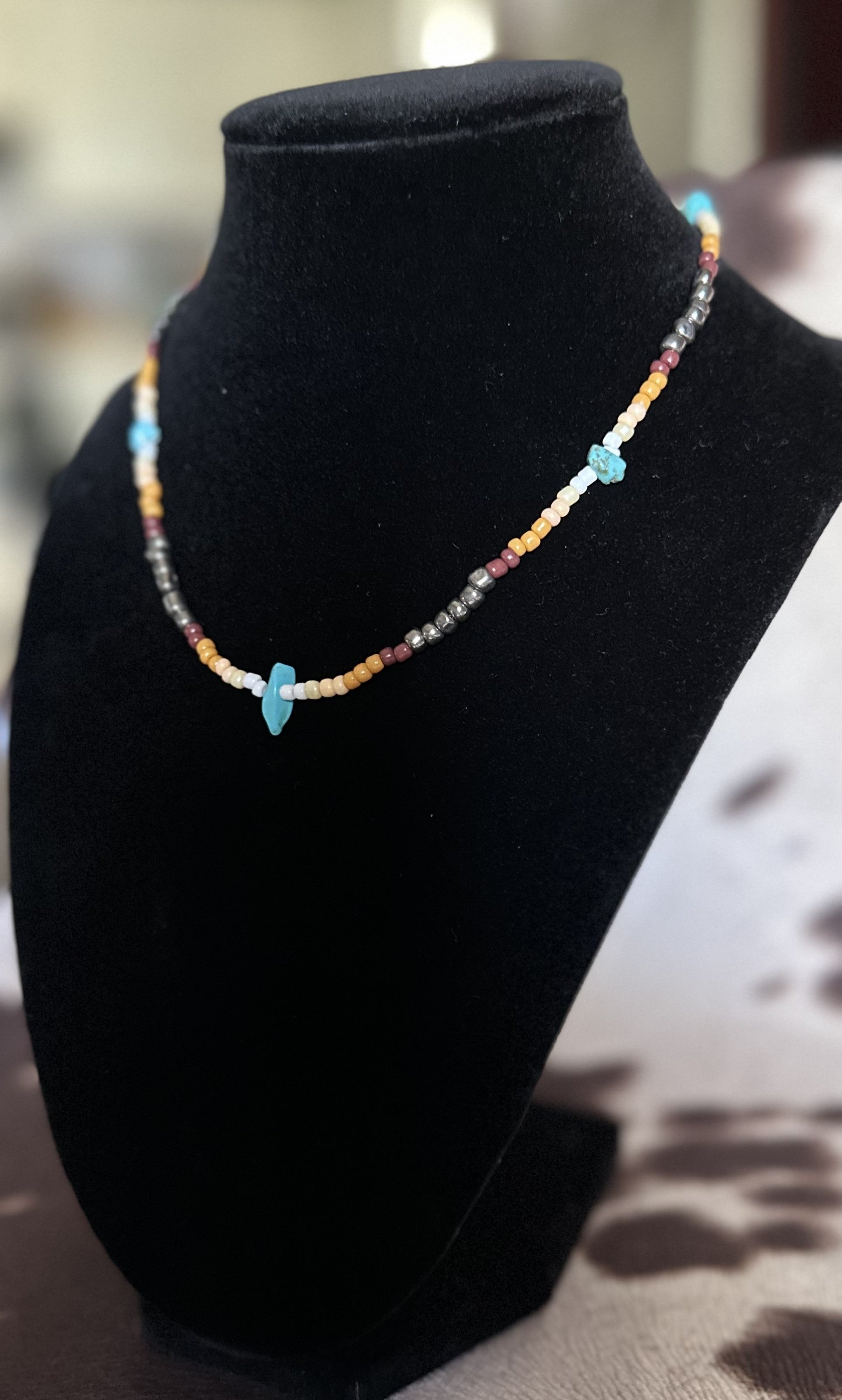 Channel the warmth and beauty of the Southwest with the Sedona Skies beaded necklace. Handcrafted with a stunning mix of earthy tones, silver accents, and vibrant turquoise, this choker-style necklace captures the essence of a desert sunset. Whether you’re dressing up your everyday look or adding a boho touch to a special outfit, this piece is perfect for any occasion.