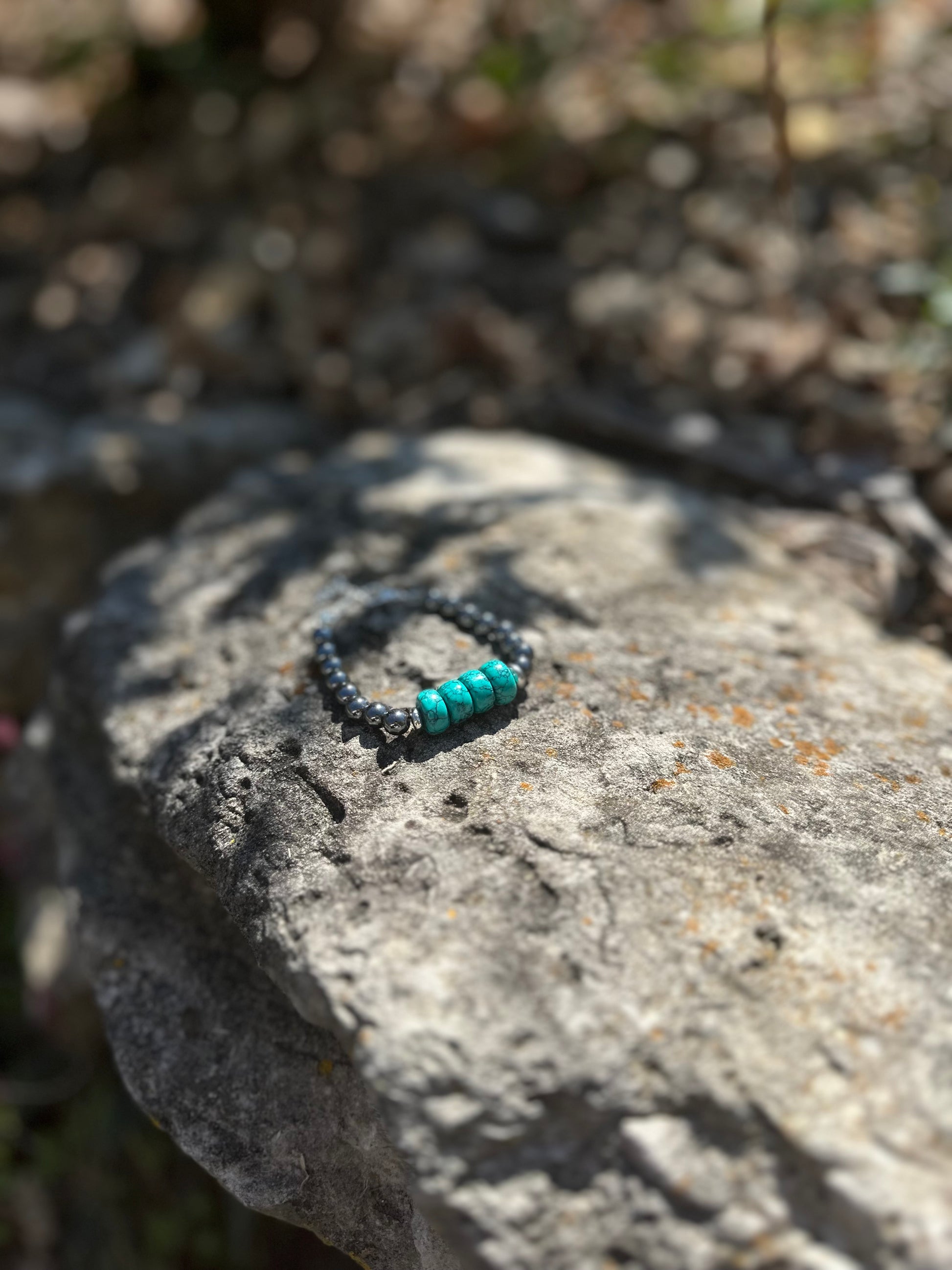 The Silver Sage bracelet brings rustic charm and everyday elegance together in one versatile piece. Featuring hematite beads, faux turquoise stones, and silver spacer accents, this bracelet is a subtle nod to western style with a touch of shine.