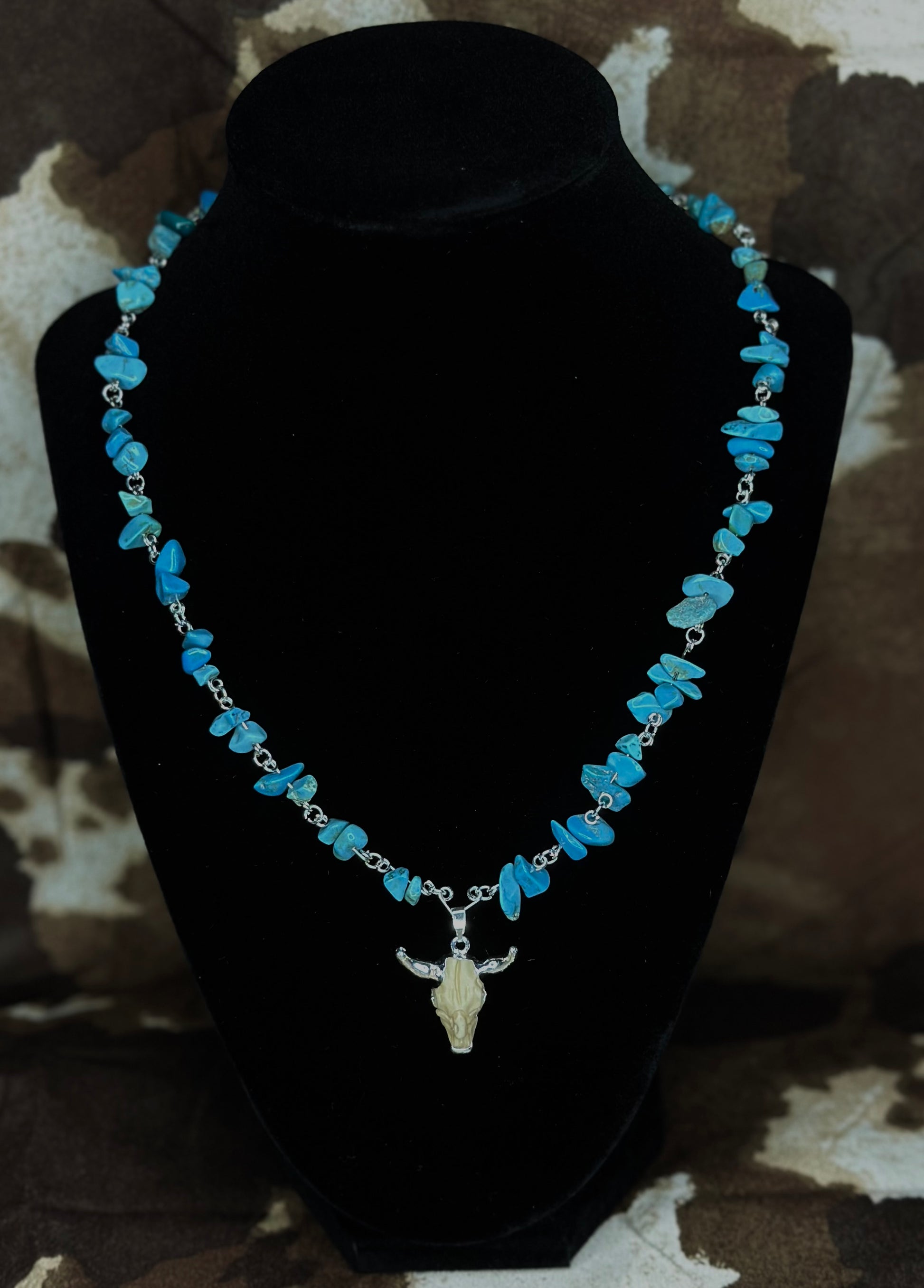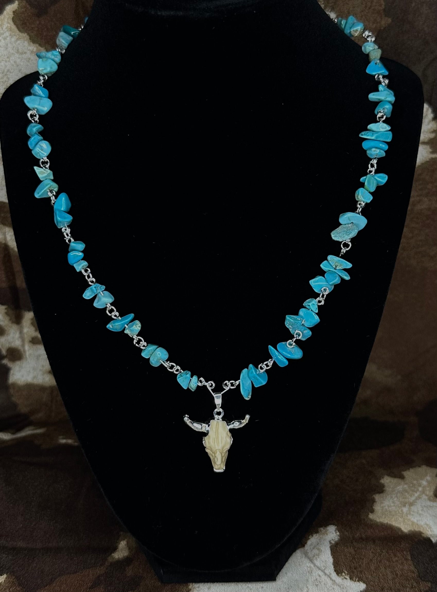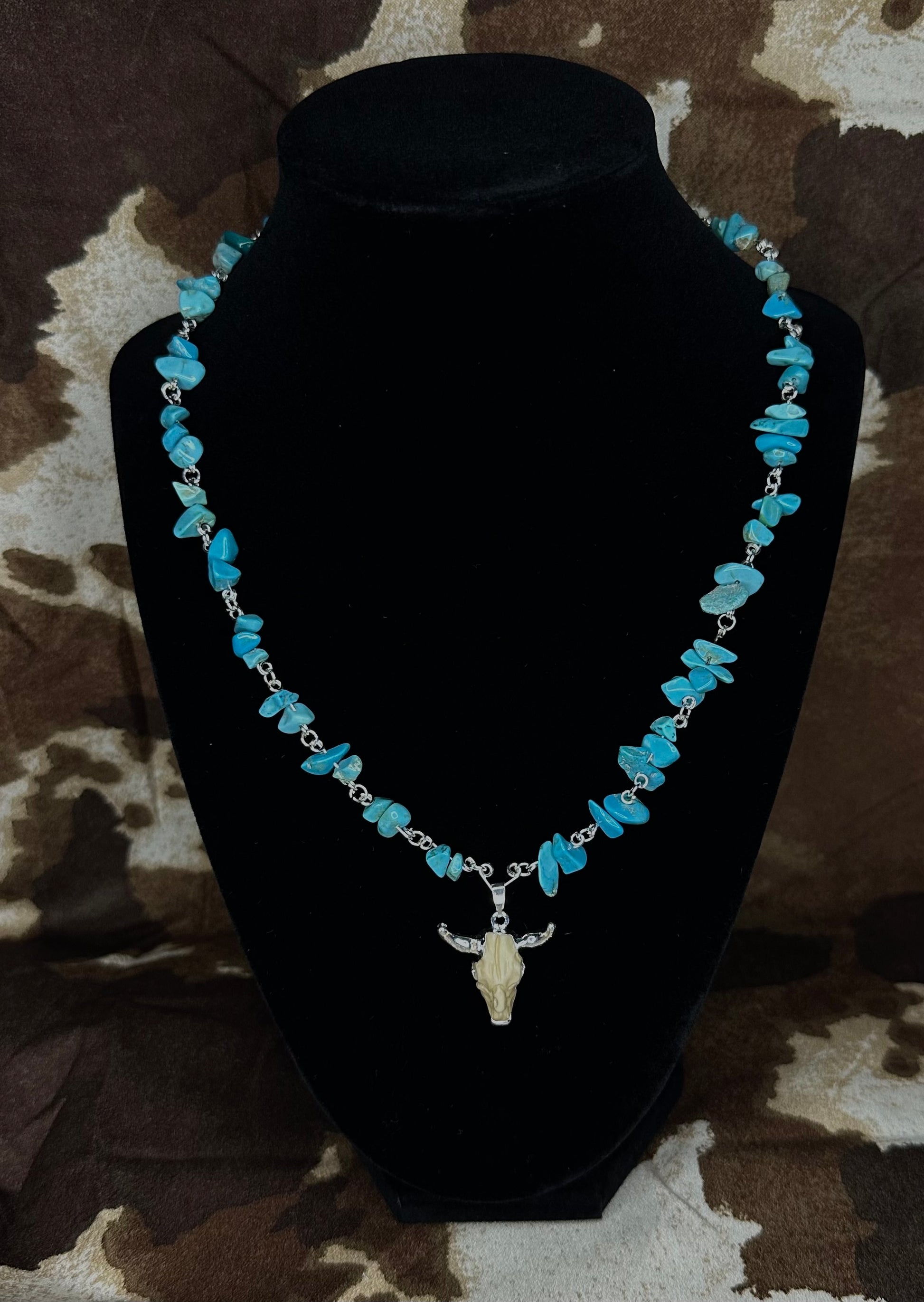 This handcrafted piece features vibrant turquoise stone chips individually wrapped on silver-toned links, leading down to a detailed cow skull charm with a rustic bone finish. Whether you’re dressing up for a rodeo, a country concert, or just adding a western edge to your everyday outfit, this necklace makes a statement.