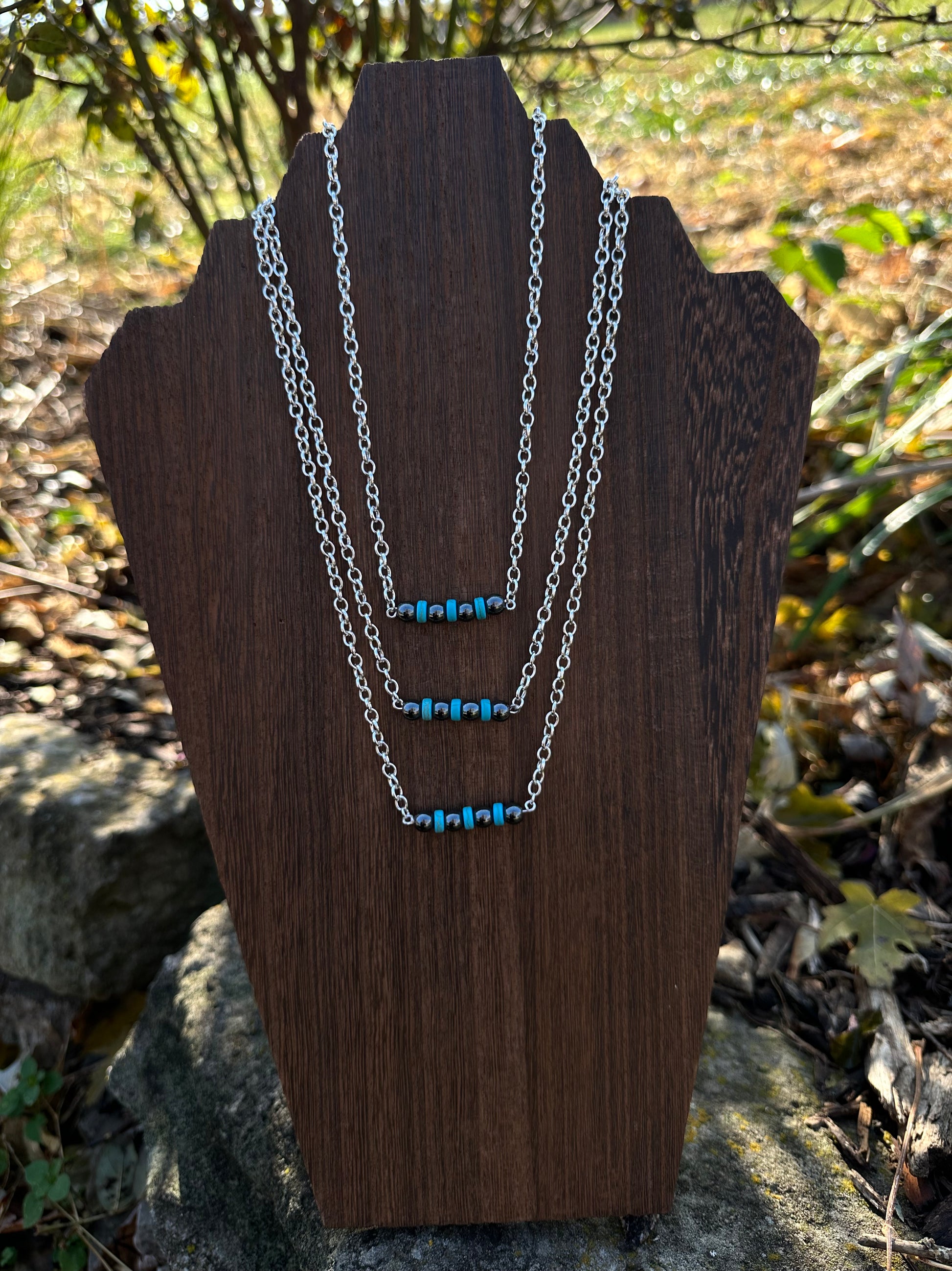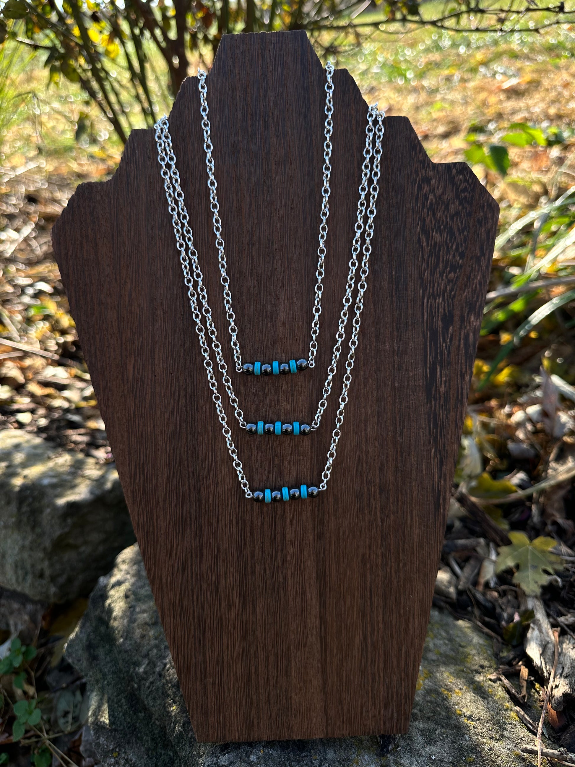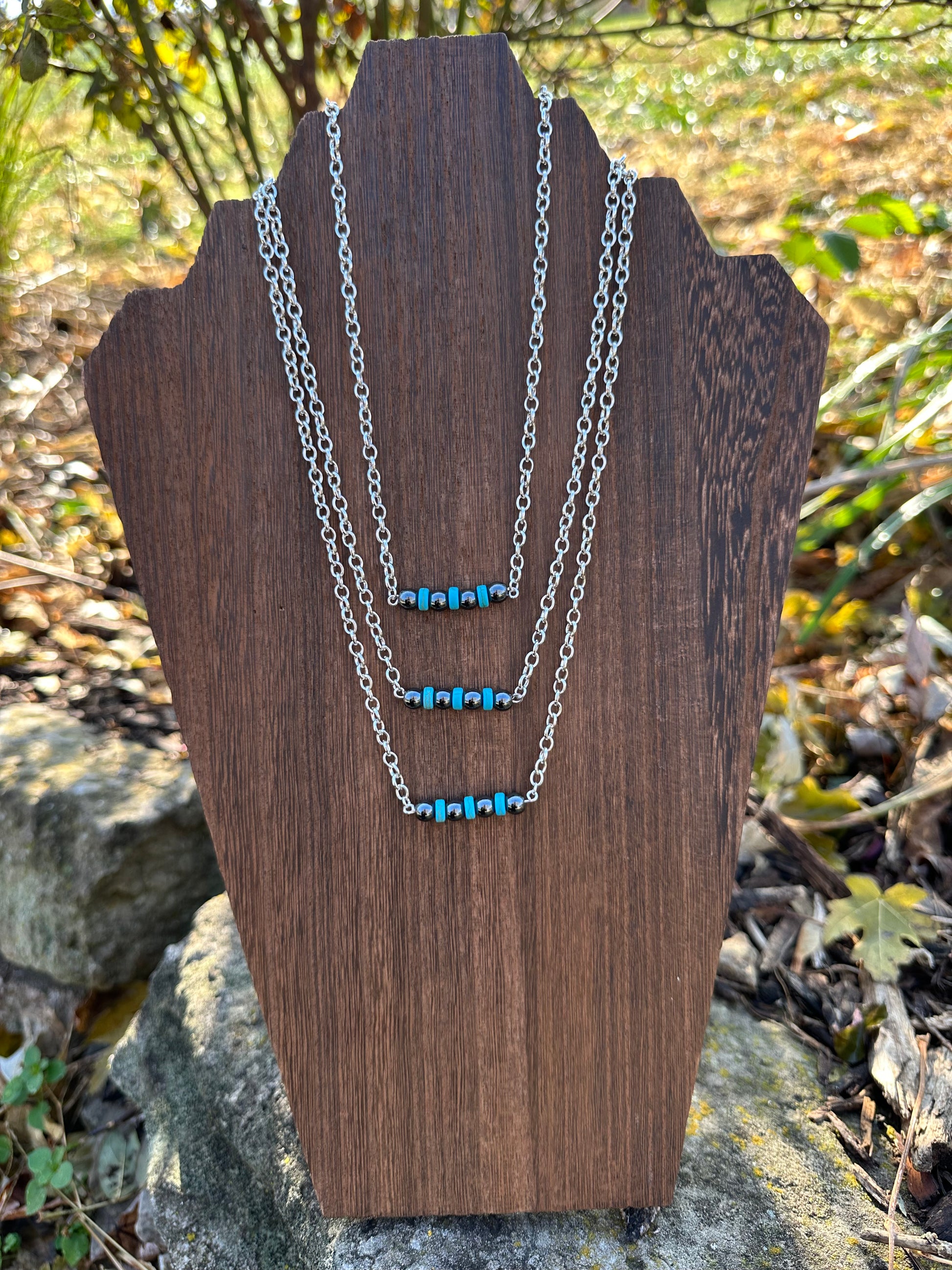 Sleek, cool-toned, and perfectly structured — the Steel Horizon bar necklace features glossy hematite beads paired with smooth cylinder spacer beads for a clean, modern western look. The bar-style design lays beautifully across the neckline, giving just the right amount of shine without being too bold.