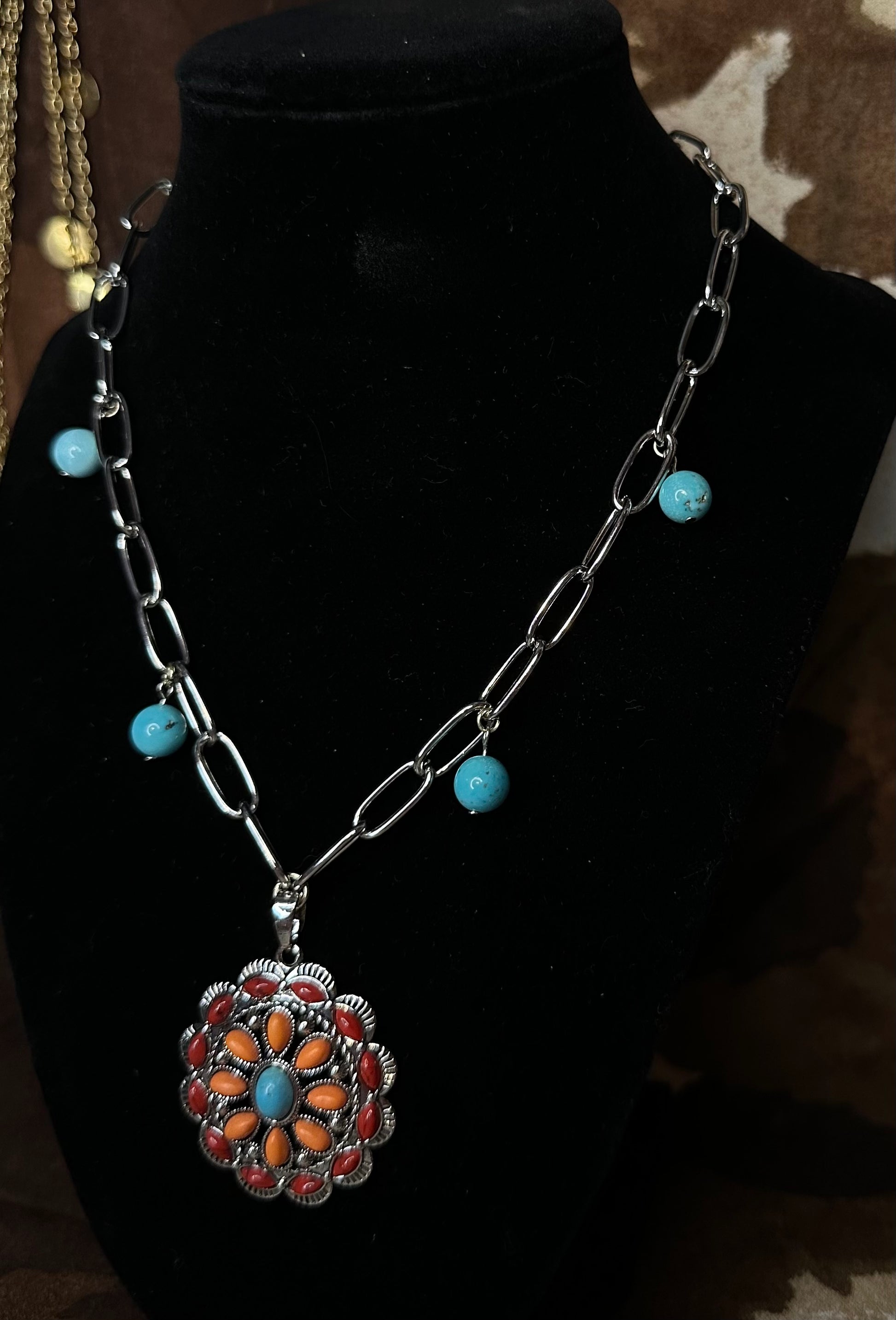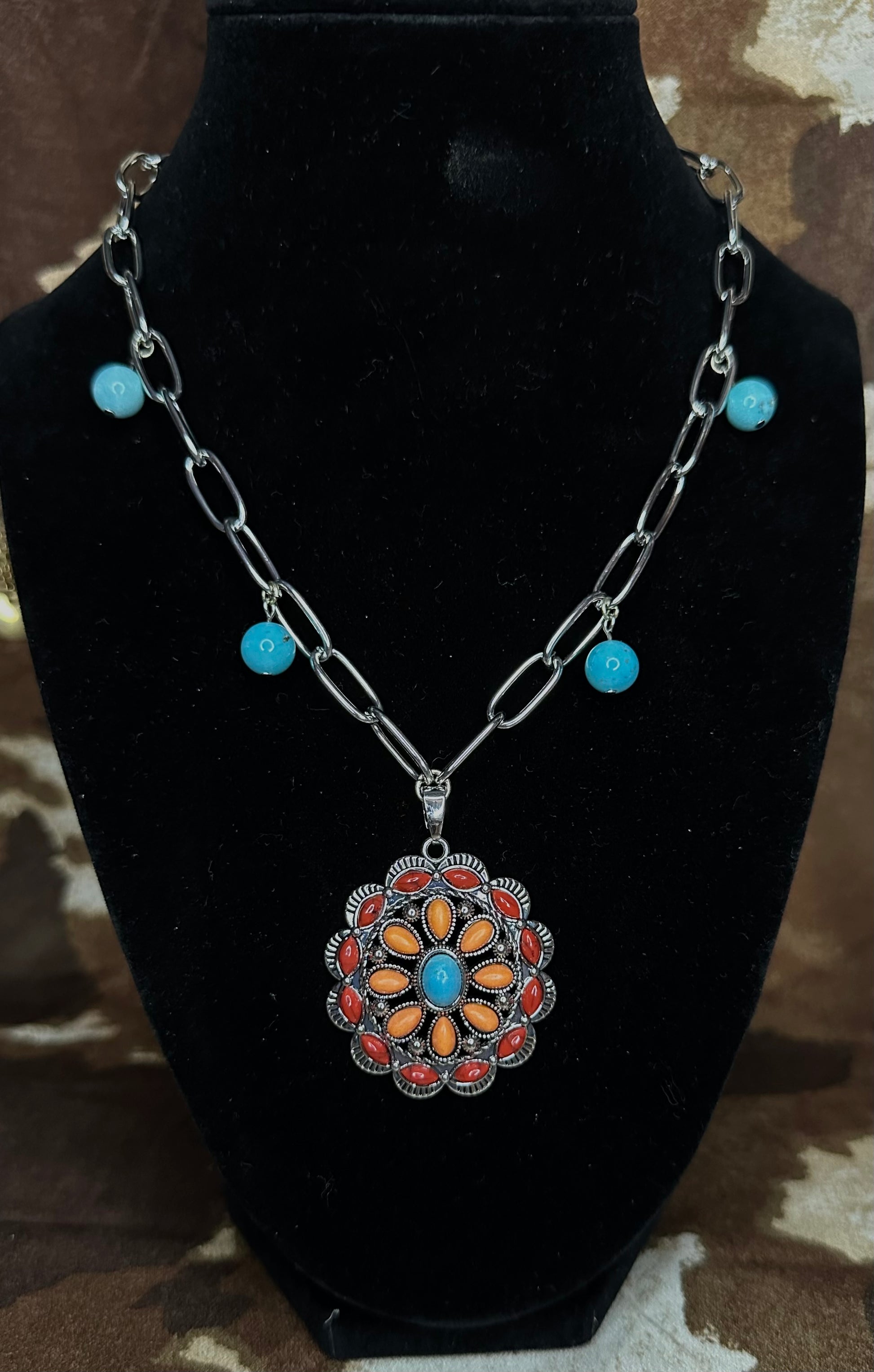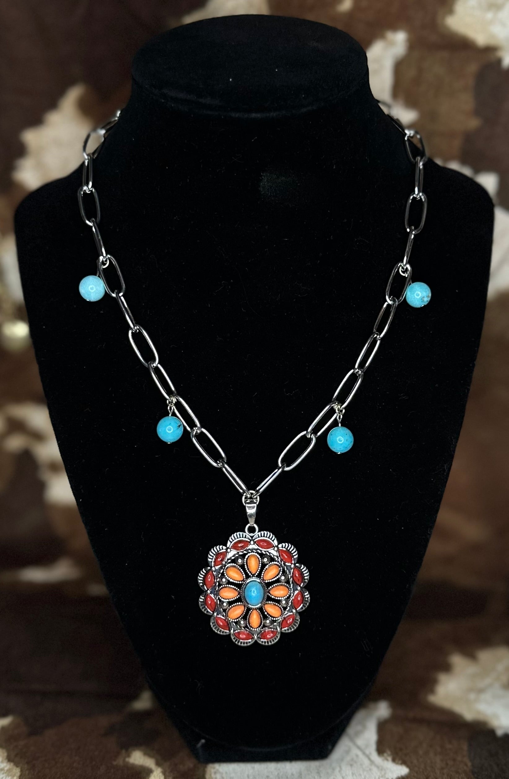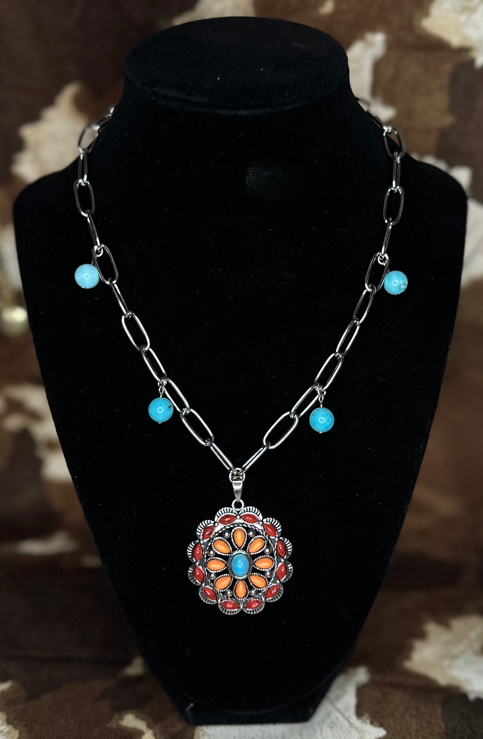 Built for the wild at heart, the Sundown Rodeo necklace brings a bold pop of desert color to your western wardrobe. A chunky silver chain holds bright turquoise bead drops and a fiery floral pendant with red, orange, and turquoise tones — all framed in vintage-style silver.