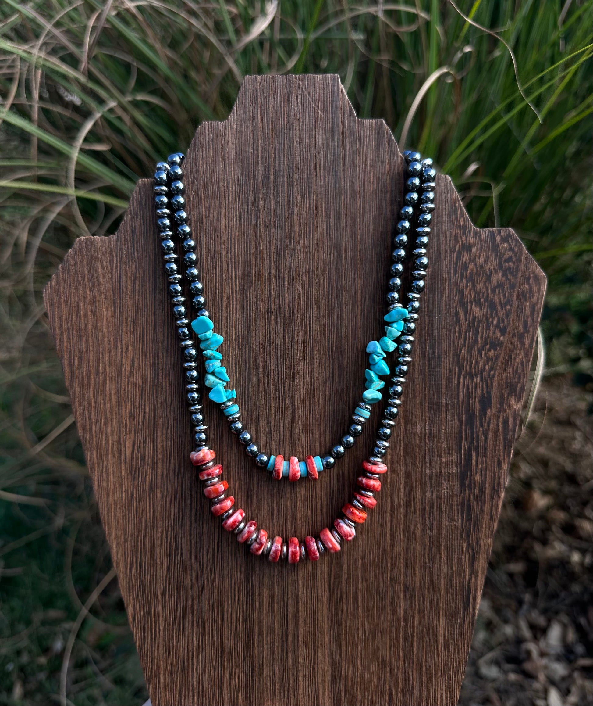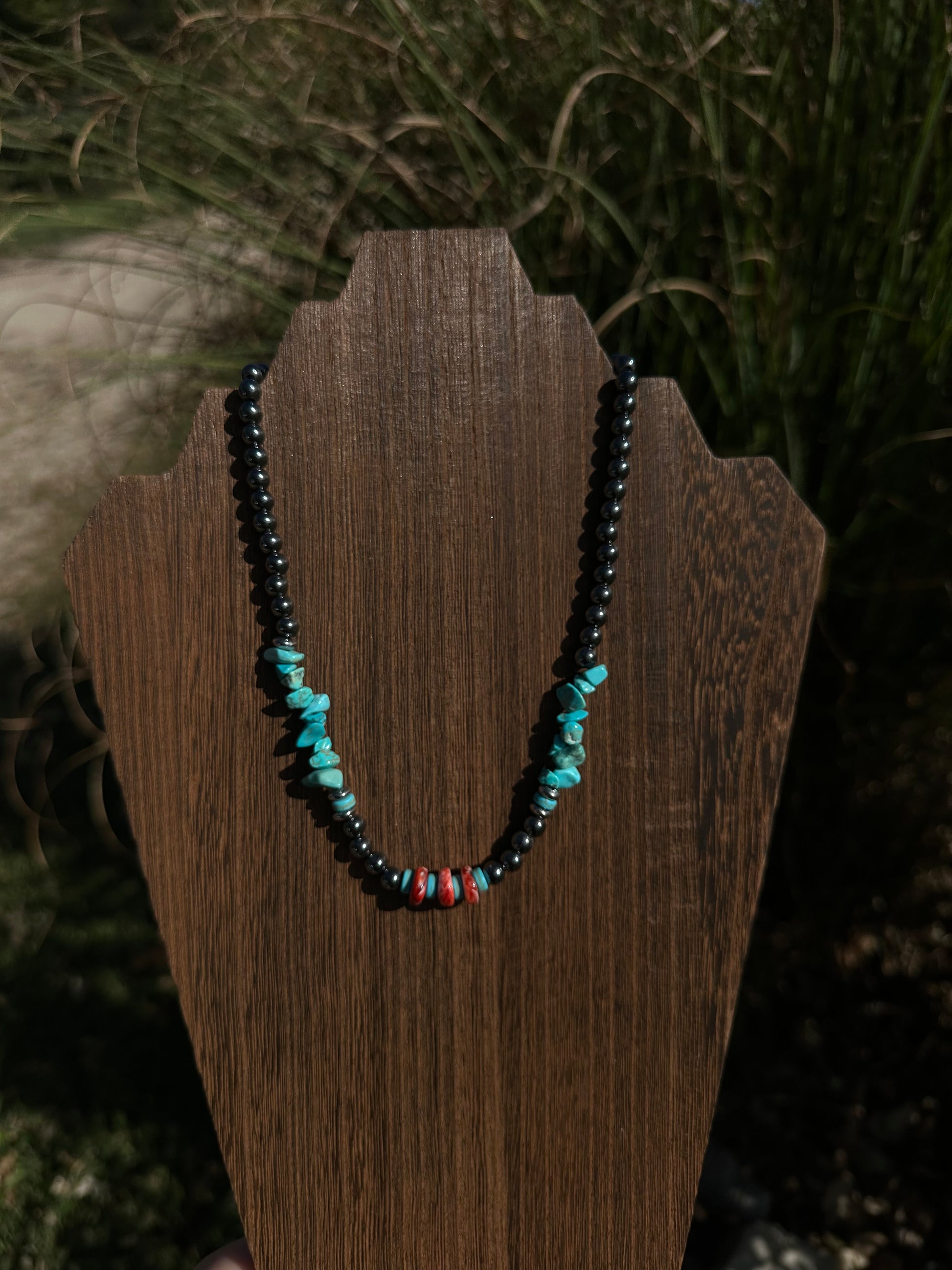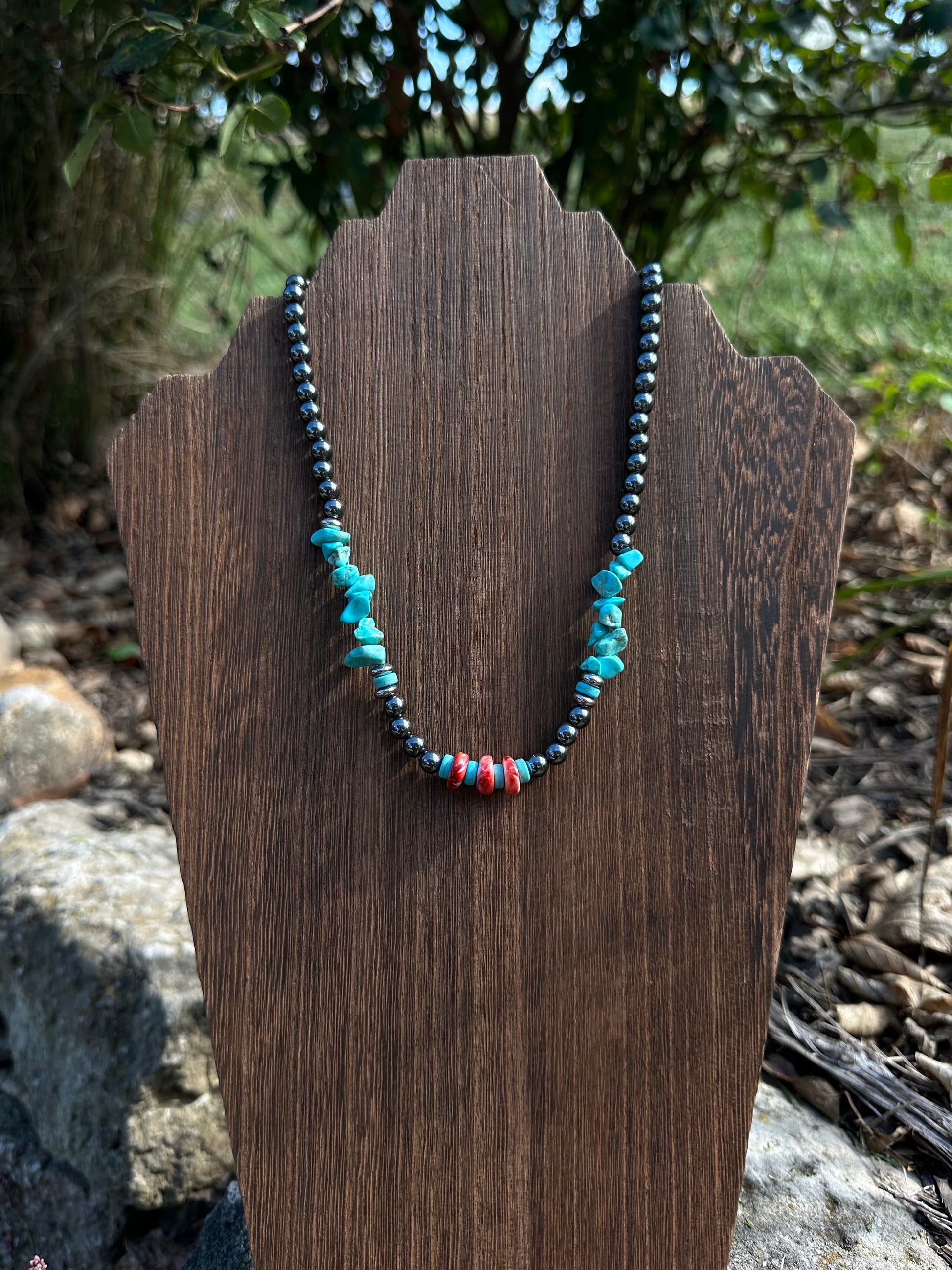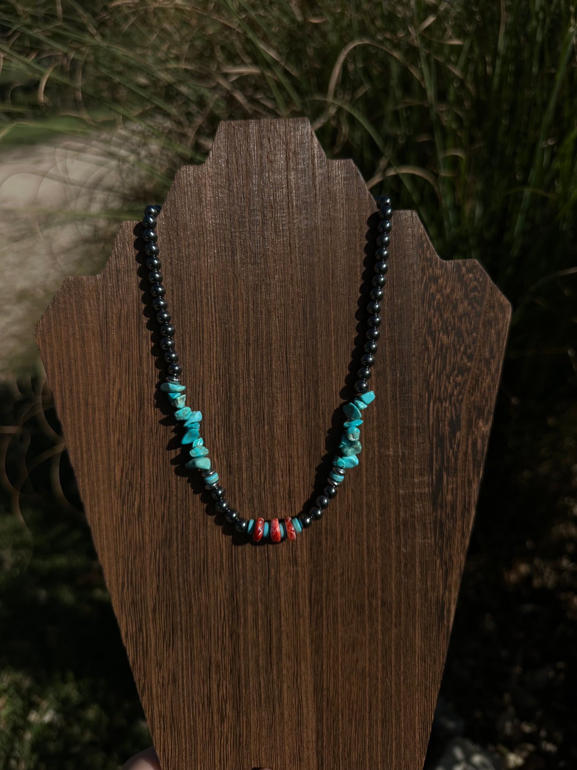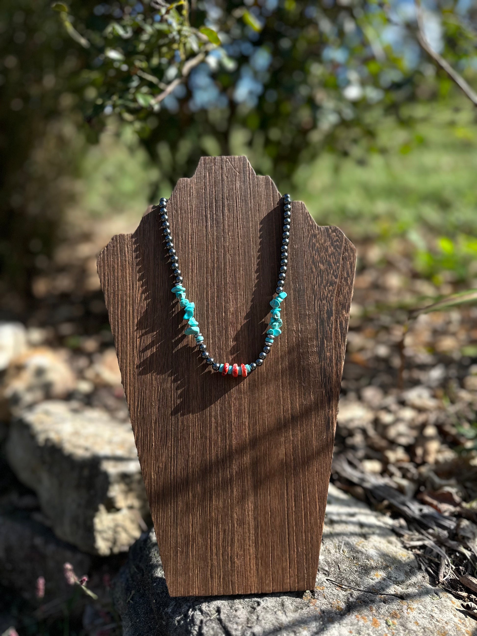 Inspired by desert sunsets and western skies, the Sunset Blues Necklace blends bold turquoise stones with deep red coral and sleek black beads for a striking, earthy look. Each bead is hand-strung with care, creating a unique piece that captures the essence of rustic charm and timeless style.