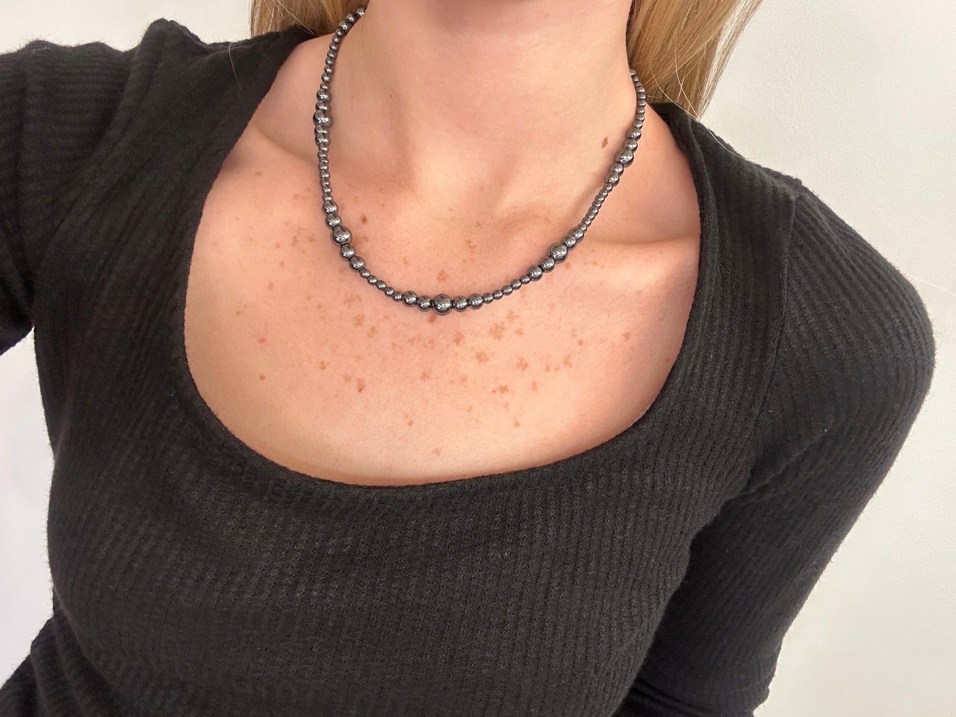 Meet The Midnight Classic, a sleek and timeless hematite choker designed to elevate every outfit. This piece features smooth, glossy hematite beads that catch the light with every move, giving it a subtle shimmer that stands out without being loud. Simple, polished, and effortlessly stylish — this is the necklace you’ll reach for every single day.