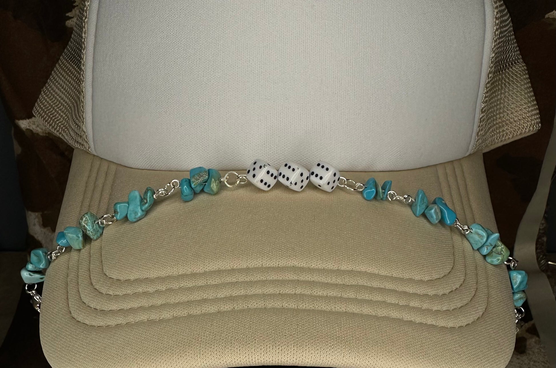 Elevate your western style with the Turquoise Dice Drift hat band — a unique blend of rugged charm and playful detail. This handcrafted hat band features vibrant turquoise wire meticulously wrapped around a sturdy base, highlighting a small white dice centerpiece that adds a subtle, lucky flair to your look.