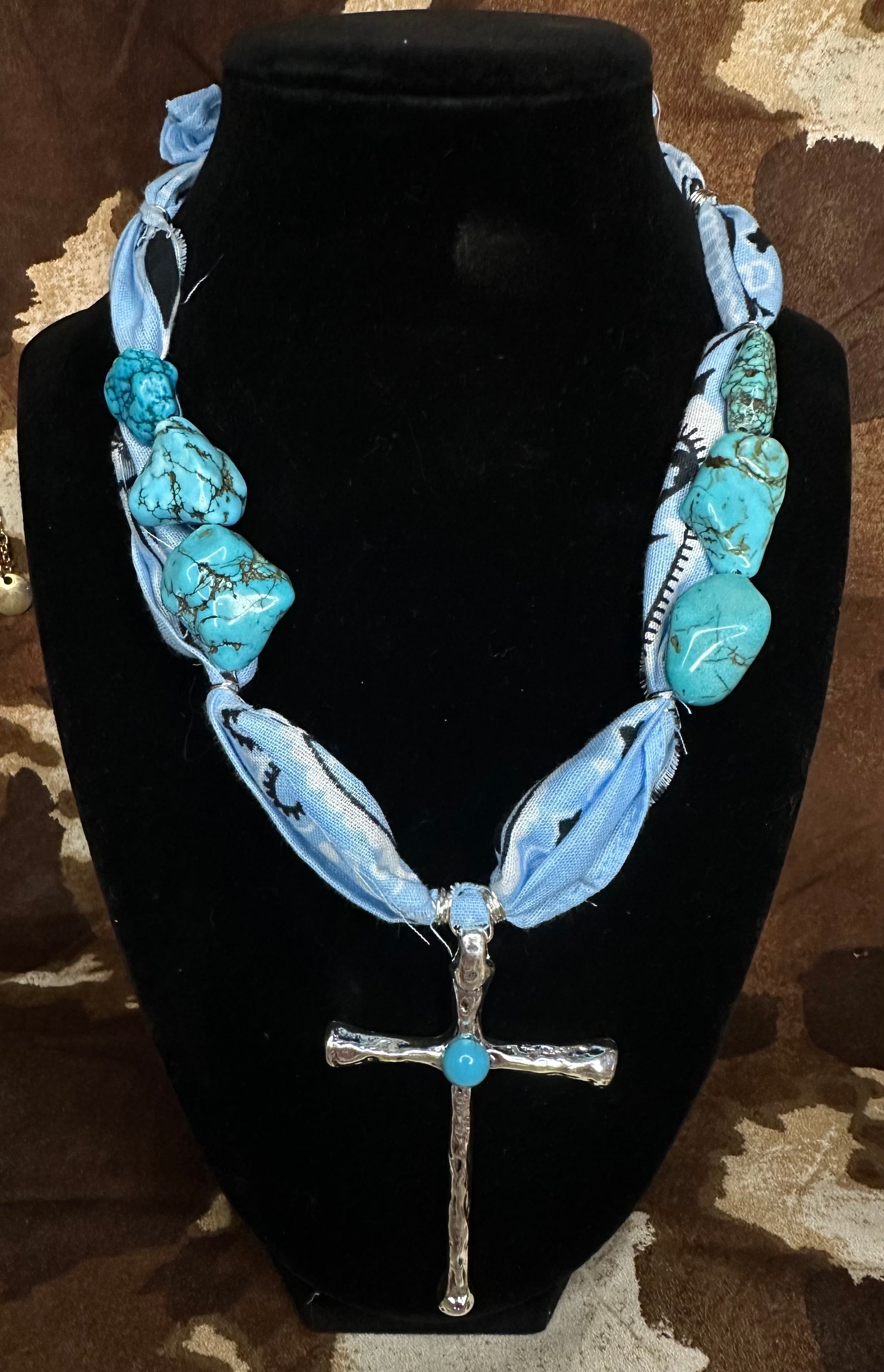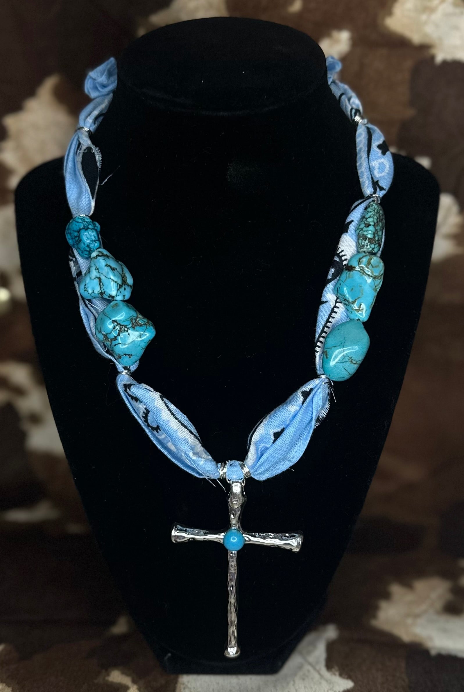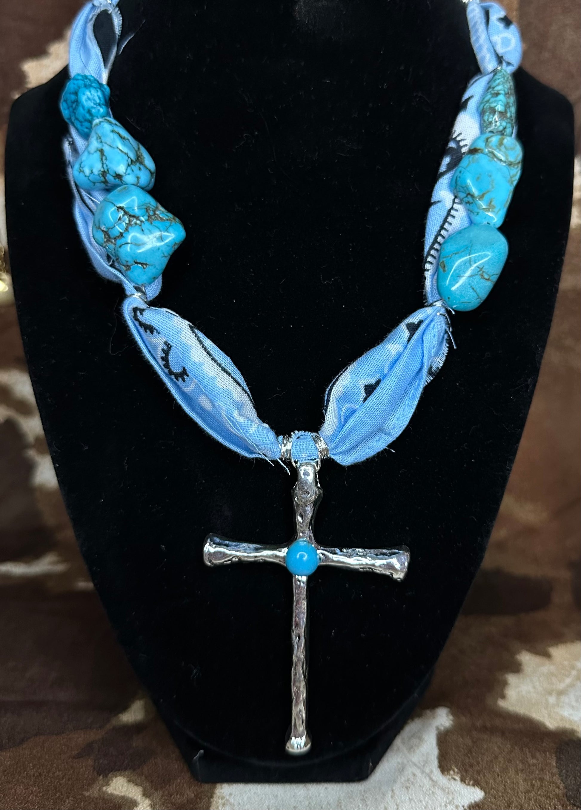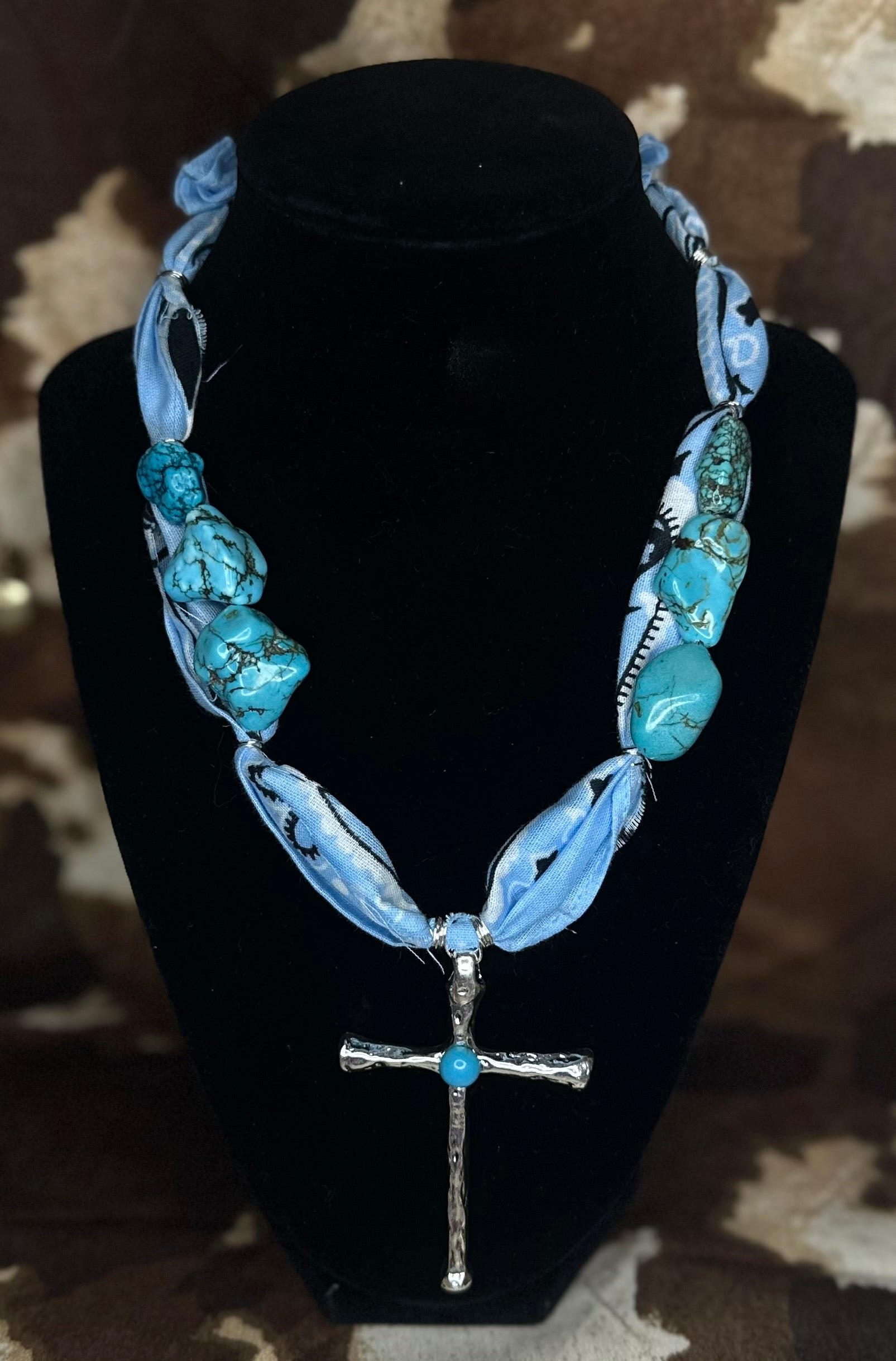 Channel true western spirit with this bold and soulful statement piece. The Dust and Devotion necklace features a soft blue bandana wrap, hand-tied with large turquoise stones and finished with a silver cross inlaid with genuine turquoise. Perfect for cowgirls with grit, grace, and a heart full of faith.