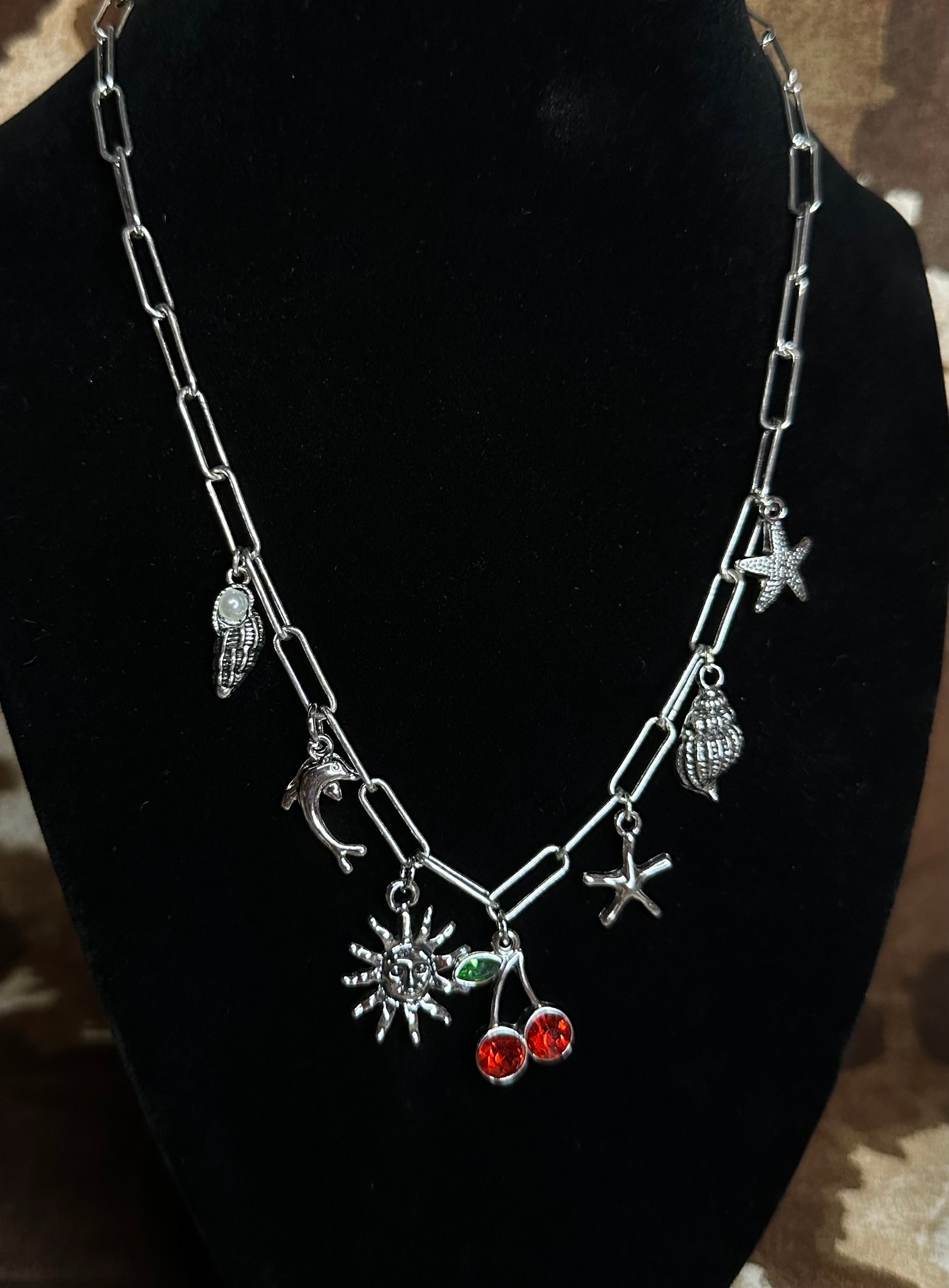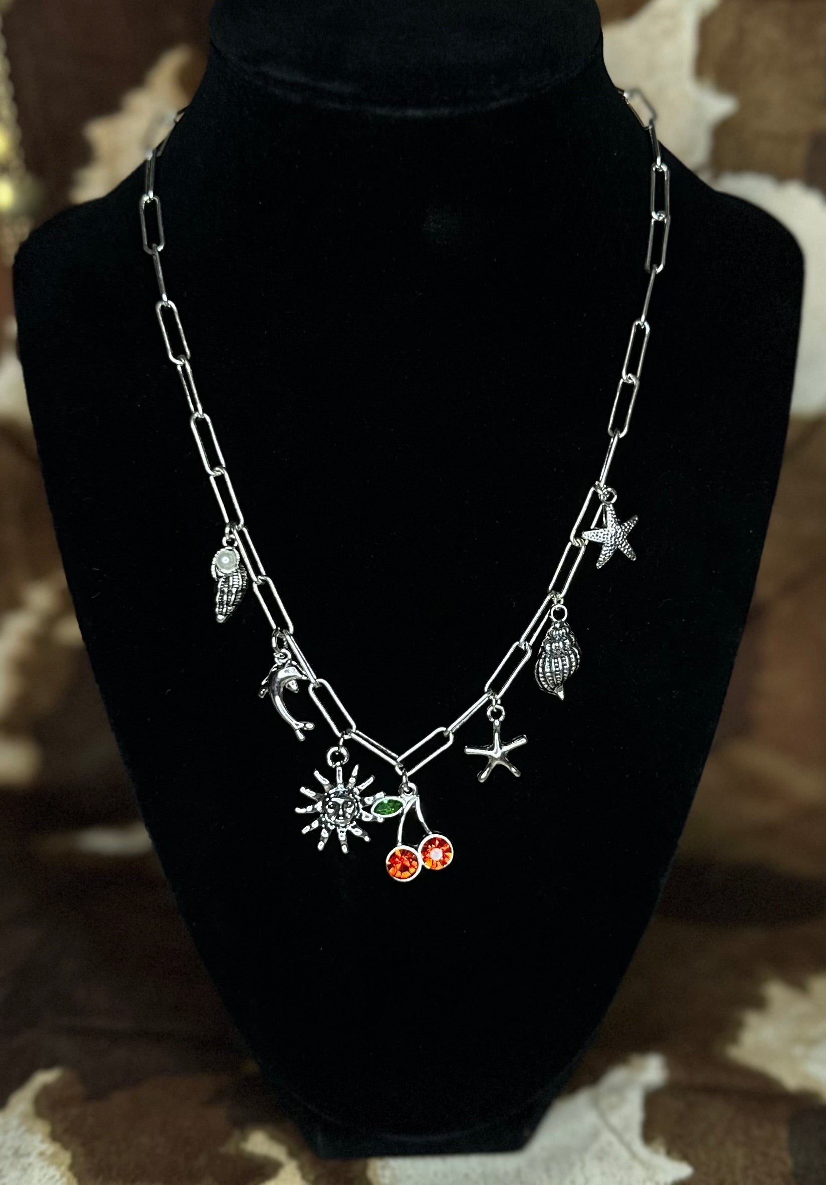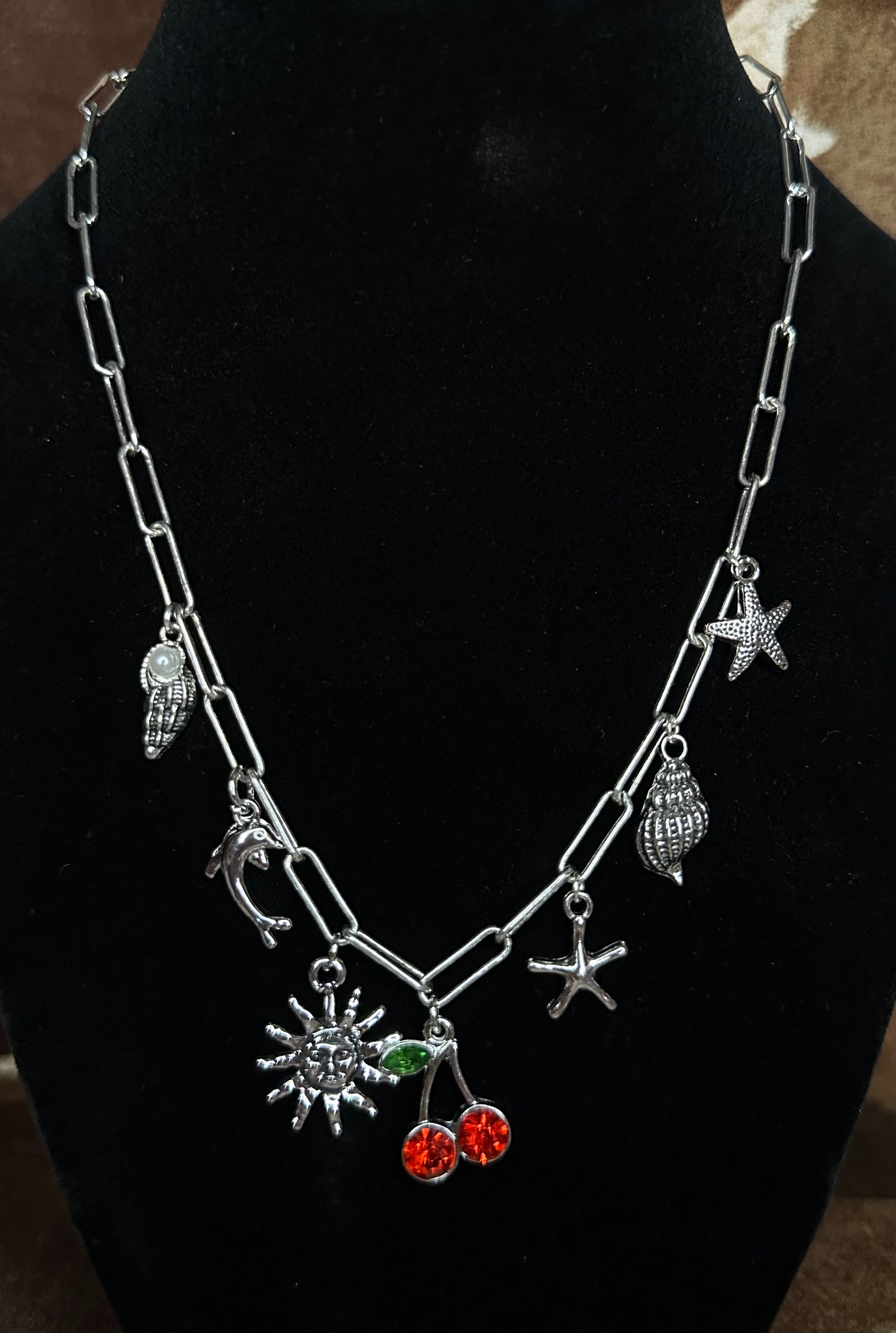 Sweet meets seaside in the Salt & Cherry necklace — a playful piece made for sunshine days and sandy toes. This charm-packed necklace features a bold cherry charm paired with coastal favorites like shells, starfish, and ocean-inspired details. It’s strung on a lightweight chain that’s easy to layer or wear on its own.
