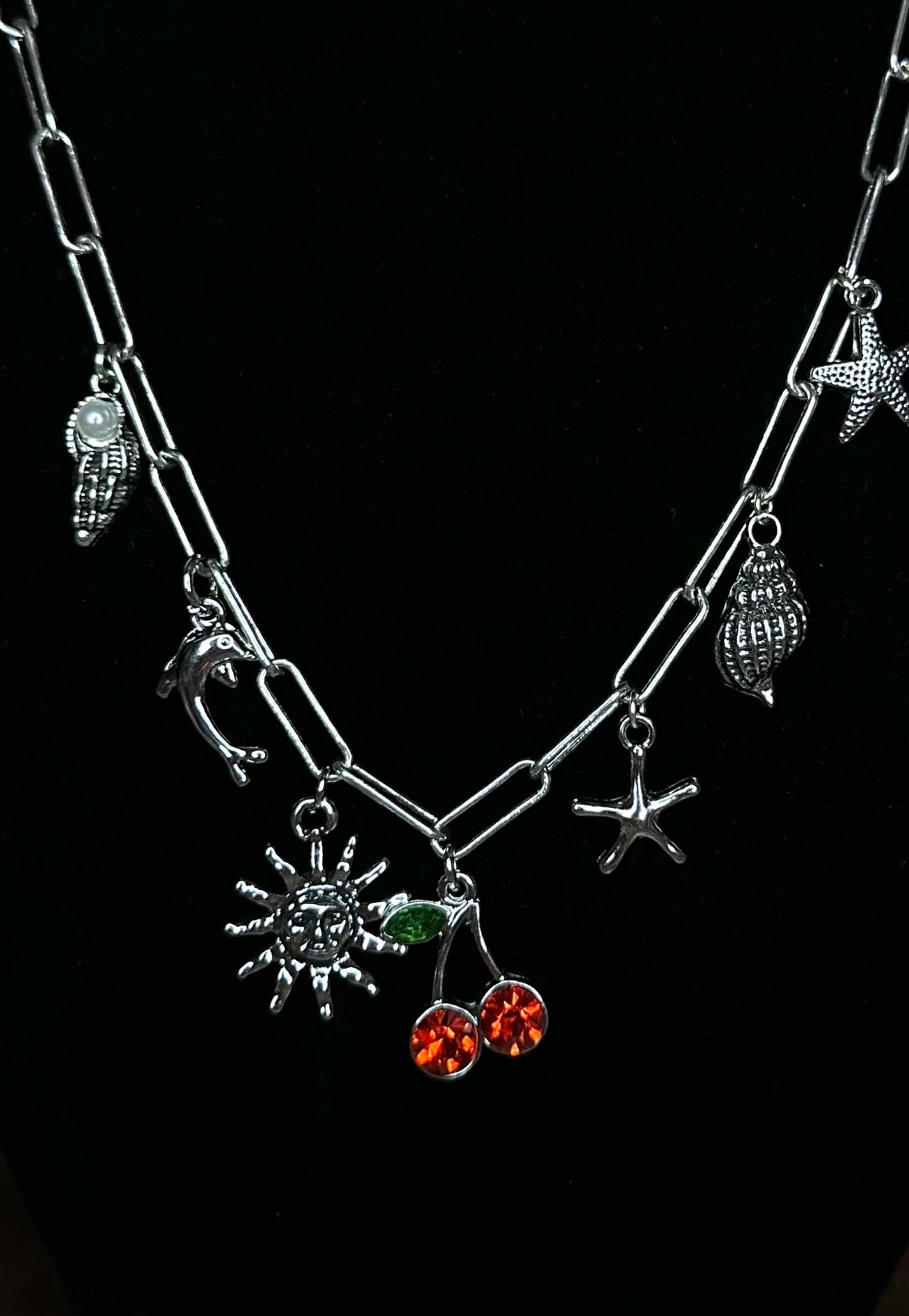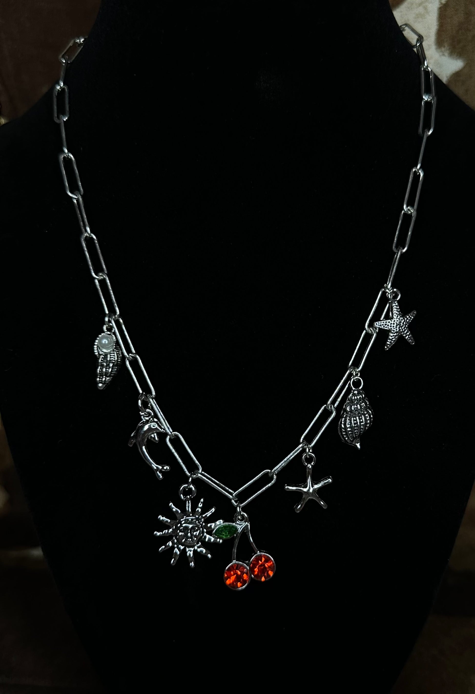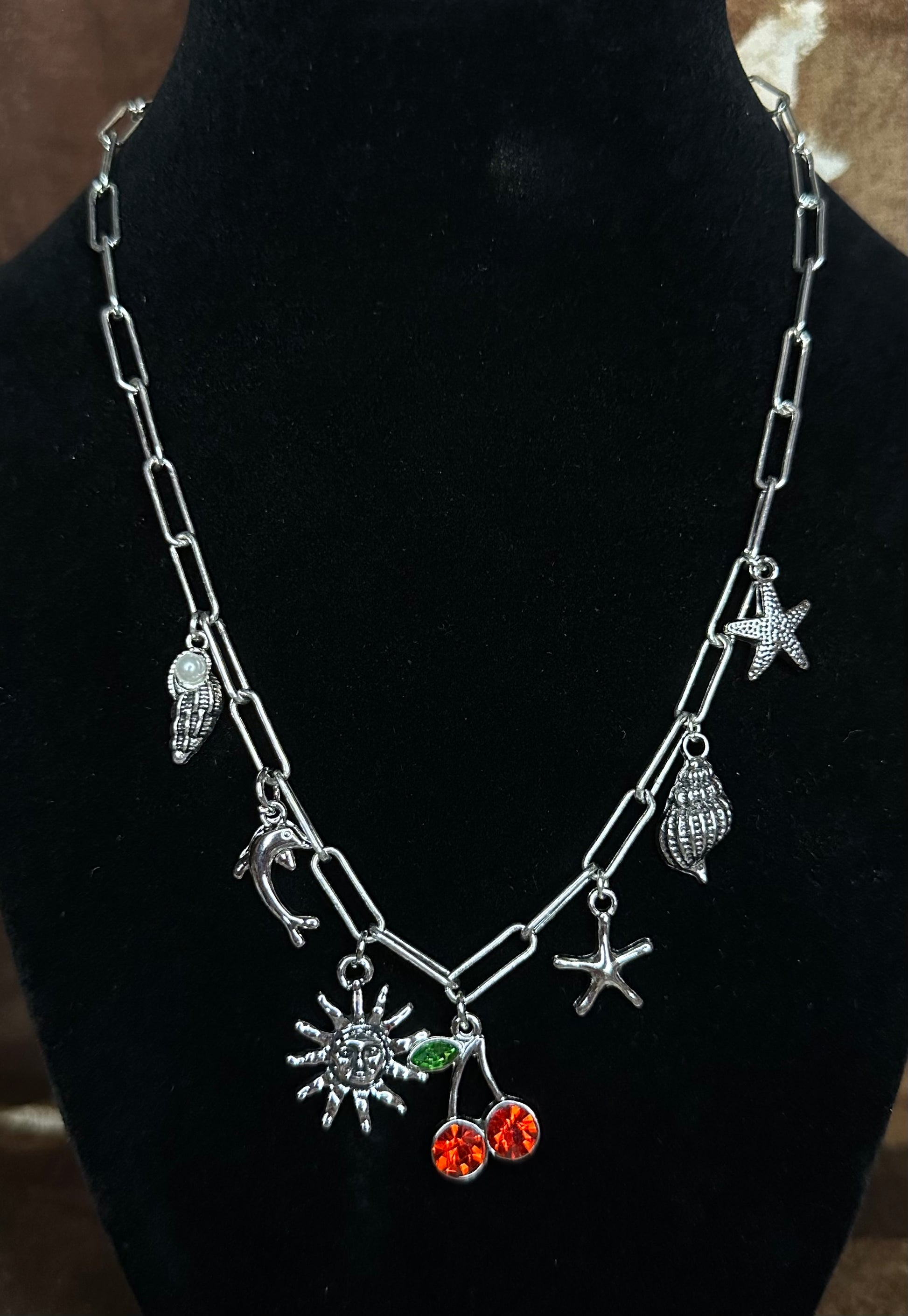 Sweet meets seaside in the Salt & Cherry necklace — a playful piece made for sunshine days and sandy toes. This charm-packed necklace features a bold cherry charm paired with coastal favorites like shells, starfish, and ocean-inspired details. It’s strung on a lightweight chain that’s easy to layer or wear on its own.